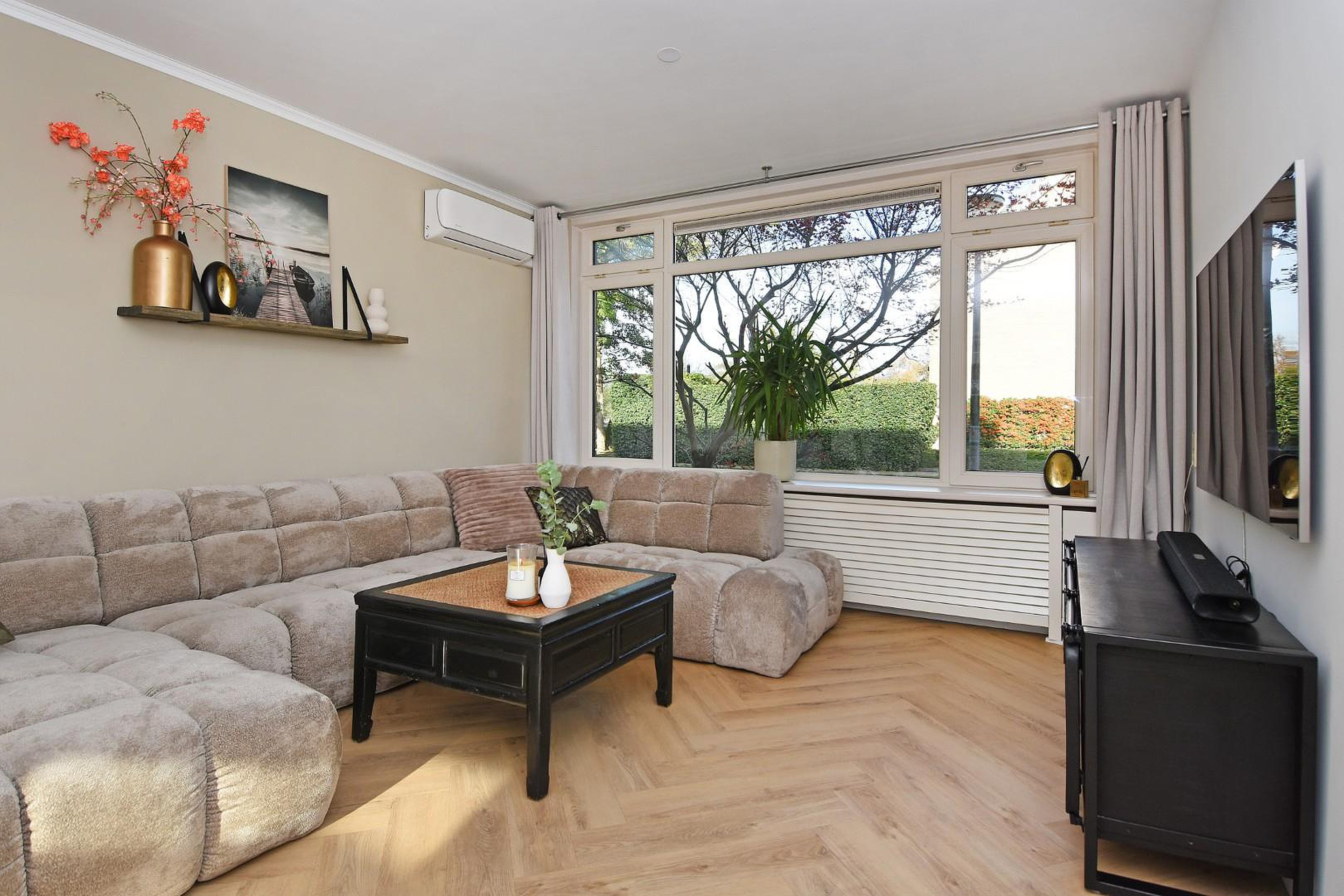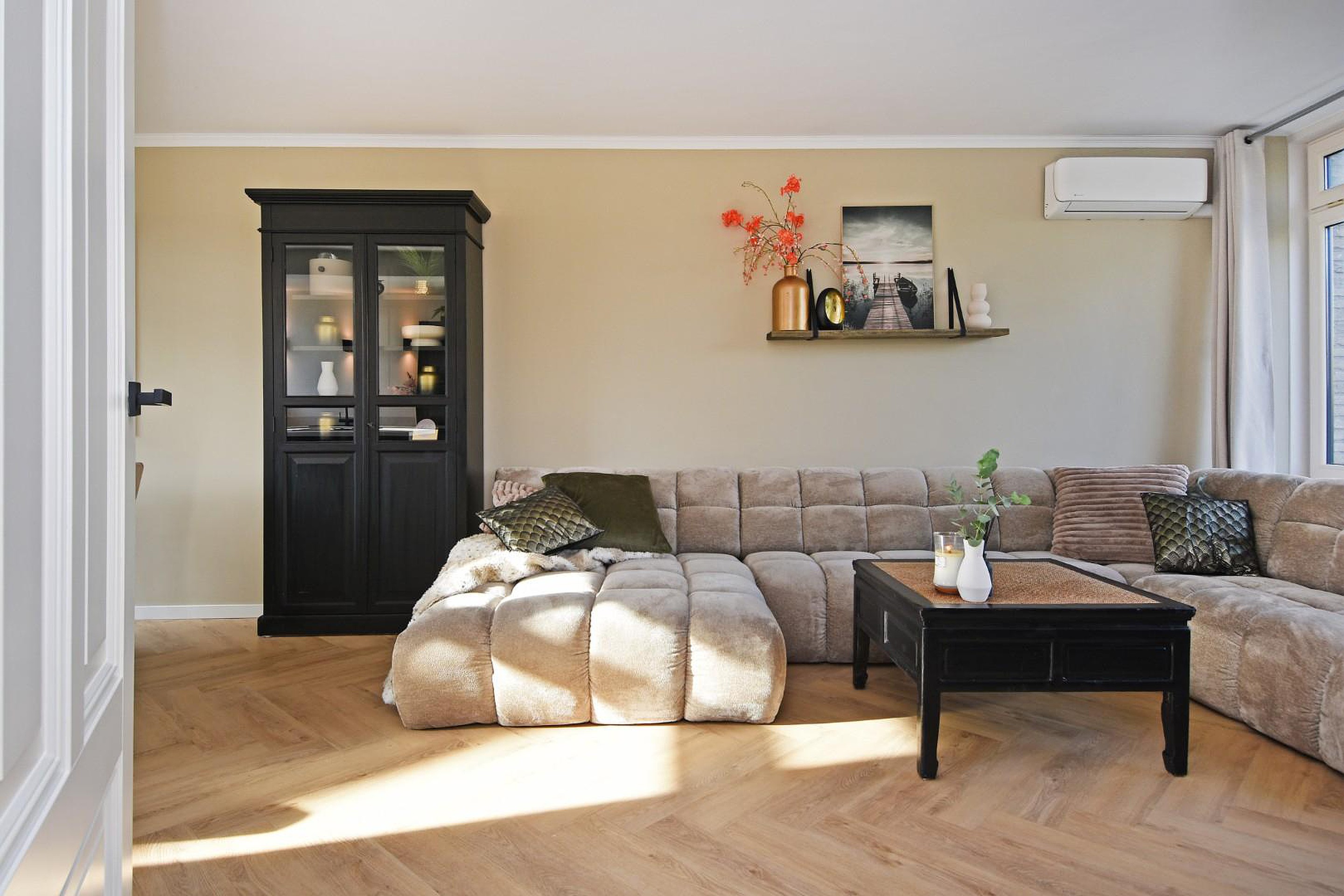 De gehele begane grondvloer is voorzien van een fraaie pvc-vloer in visgraatmotief, compleet met vloerverwarming. Voor de warmere dagen is er in de woonkamer een airconditioning aanwezig, met de buitenunit netjes aan de voorzijde van de woning. Alle wanden en plafonds op deze verdieping zijn glad en strak gestuukt, wat de afwerking ten goede komt.