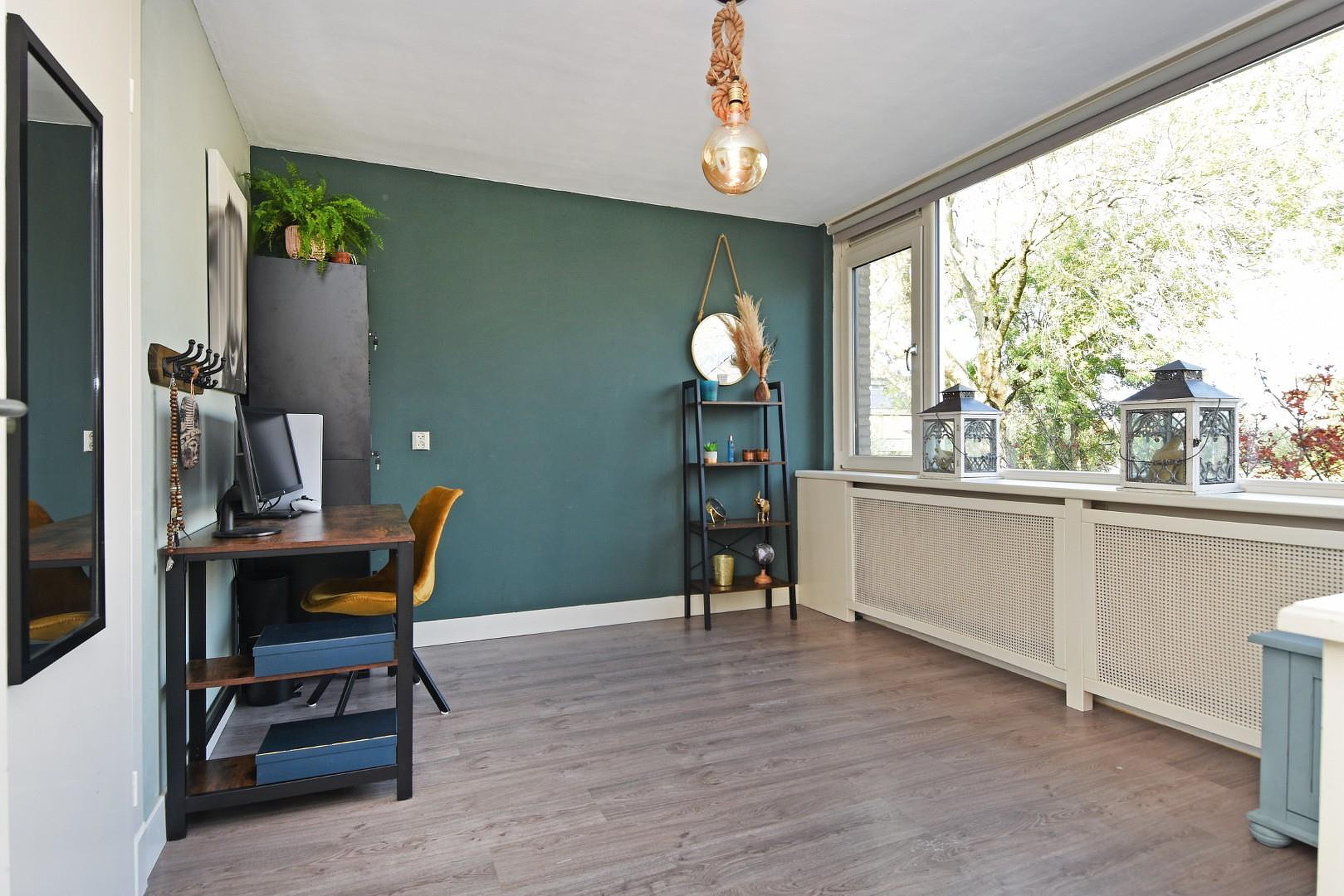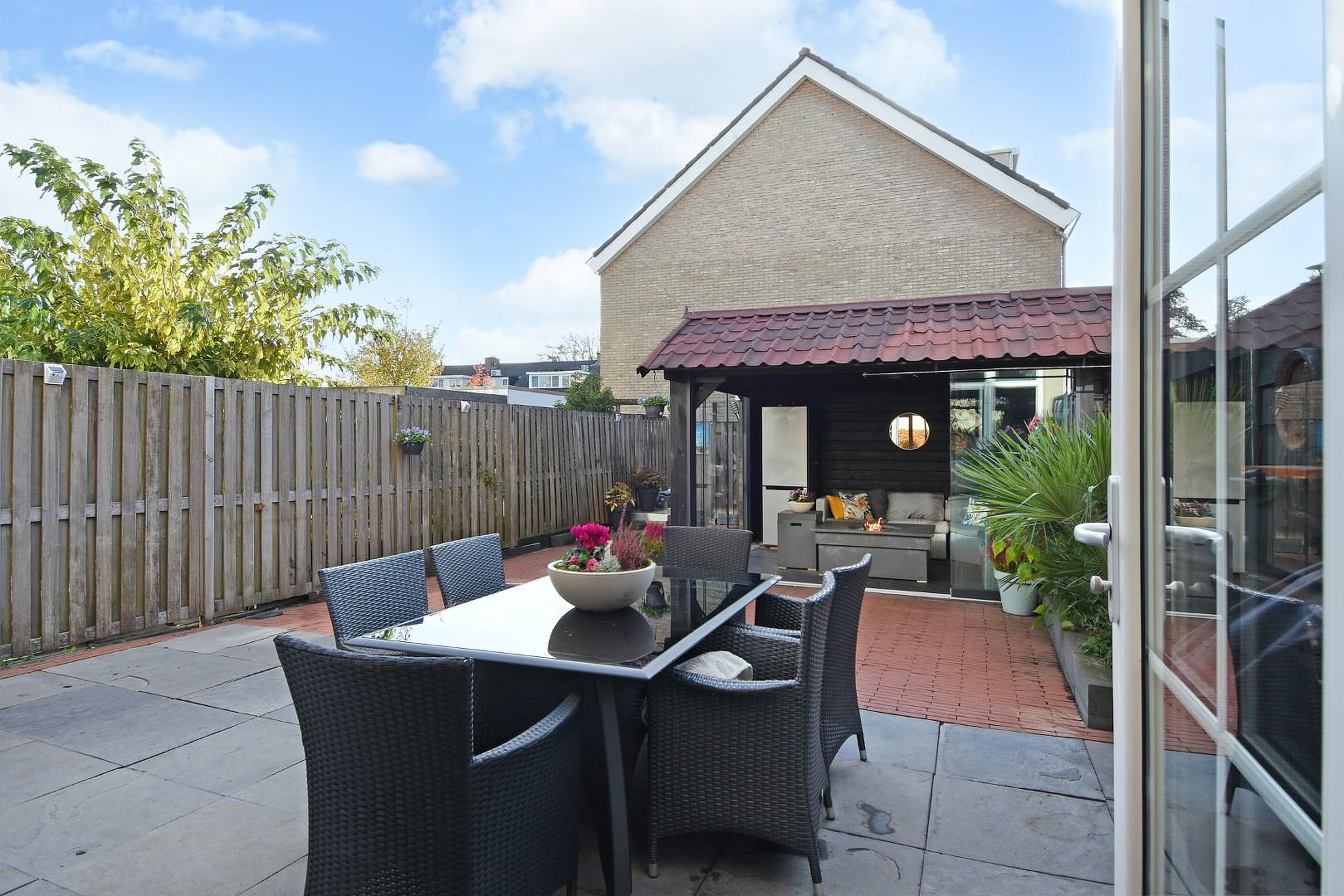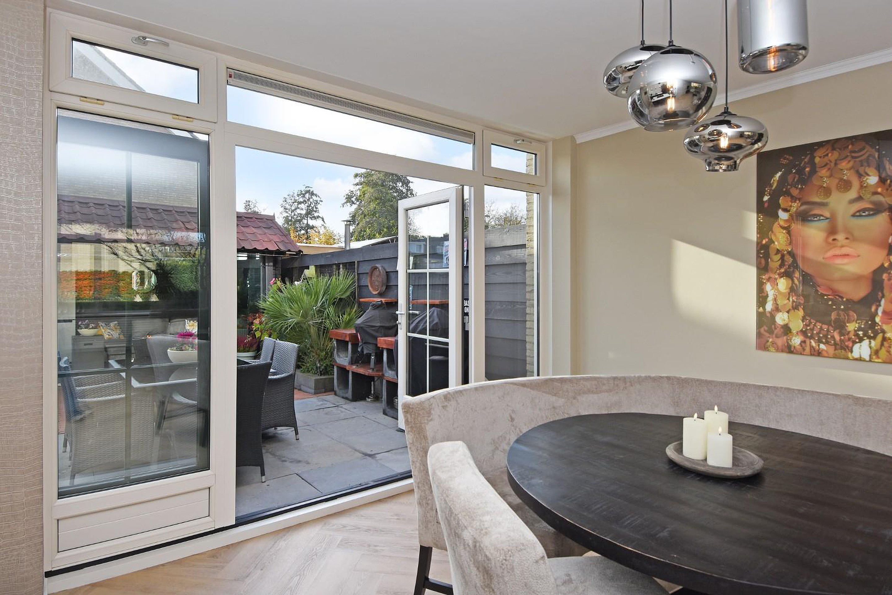 De woonkamer is ruim, licht en, het allerbelangrijkste, staat in directe verbinding met buiten. Via de openslaande deuren loop je zo de zonnige achtertuin op het zuiden in. En daar wacht je een heerlijke verrassing: de gezellige veranda. Dit is de perfecte plek om van de ochtendkoffie tot de late zomeravonden te genieten.