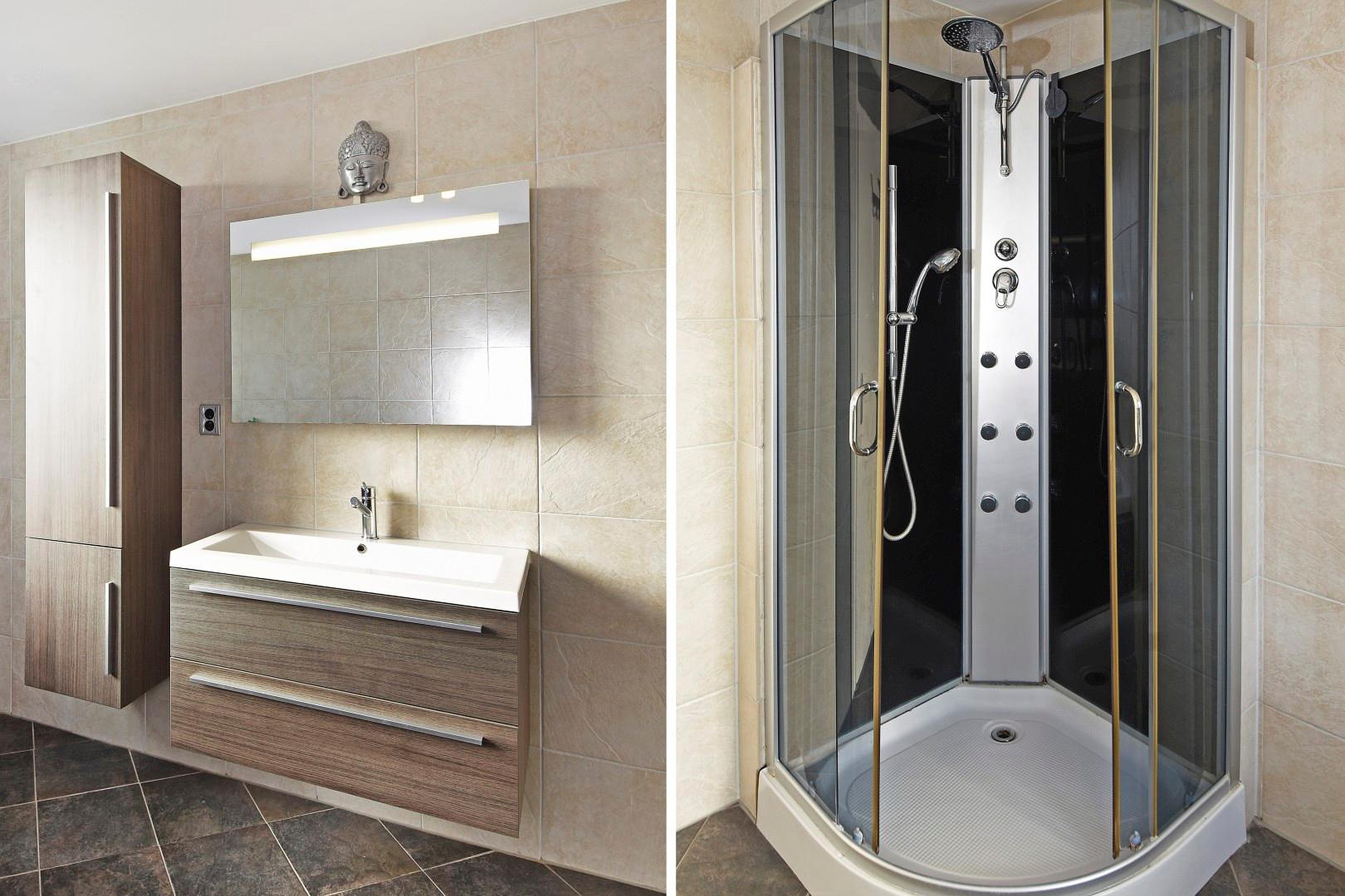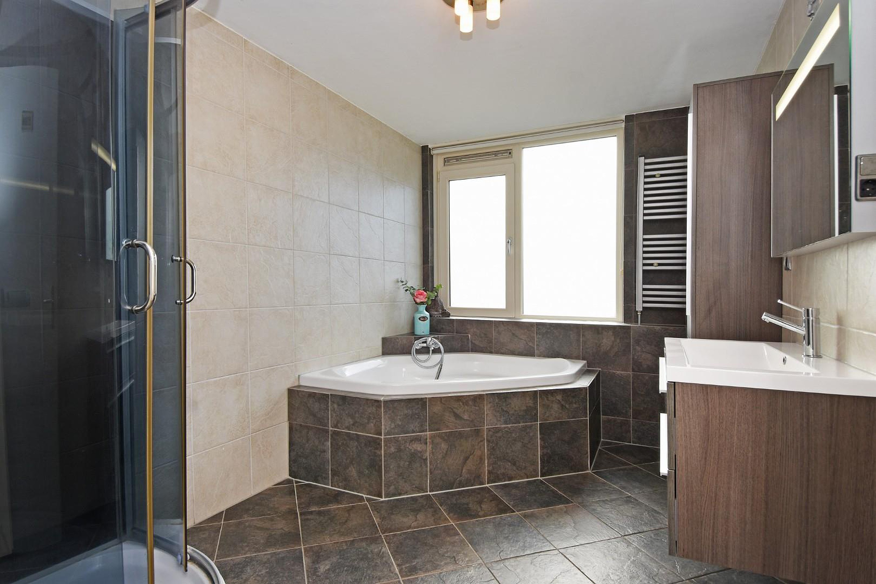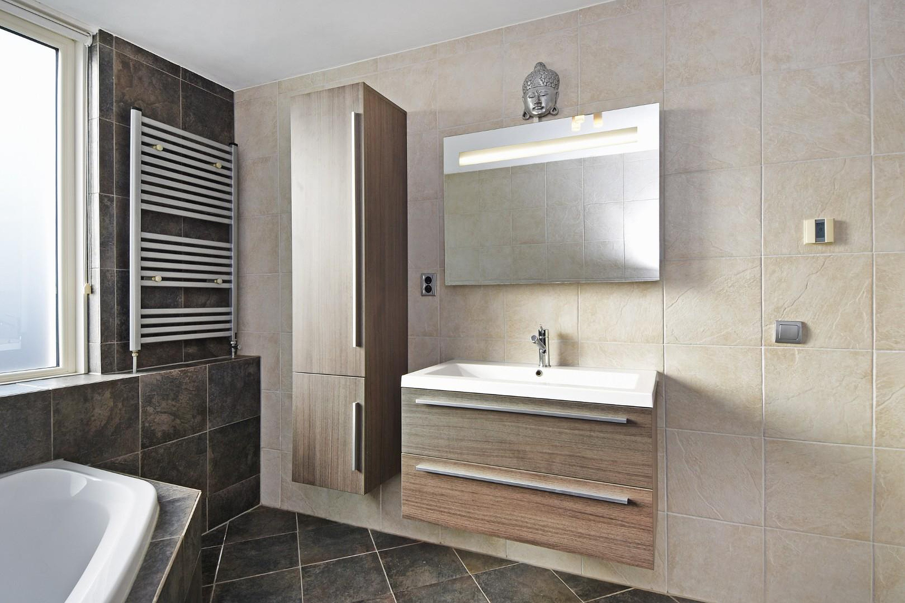 De huidige, riante badkamer is gecreëerd in wat ooit de kleinste slaapkamer was. Deze is compleet uitgevoerd met een douchecabine, een ligbad en een modern wastafelmeubel, en is voorzien van comfortabele vloerverwarming.
