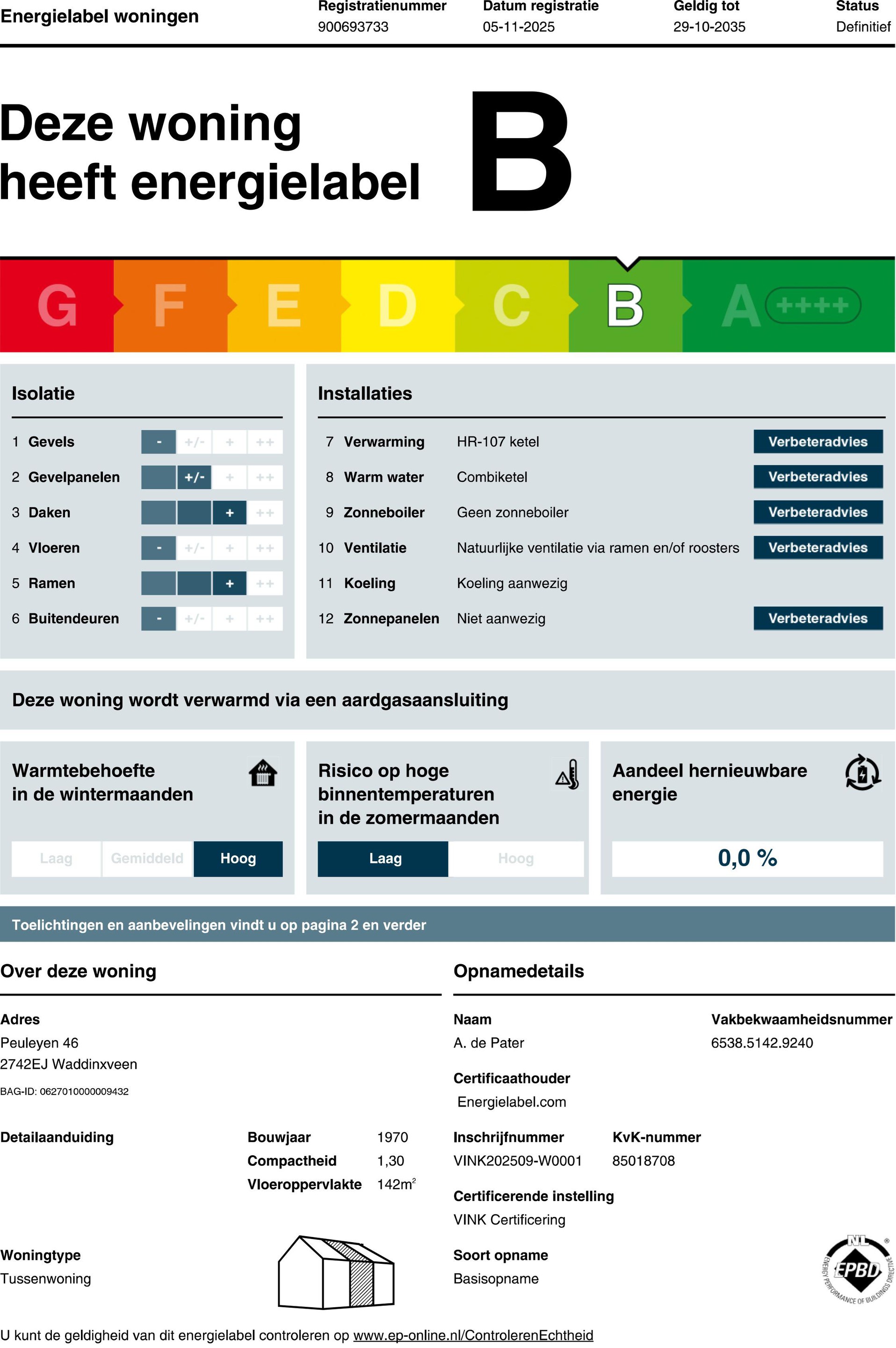 Details De woning is goed onderhouden en voorzien van duurzame elementen. Zo zijn de kunststof gevelkozijnen met HR++ glas in 2009 geplaatst; draaikiepramen zijn voorzien van horren. Het dak is in 2016 volledig geïsoleerd met glaswol en de begane grondvloer is voorzien van vloerverwarming. Aan de achterzijde zorgt een elektrisch bedienbaar zonnescherm, samen met de airco voor verkoeling. Voorbereidingen voor de toekomst zijn getroffen, want de groepenkast is reeds voorzien van een 3-fase aansluiting.