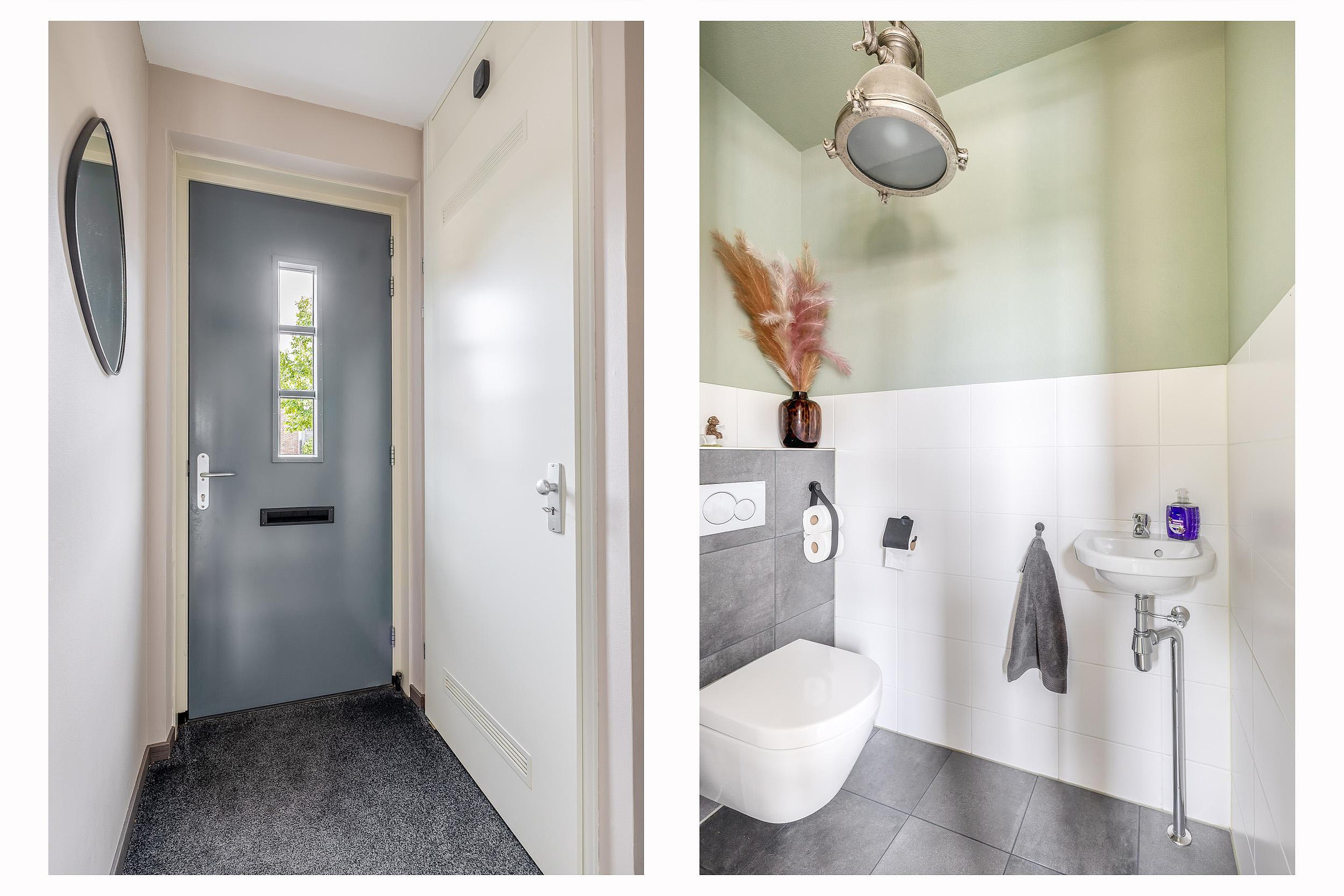 Begane grond Bij binnenkomst valt direct de lichte hal op, voorzien van garderoberuimte, meterkast en een toilet met zwevend closet en fonteintje. Vanuit hier kom je via een zwarte houten deur in de keuken.