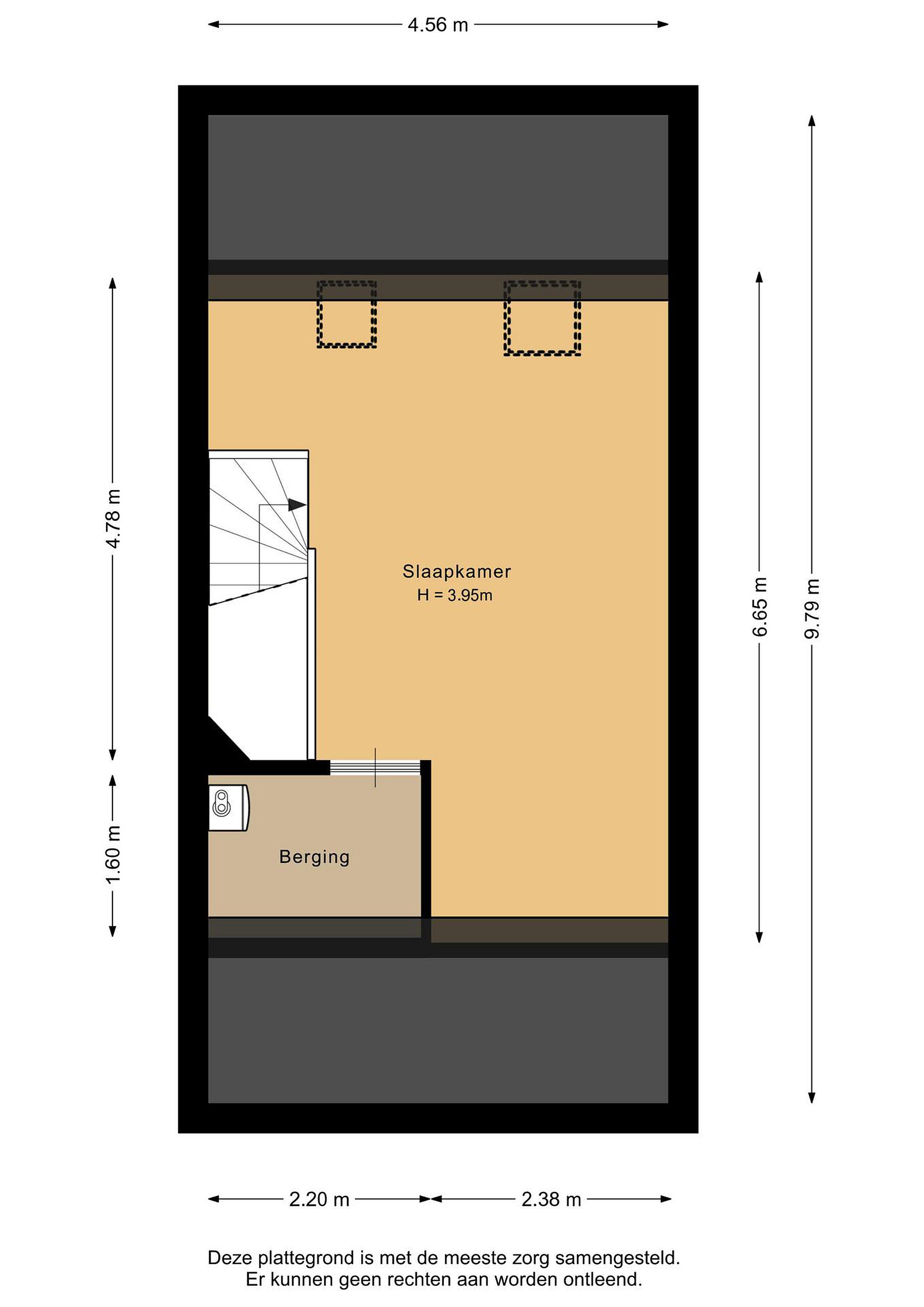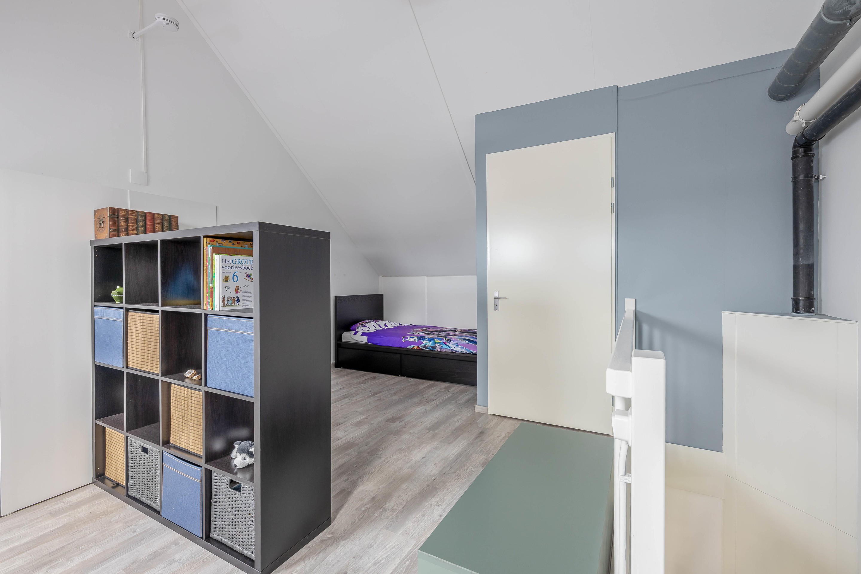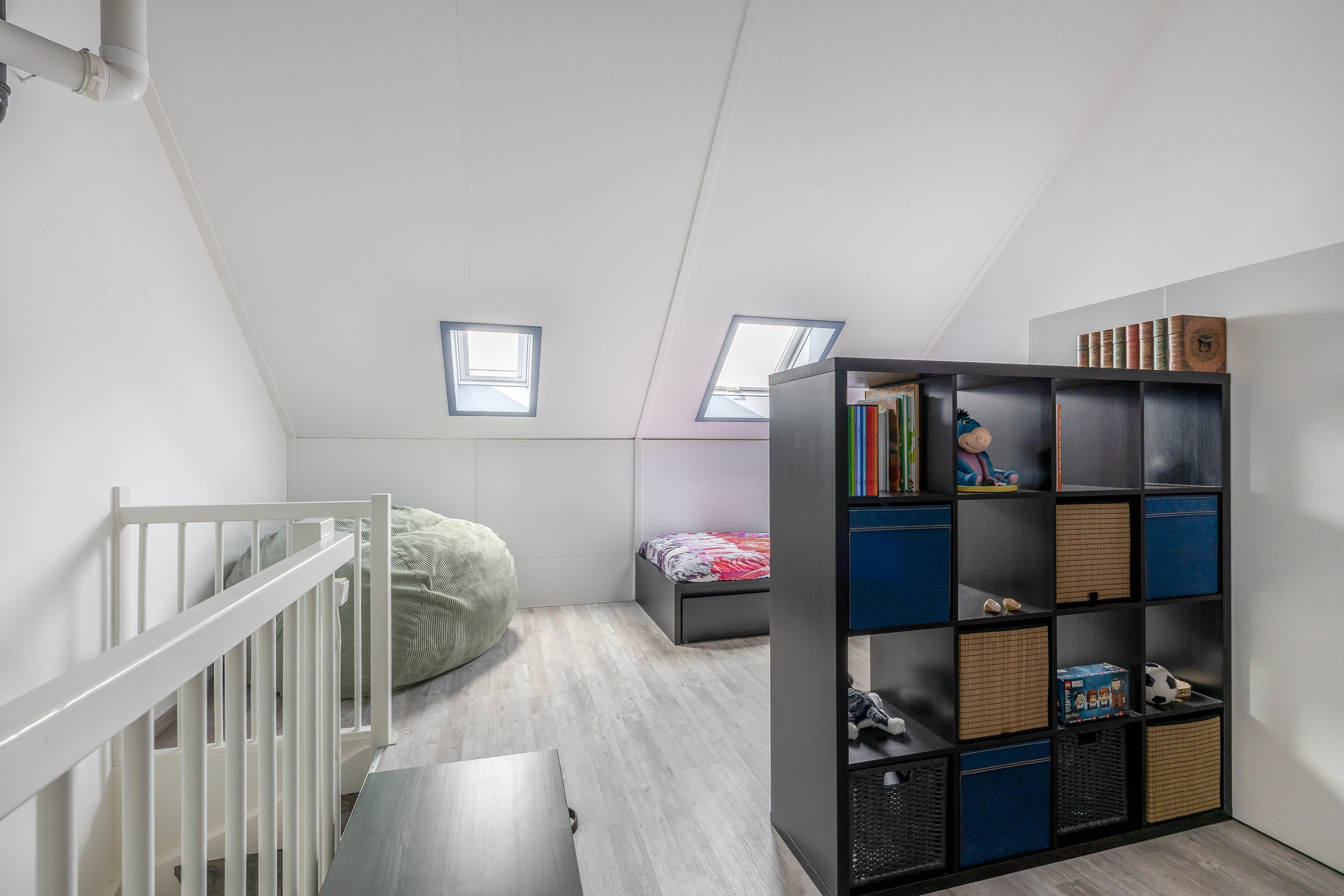 Tweede verdieping De zolderverdieping is momenteel in gebruik als volwaardige derde slaapkamer. Dankzij de twee dakramen komt er veel daglicht binnen. De ruimte heeft een hoogte tot bijna 4 meter en biedt volop mogelijkheden voor het creëren van een extra werkhoek of zelfs het splitsen in twee kamers. Achterin bevindt zich een nette afgesloten was-/technische ruimte met opstelling voor de CV-ketel en wasmachine/droger.