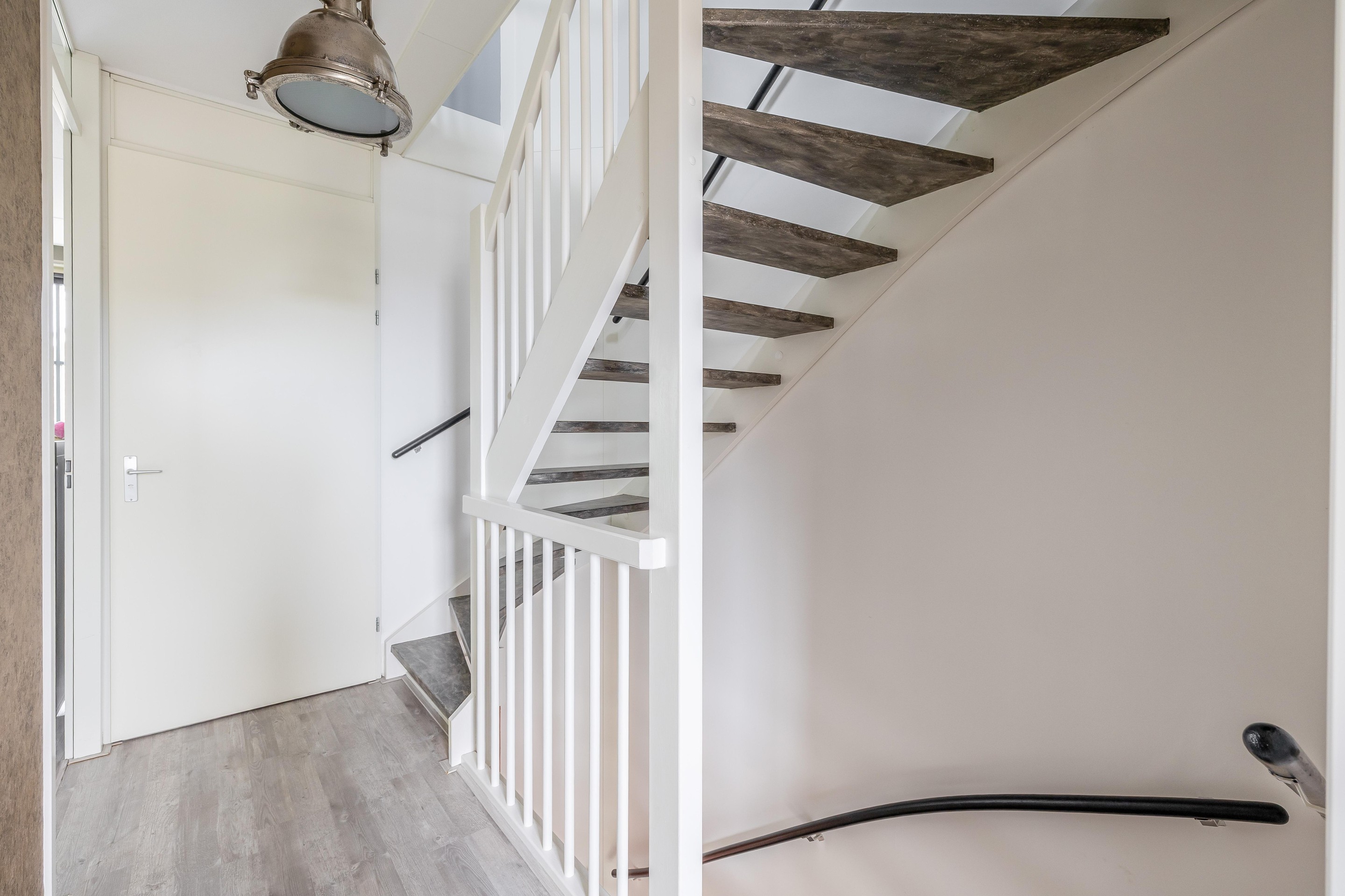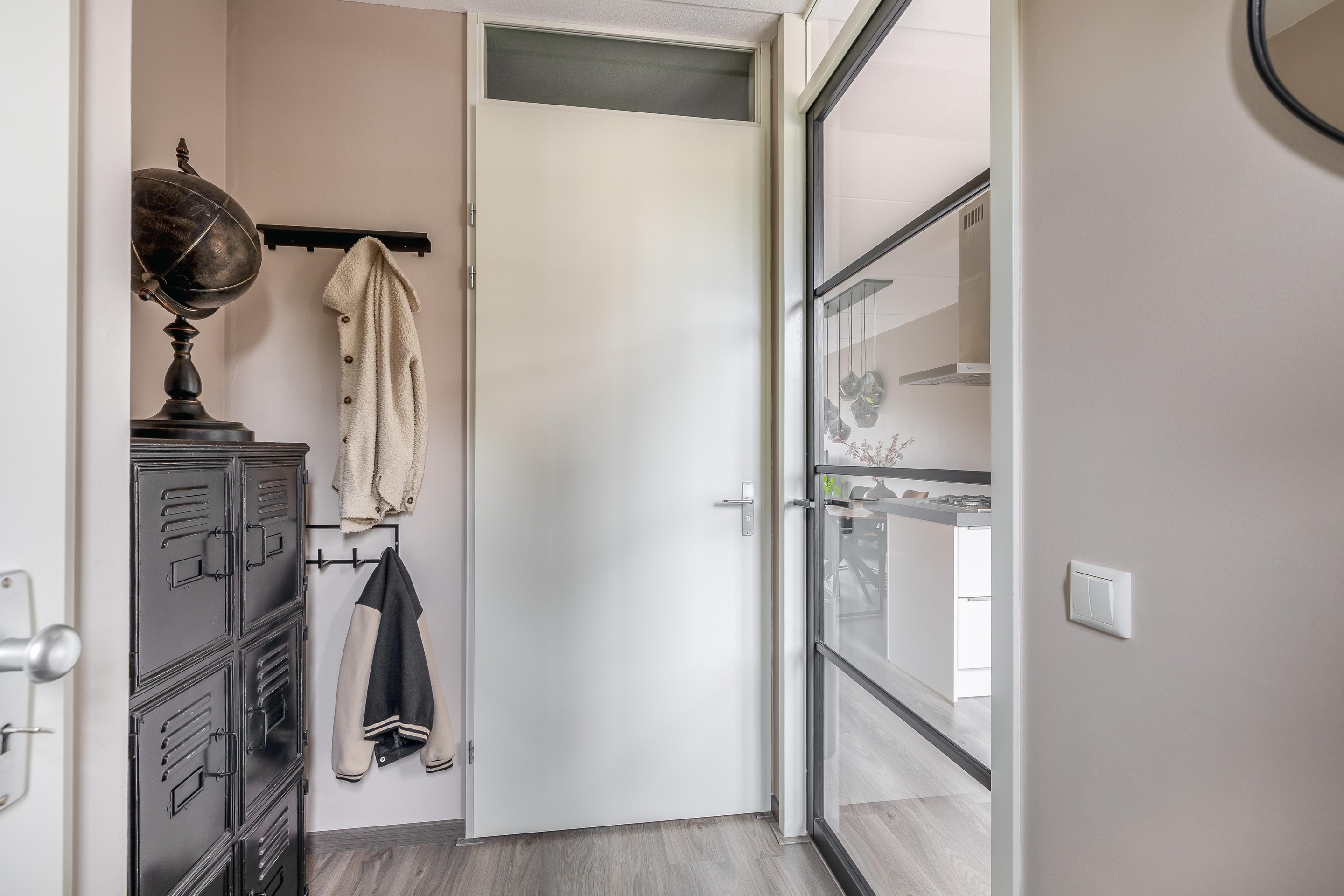 Begane grond Bij binnenkomst valt direct de lichte hal op, voorzien van garderoberuimte, meterkast en een toilet met zwevend closet en fonteintje. Vanuit hier kom je via een zwarte houten deur in de keuken.