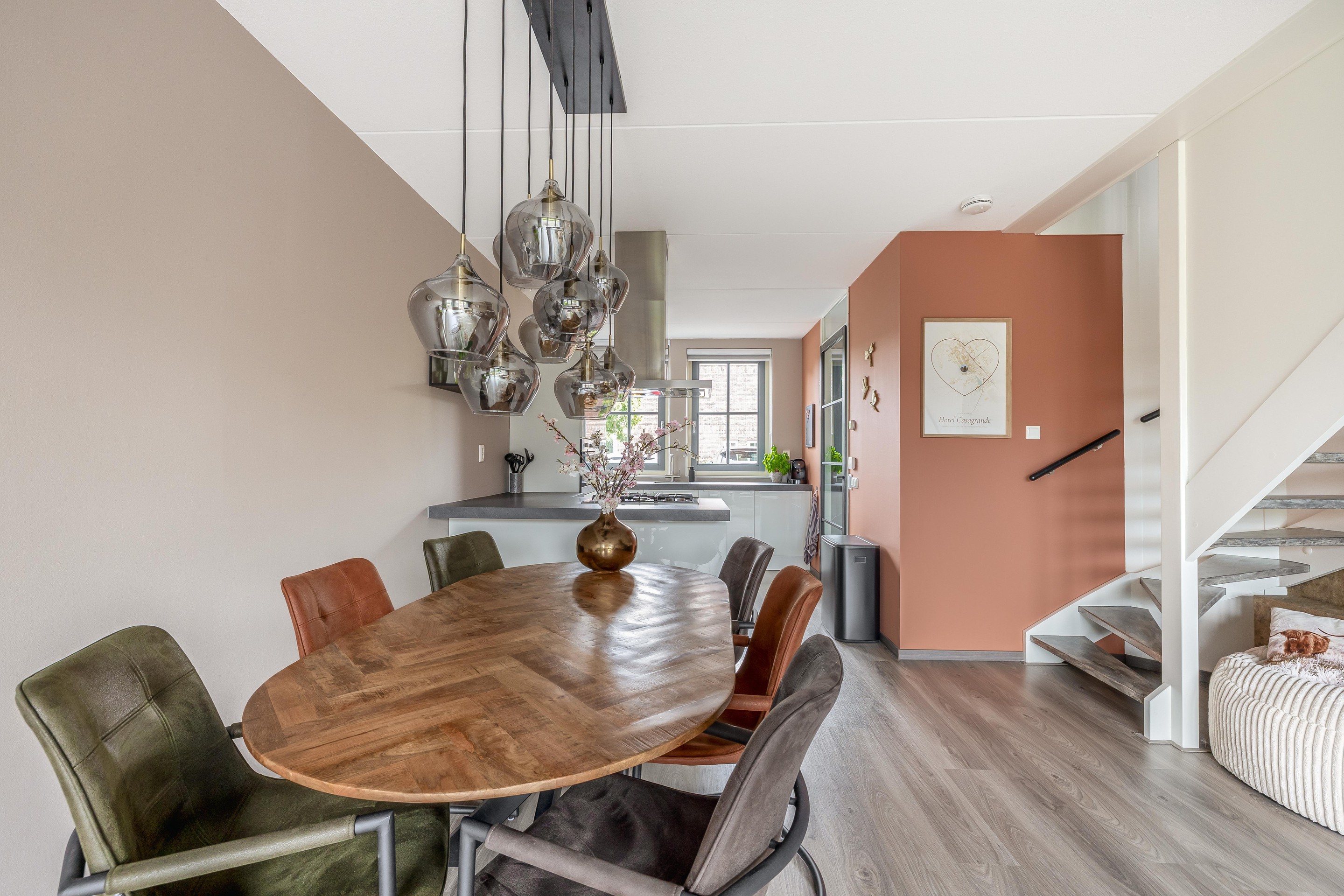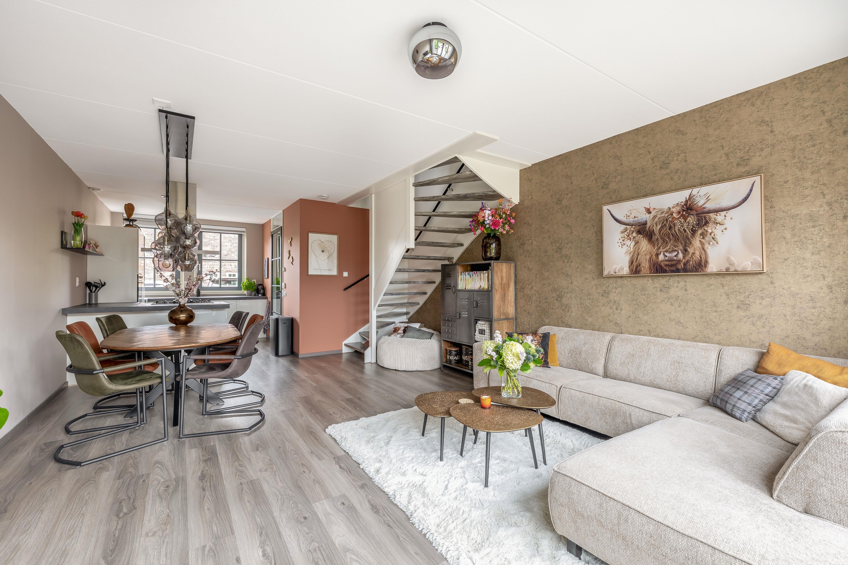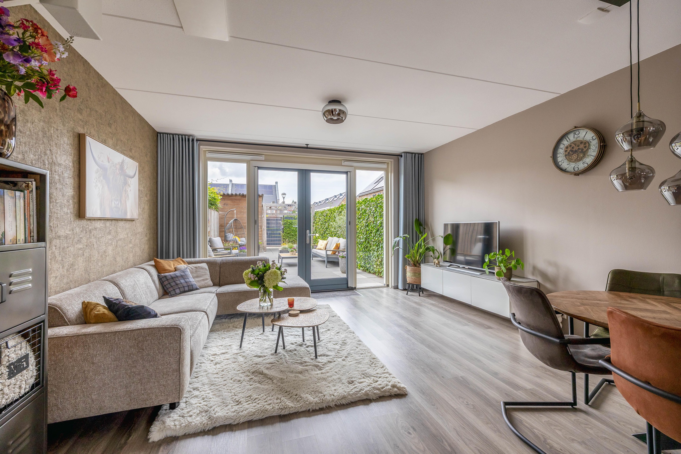 De woon- en eetkamer aan de achterzijde is verrassend ruim en dankzij de grote raampartijen en dubbele openslaande deuren ook heerlijk licht. De laminaatvloer met vloerverwarming loopt drempelloos door en vormt een warme, neutrale basis.