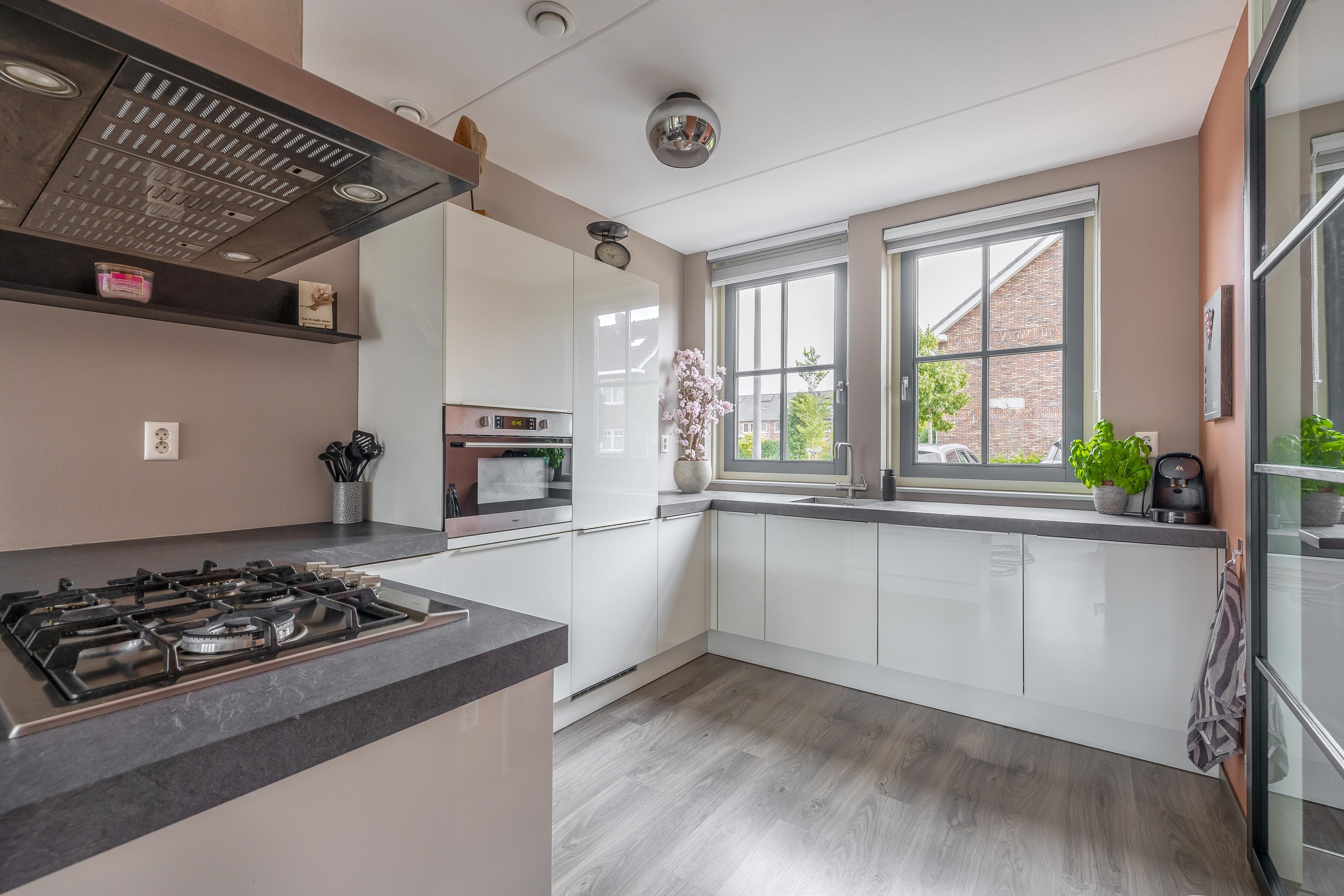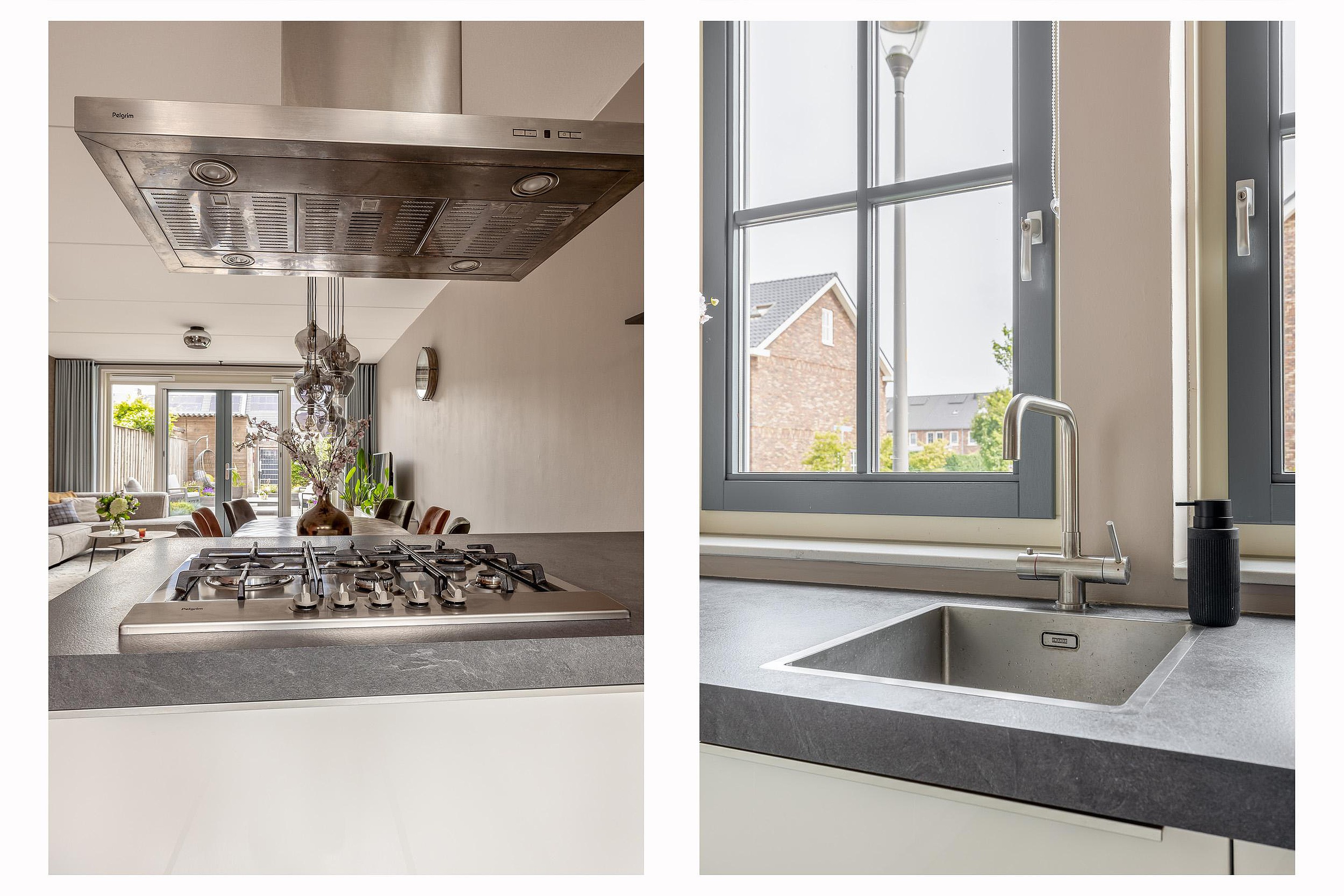 De open keuken is gelegen aan de voorzijde van de woning en biedt uitzicht op de rustige straat. Dankzij het U-vormige keukenblok is er volop werk- en bergruimte. De keuken is van het merk Bruynzeel en voorzien van luxe inbouwapparatuur zoals een 5-pits gaskookplaat, combi-oven (Pelgrim), koel-vriescombinatie en een Franke kokend waterkraan. Het donkere werkblad en de hoogglans witte fronten zorgen voor een strak, tijdloos geheel.