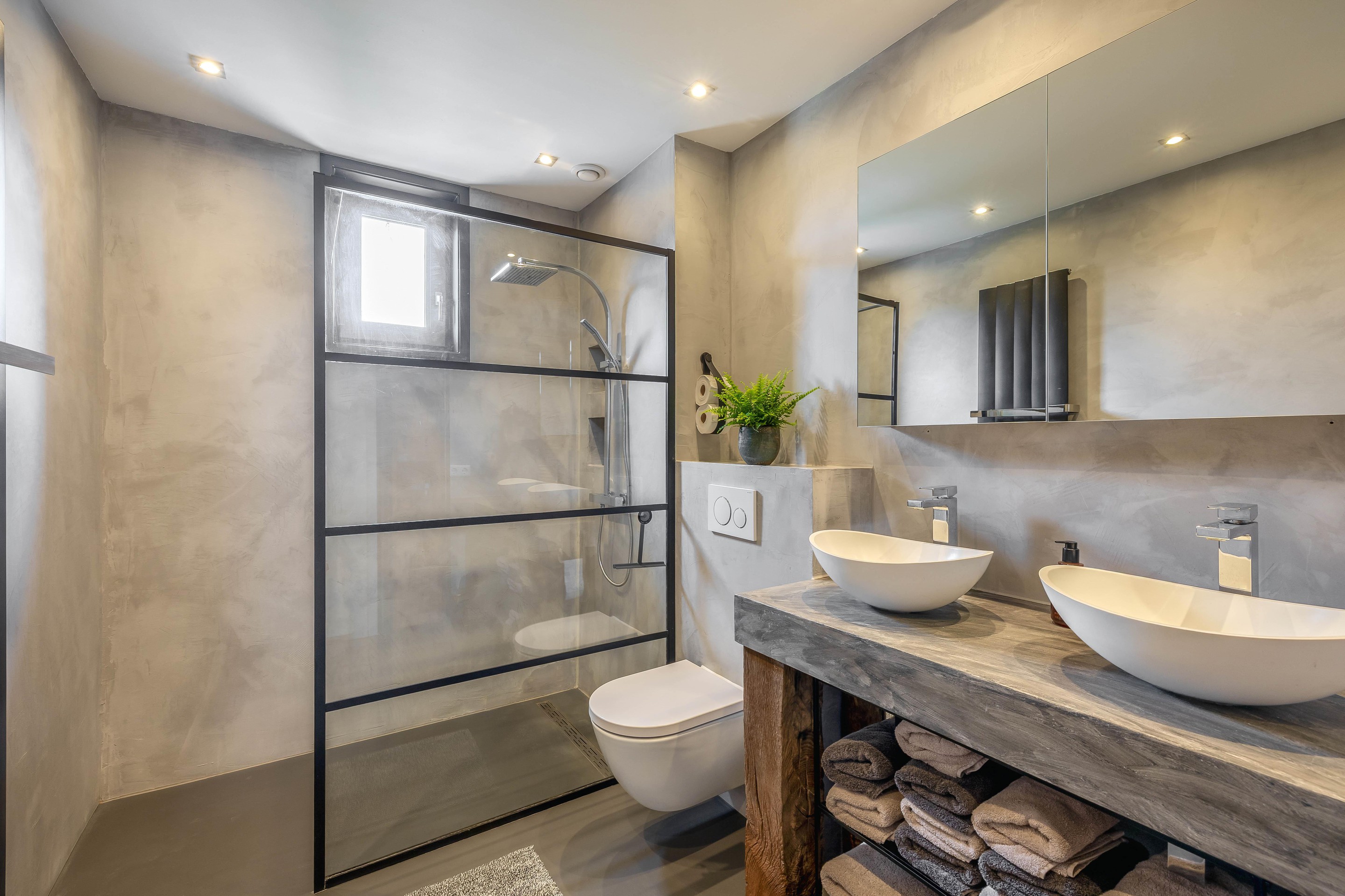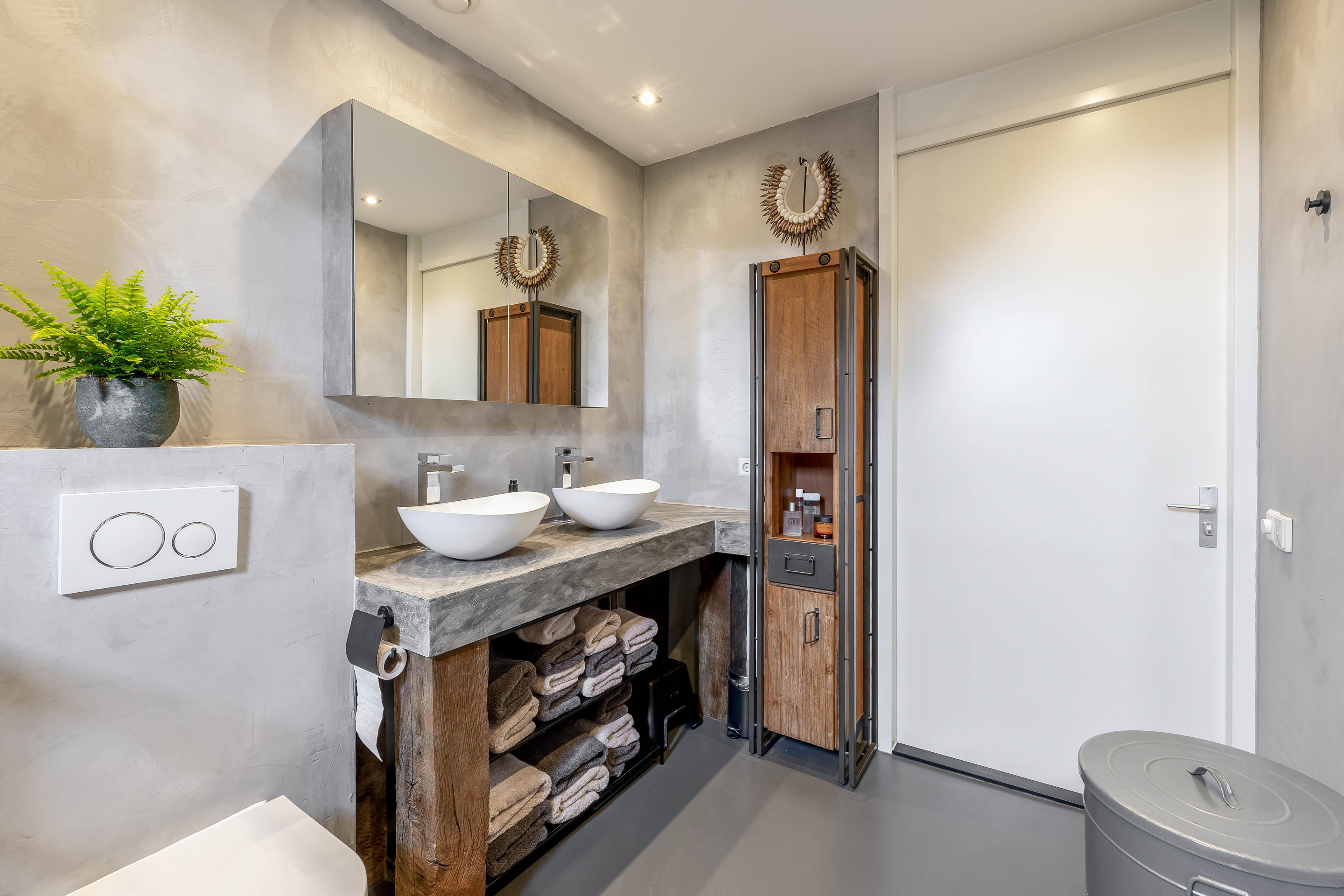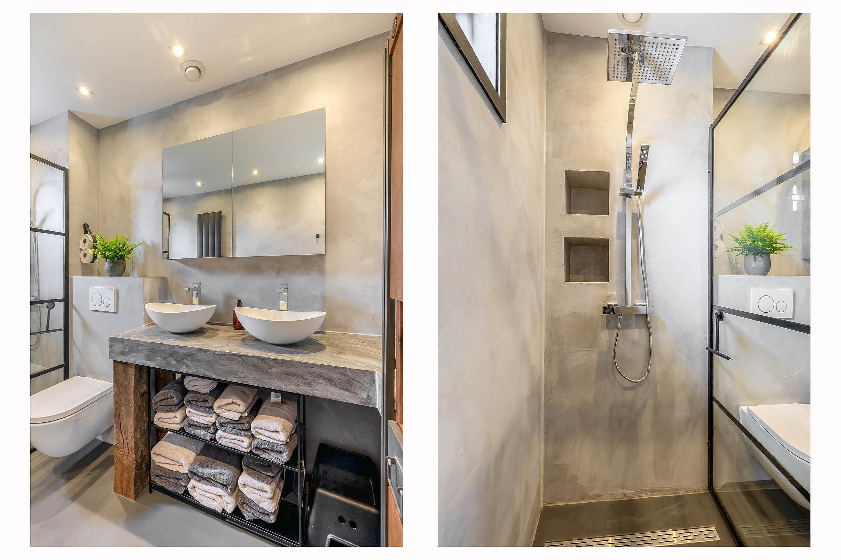 - Luxe badkamer met gietvloer, regendouche, dubbele wastafel en toilet