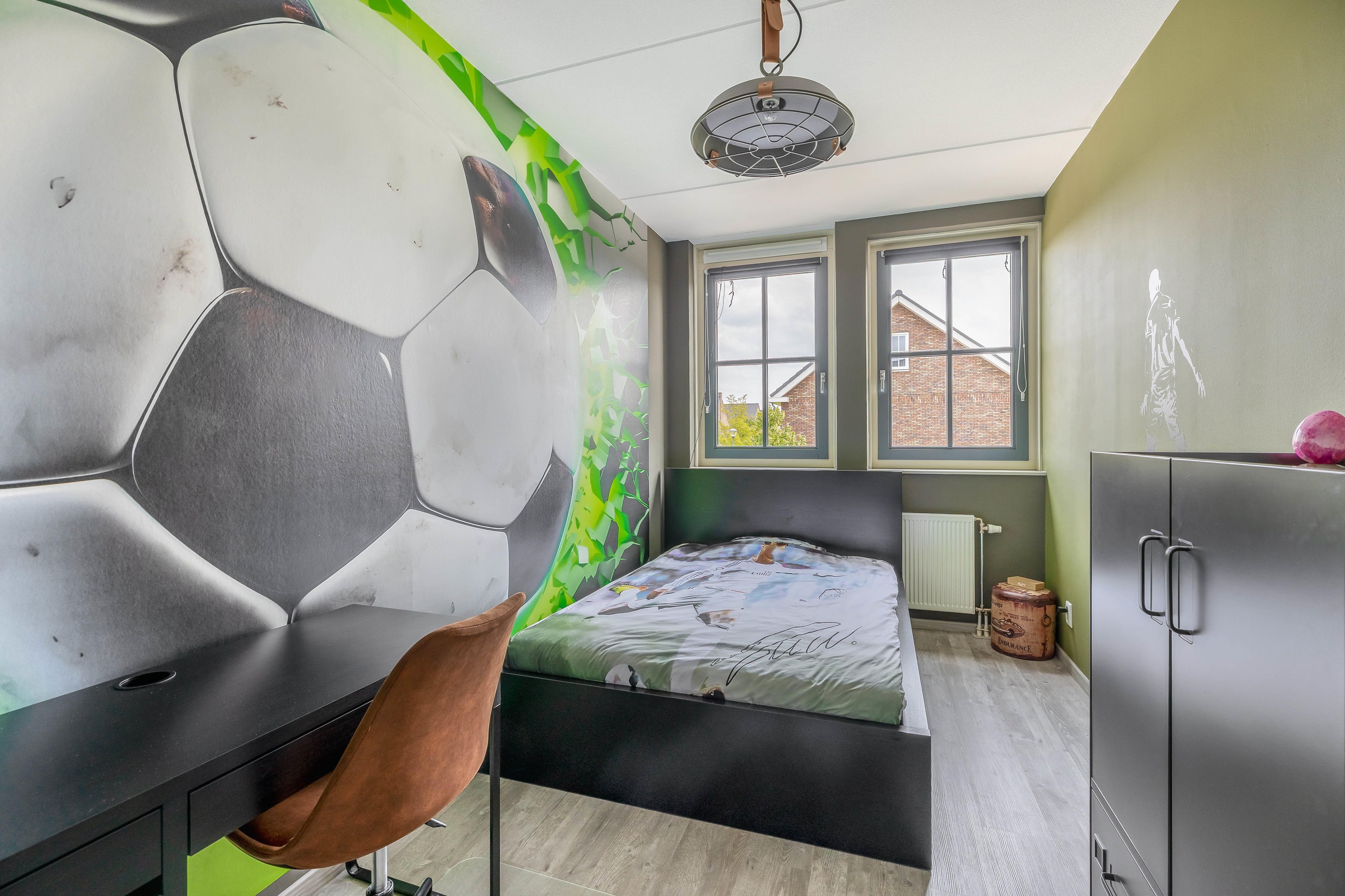 De badkamer is een absolute eyecatcher. De ruimte is strak en natuurlijk afgewerkt met een betonlook gietvloer, houten accenten en zwarte details. Je vindt hier een dubbele wastafel met hardstenen blad, zwevend toilet, designradiator en een royale inloop(regen)douche met industriële glazen wand. Alles is tot in de puntjes afgewerkt.