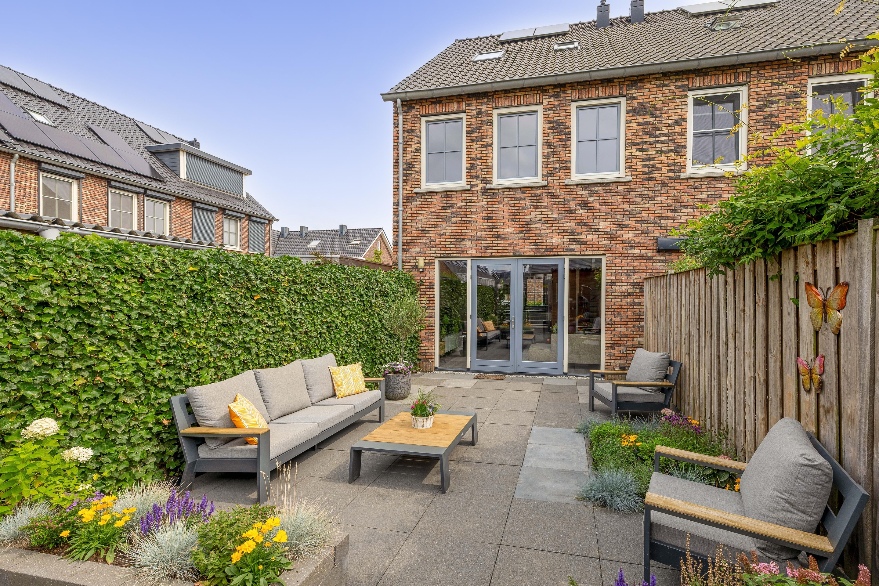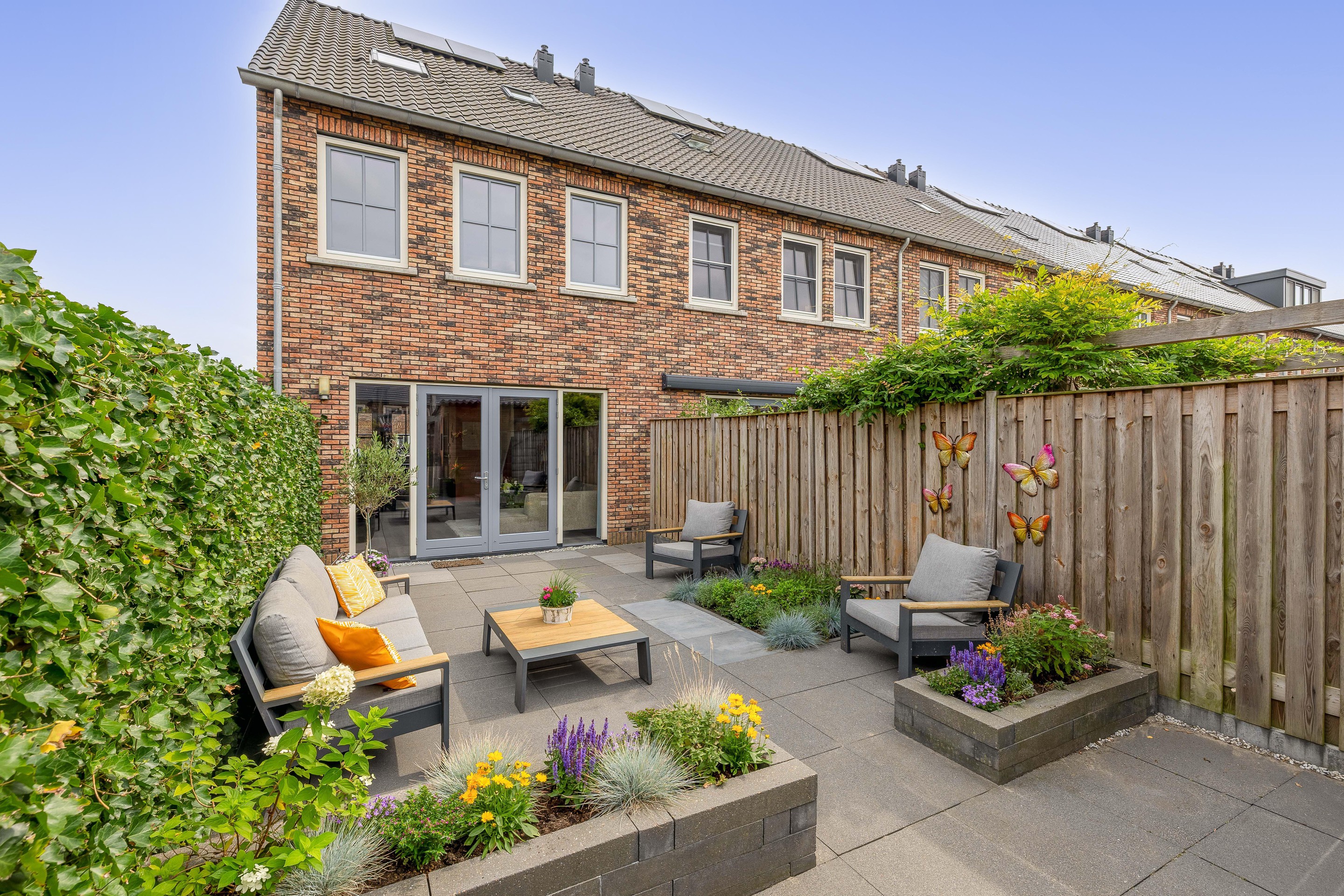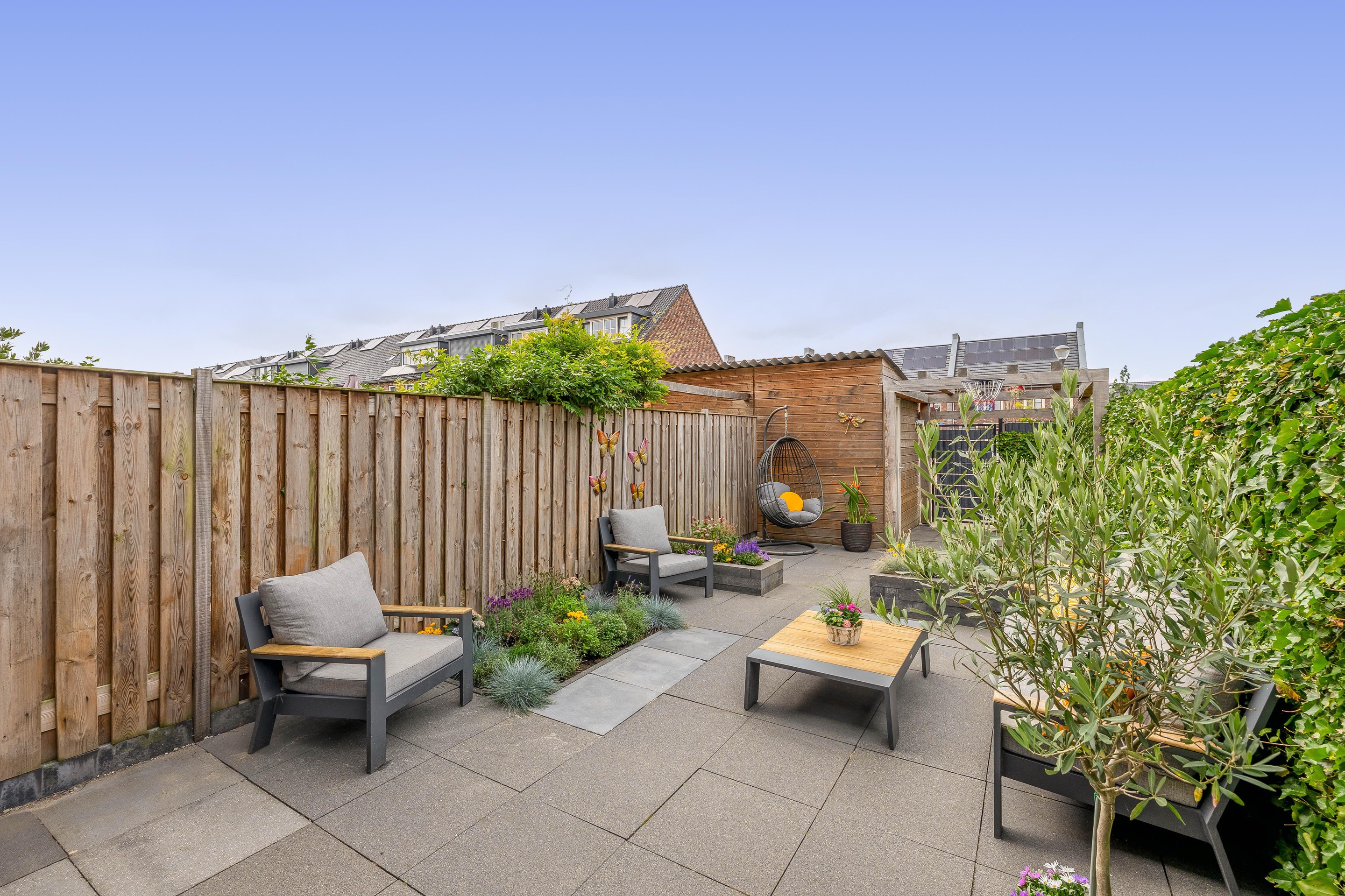 Tuin De achtertuin is gelegen op het noordwesten en is met ca. 11 meter diepte een heerlijke plek om van de middag- en avondzon te genieten. De tuin is modern en onderhoudsvriendelijk aangelegd met grote terrastegels, groenborder en meerdere zitplekken.