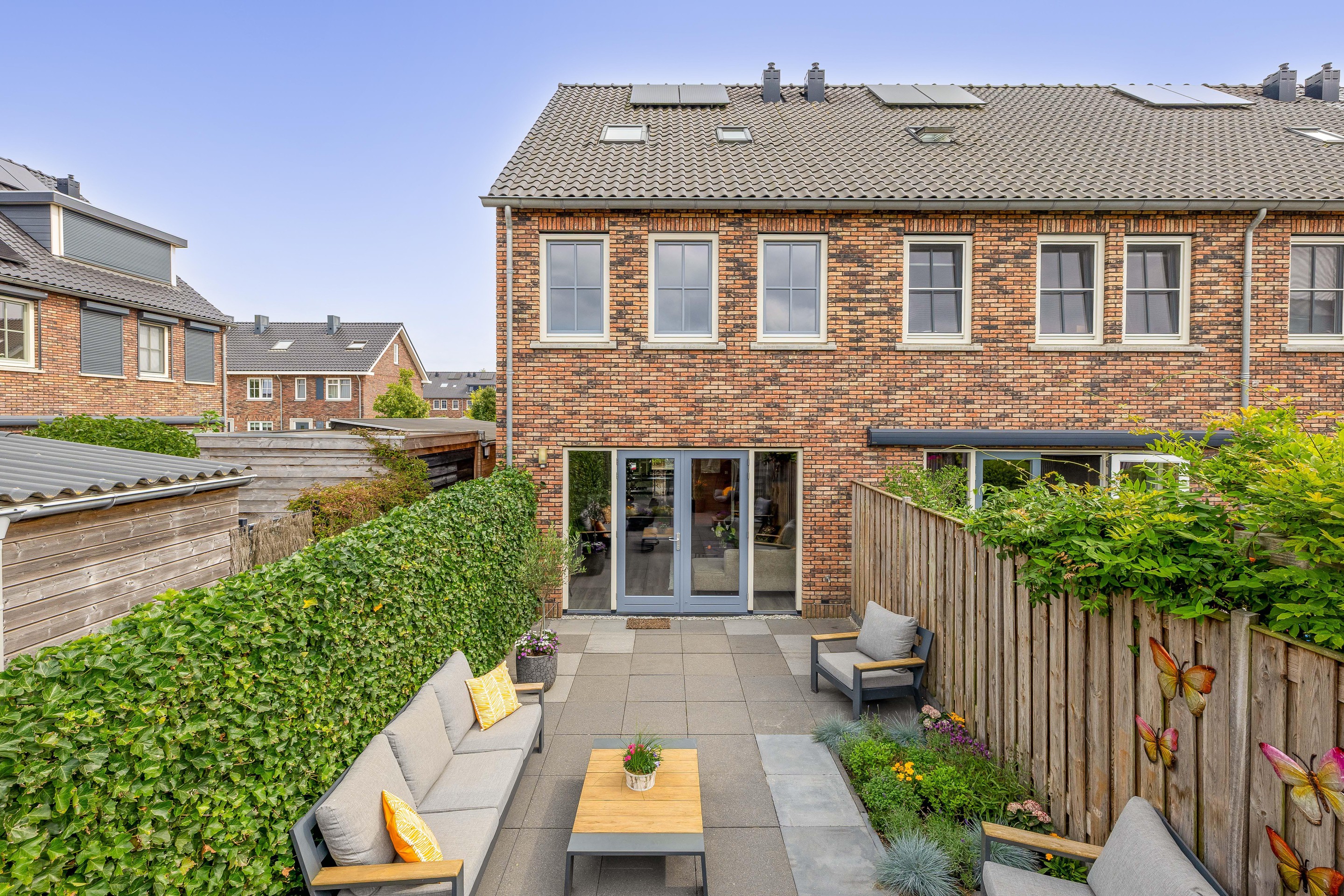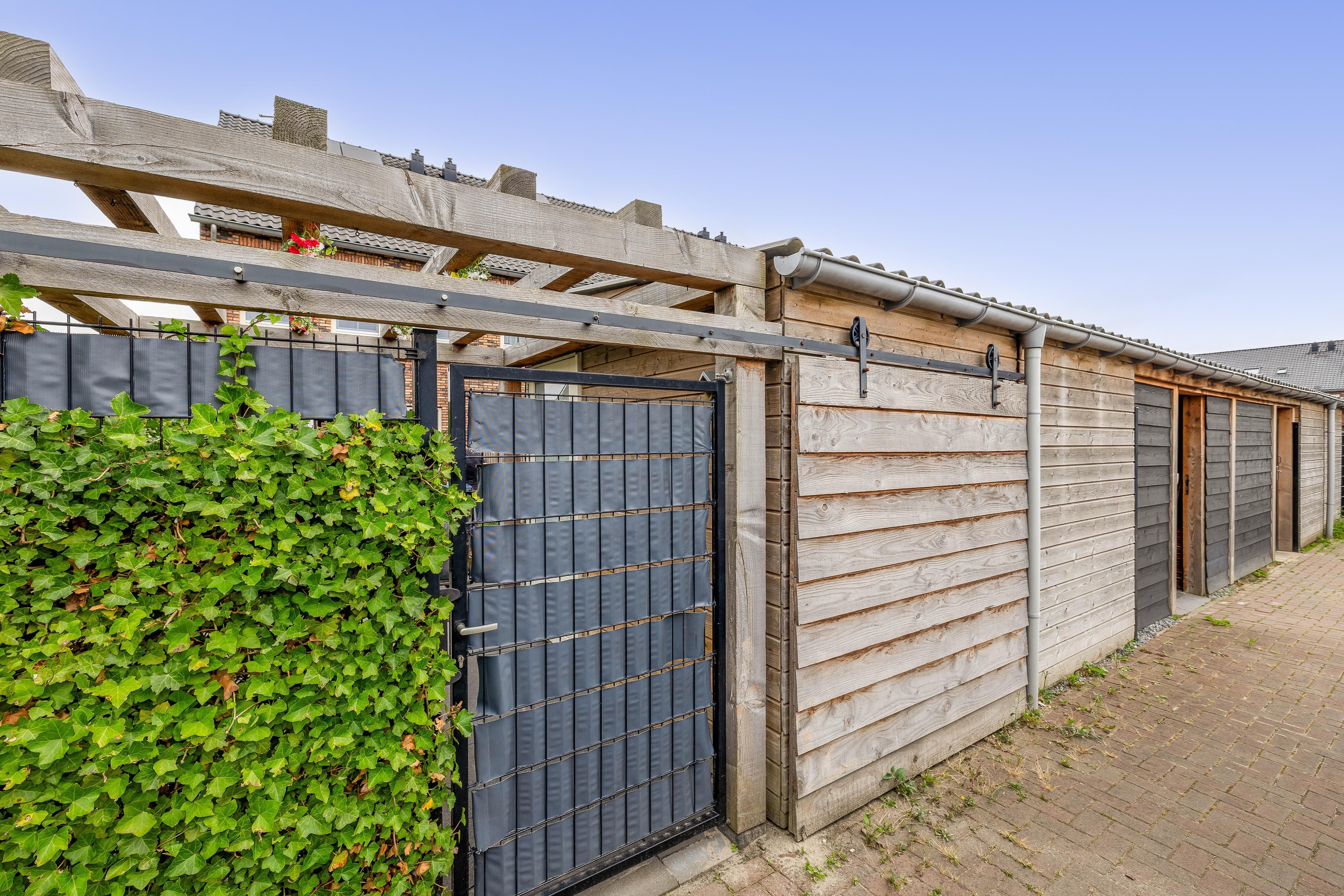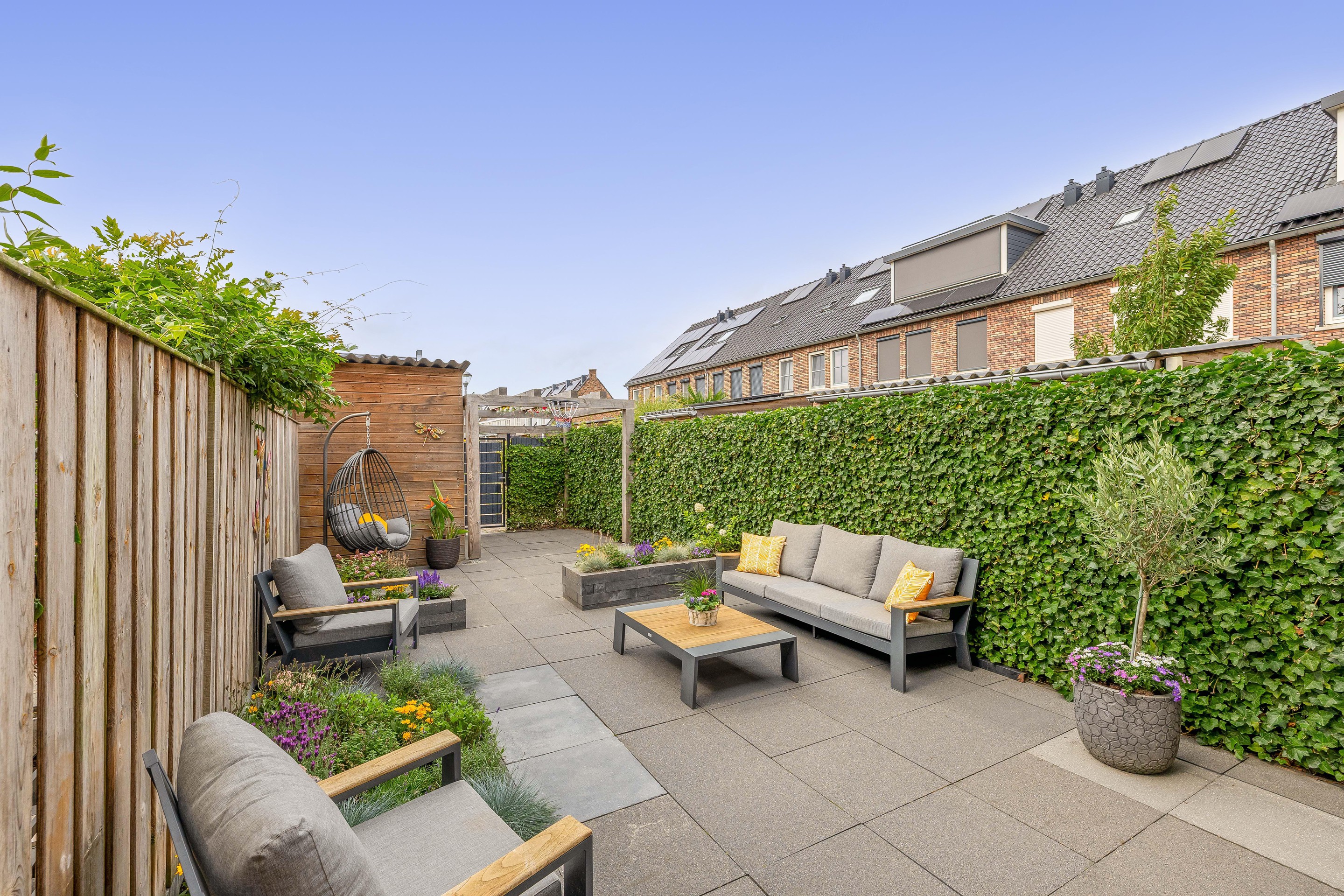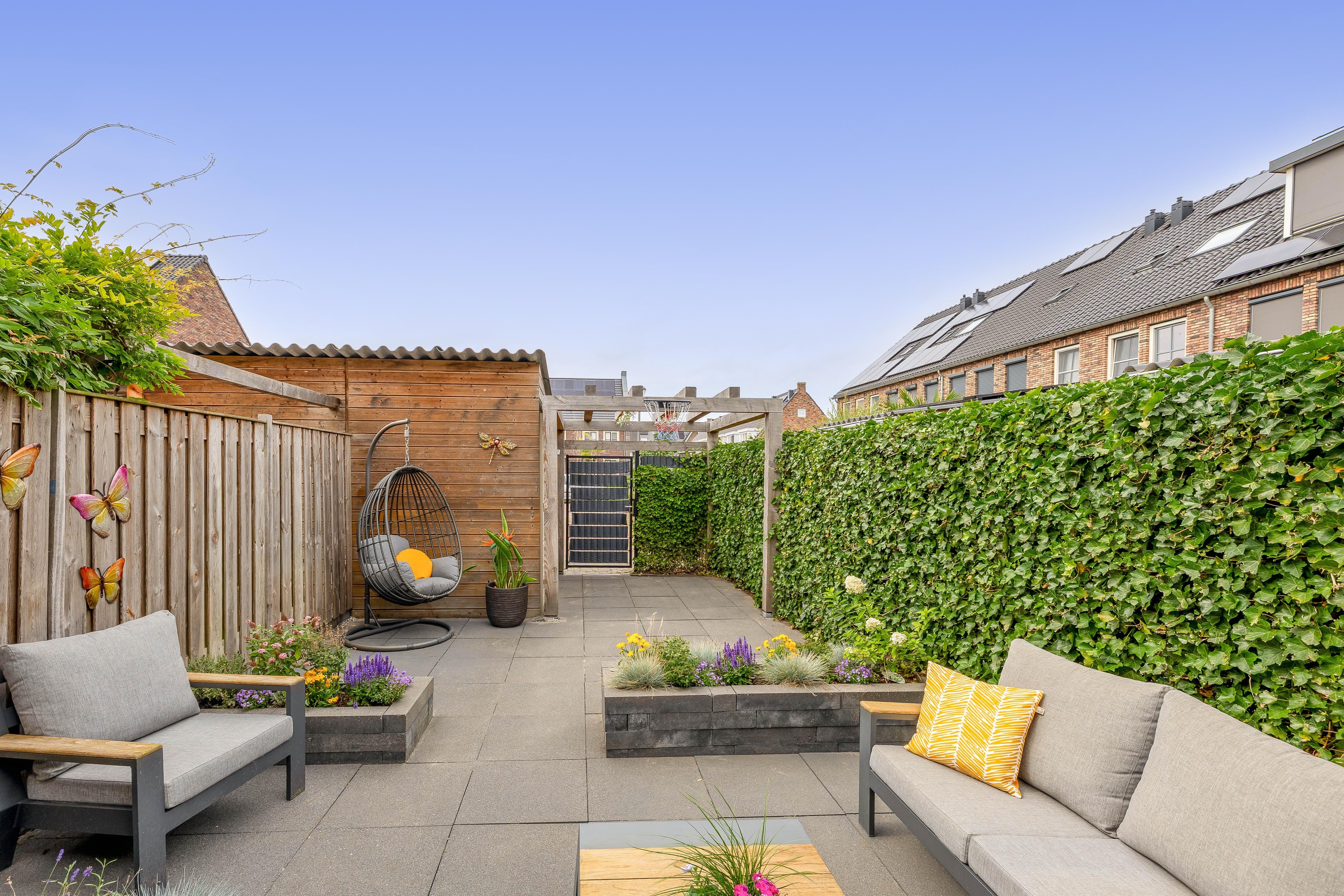 Achter in de tuin bevindt zich een houten berging met elektra, die ook vanuit de achterzijde toegankelijk is via het parkeerhofje. Ideaal voor het stallen van fietsen of motoren. Je hoeft niet eerst de tuin door. De tuin beschikt verder over een buitenkraan en is volledig omsloten met schuttingen en klimop voor extra privacy.