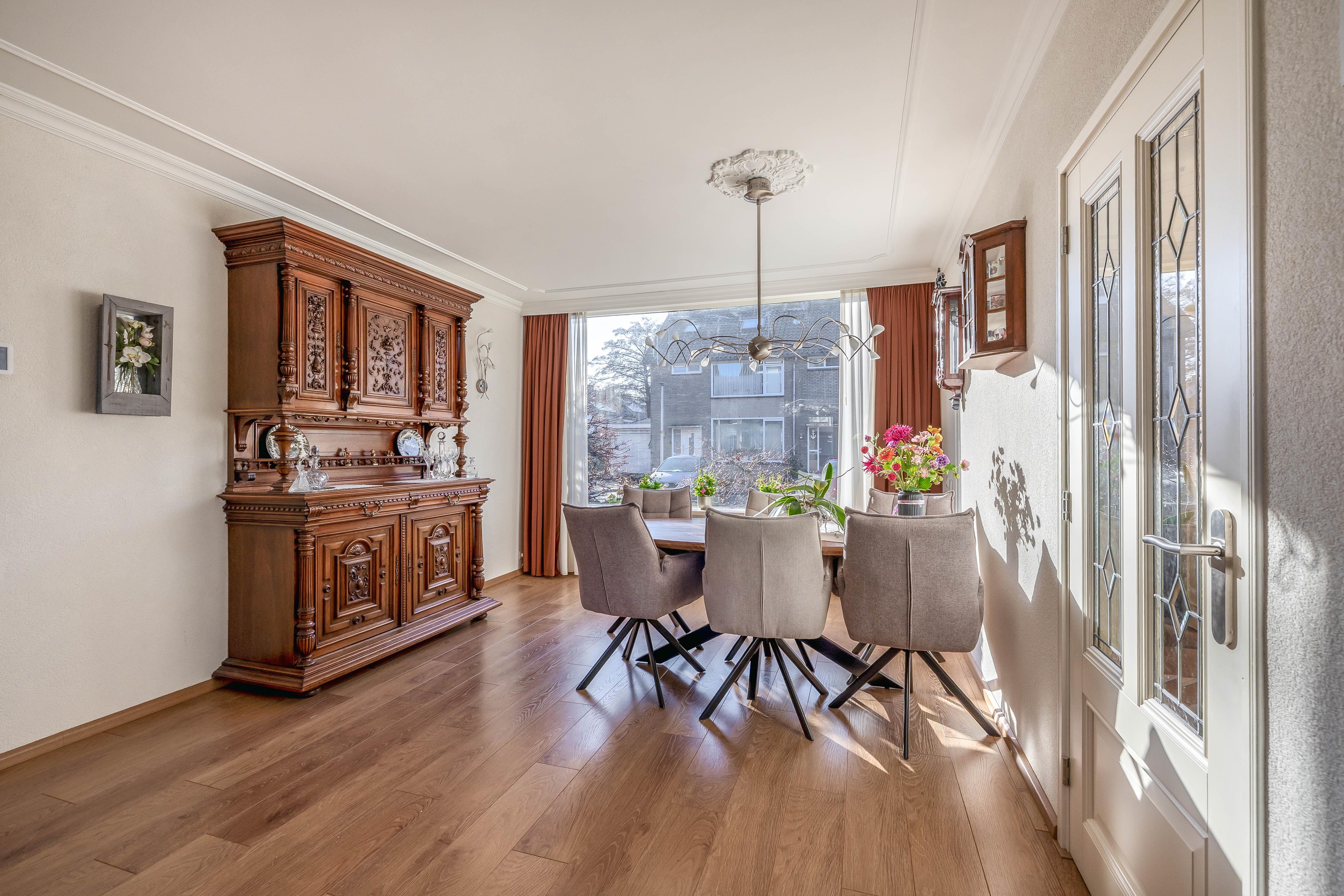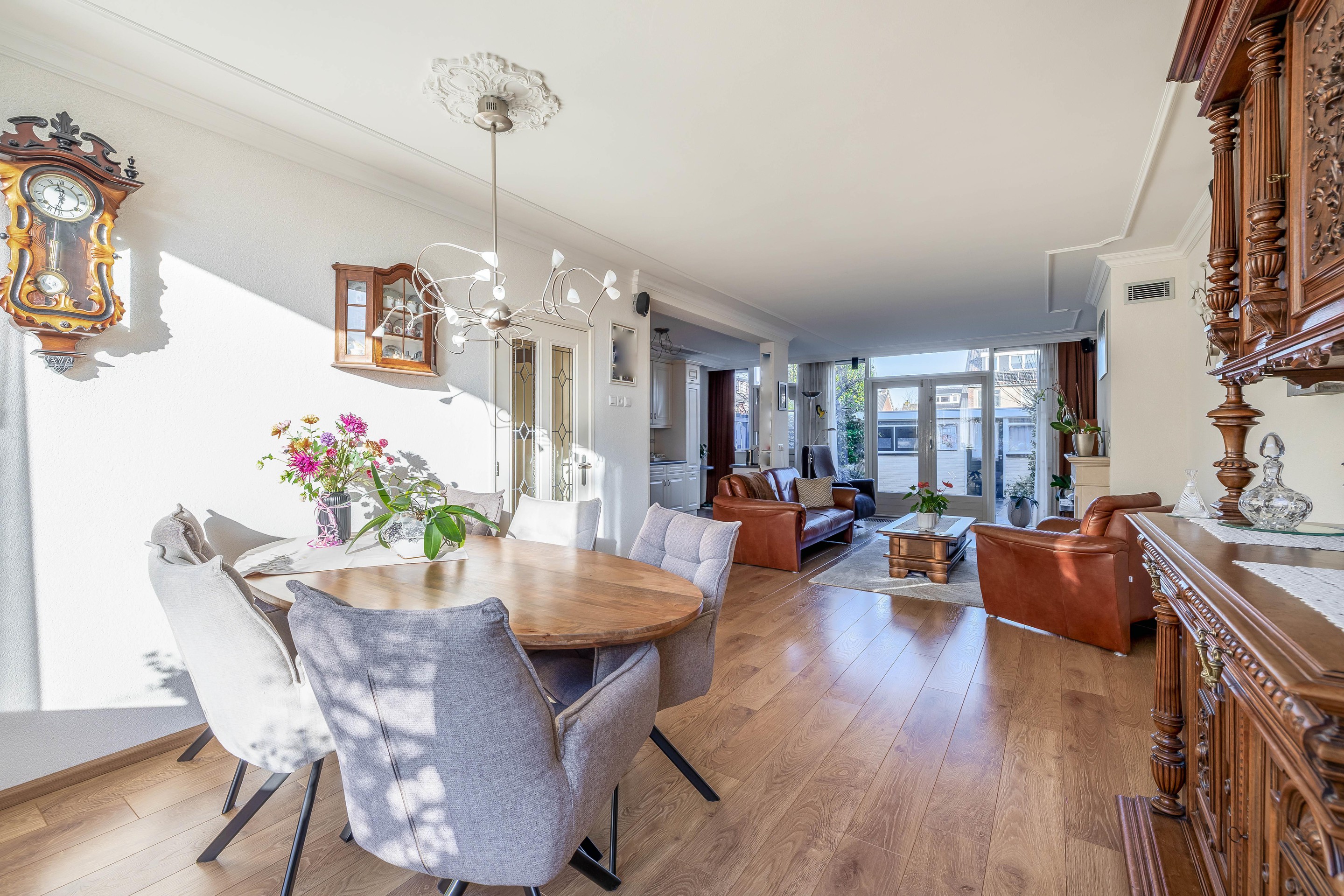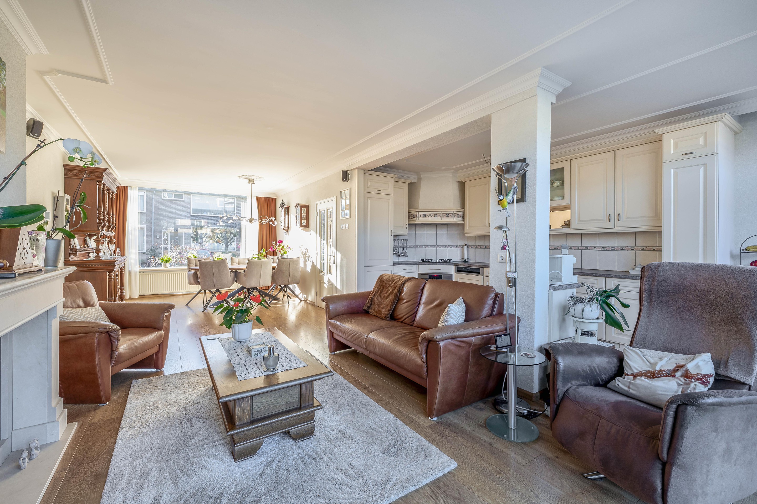 Vanuit de hal stap je de lichte en royale doorzonwoonkamer binnen. Aan de voorzijde is volop ruimte voor een grote eettafel met uitzicht over de rustige straat, terwijl aan de achterzijde een comfortabele zithoek is gecreëerd. De sfeervolle gashaard vormt het warme middelpunt van de living en zorgt voor een aangename en uitnodigende sfeer.