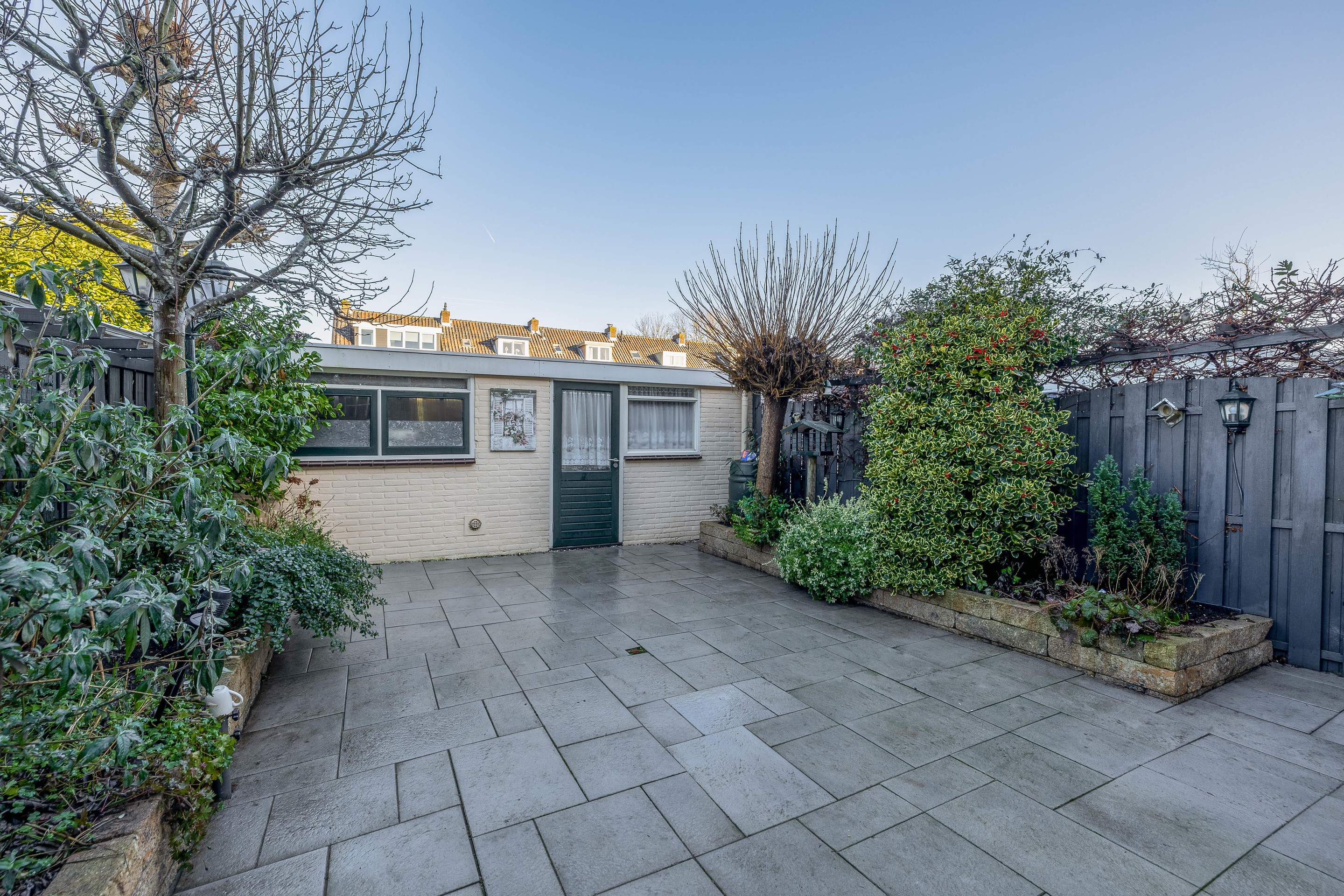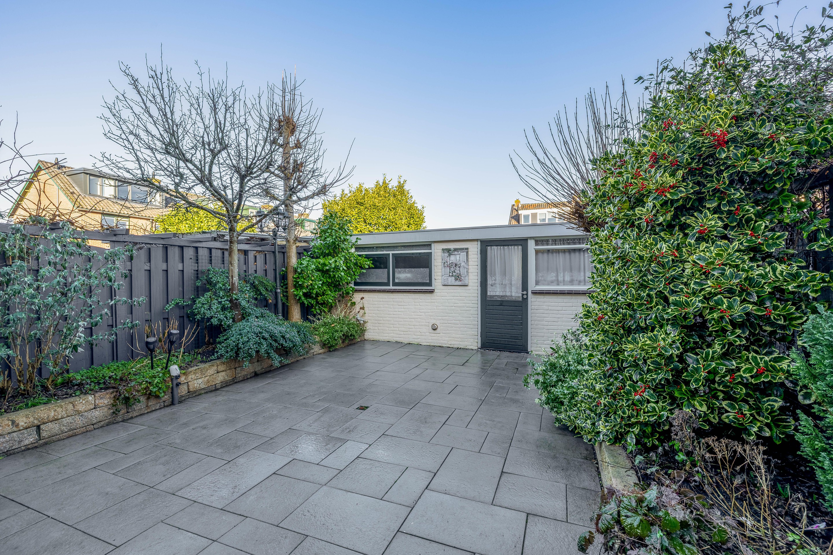 Achter in de tuin bevindt zich een vrijstaande stenen berging over de volledige breedte, wat zorgt voor uitzonderlijk veel bergruimte en een duurzame oplossing voor fietsen, gereedschap of het creëren van een werk- of hobbyplek. De tuin is bovendien voorzien van een praktische achterom, wat het gebruiksgemak verder vergroot.