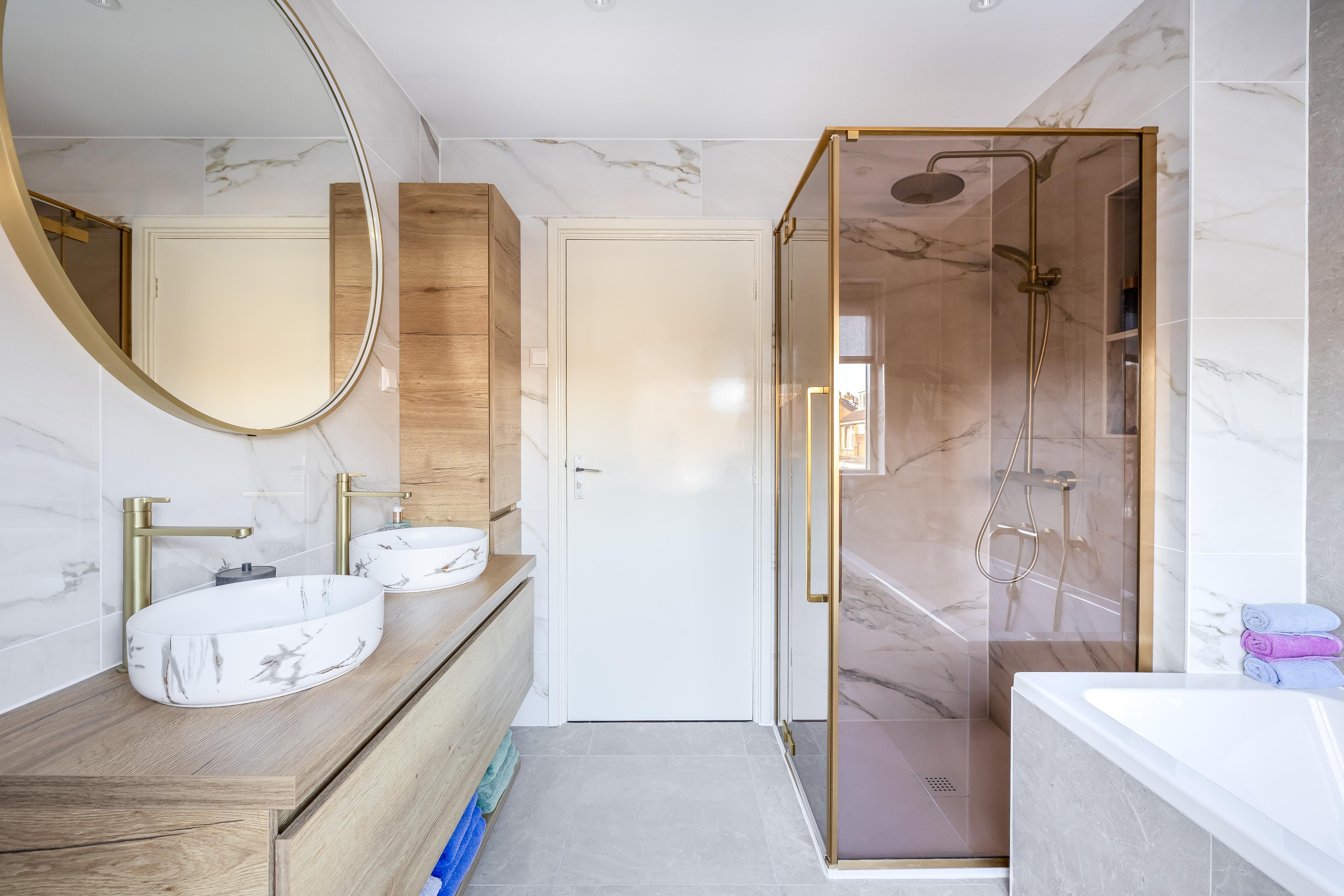 Eerste verdieping De overloop geeft je toegang tot drie (voorheen 4) slaapkamers. De indeling is hier slim aangepast: de voormalige badkamer tussen de slaapkamers in wordt nu gebruikt als praktische wasruimte. De hoofdbadkamer is vorig jaar volledig vernieuwd en is een plek om heerlijk te ontspannen, compleet met een ligbad, een moderne inloopdouche, een tweede toilet en een fraai wastafelmeubel. Noemen we dit niet toevallig hotelchique? De drie slaapkamers zijn resepectievelijk 212 x 234 cm, 378 x 331 cm en 331 x 358 cm groot. En de twee laatstgenoemde kamers hebben beide een vaste kast. Op de overloop is een separaat toilet aanwezig.