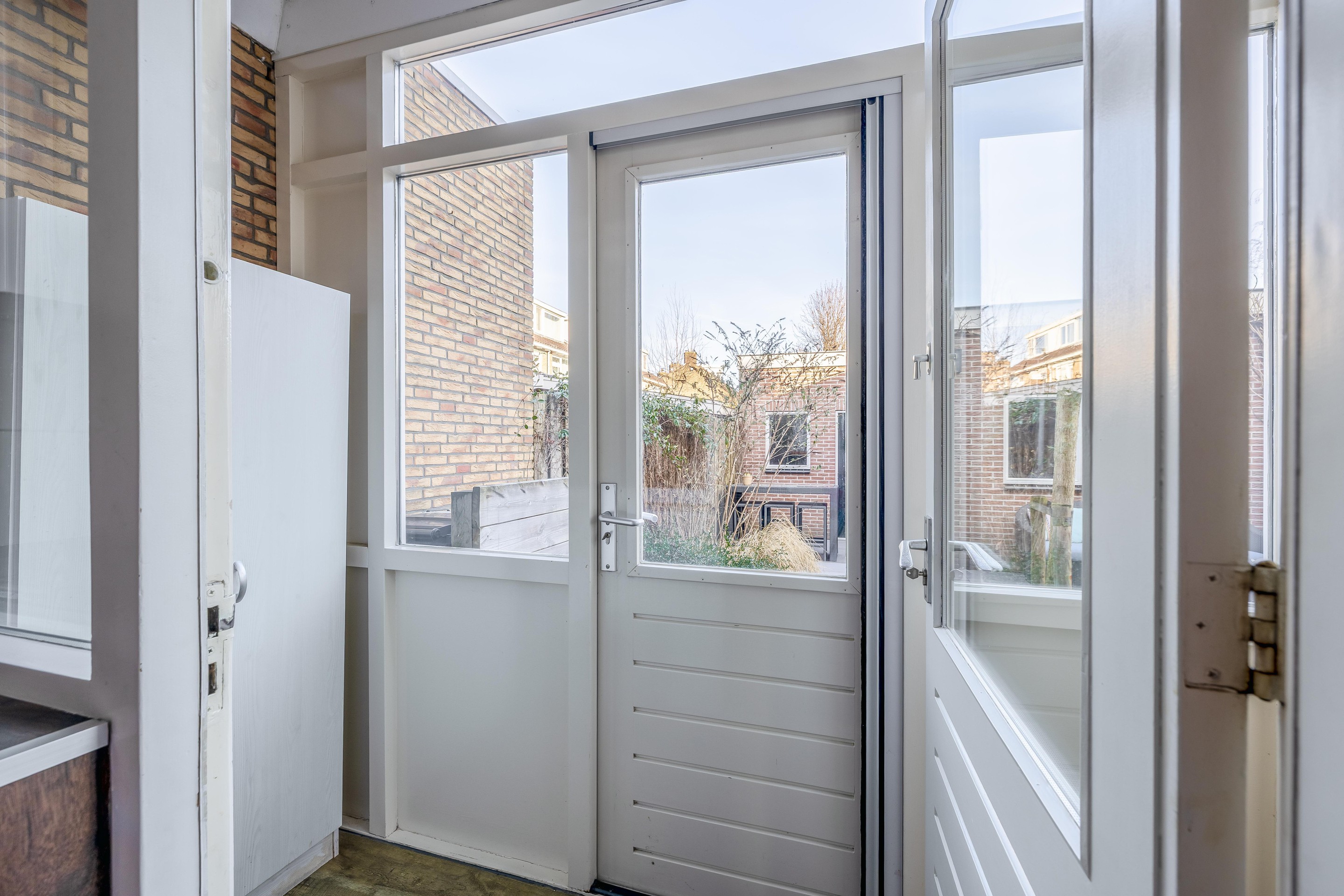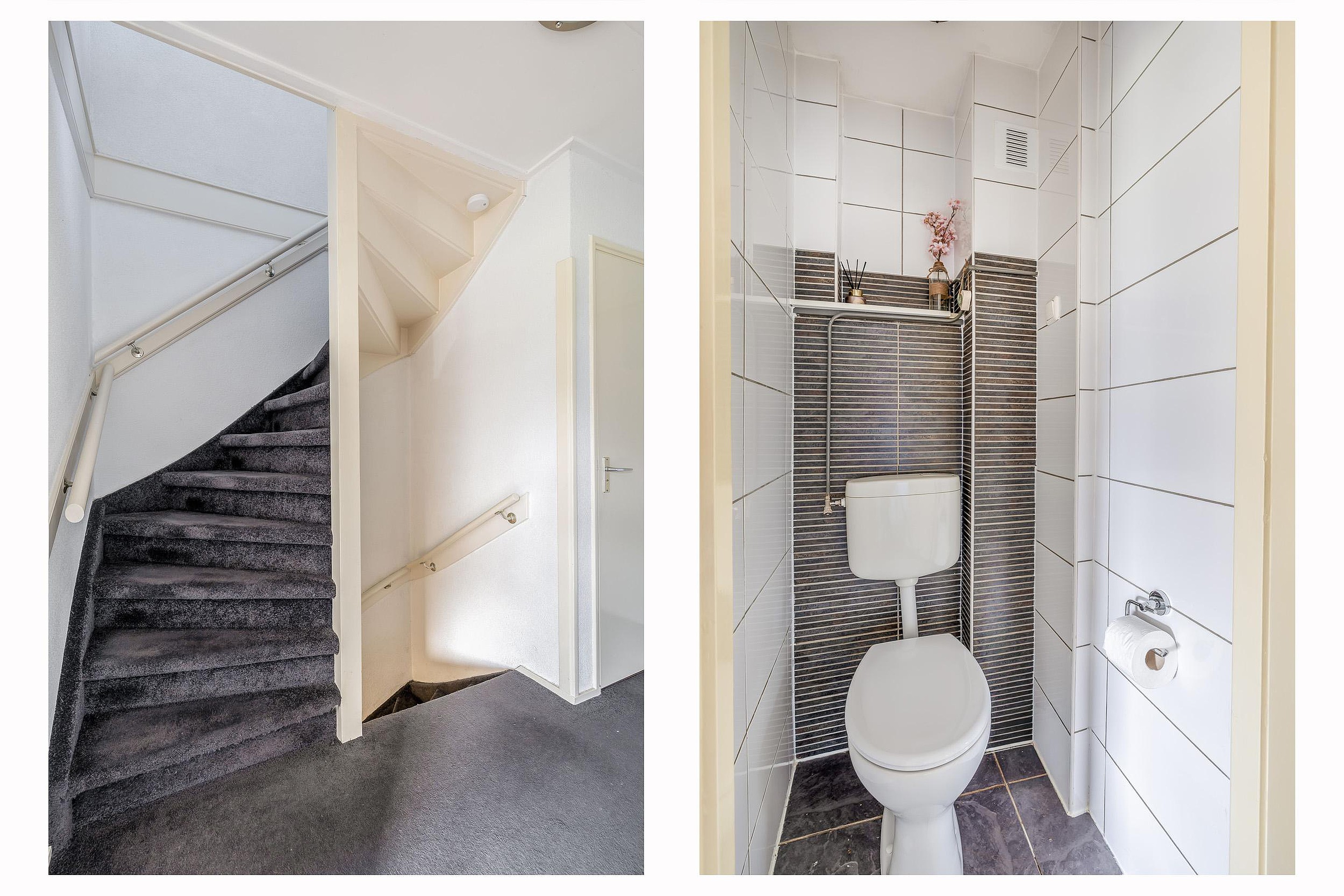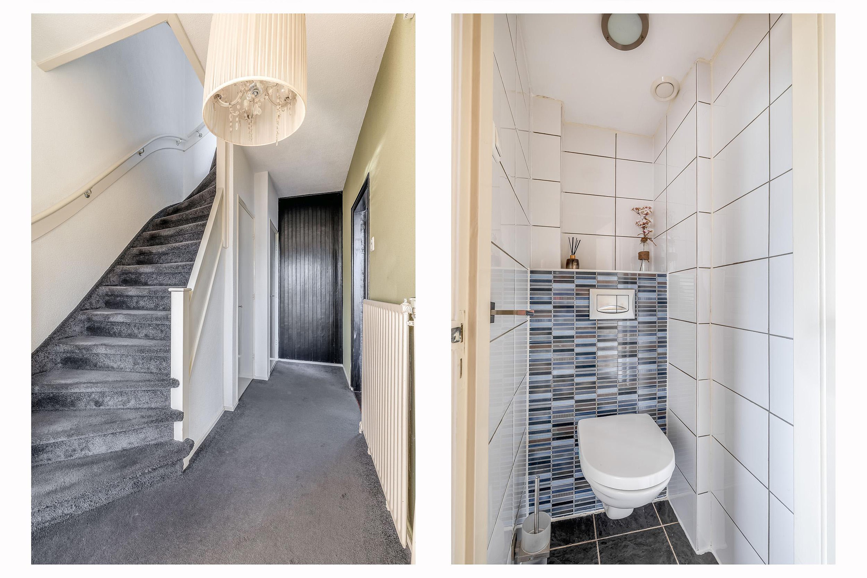 Begane grond Je komt binnen via de verzorgde voortuin. In de royale hal vind je de meterkast, de trapopgang, een trapkast en een moderne, geheel betegelde toiletruimte met hangend toilet. De lichte doorzon-woonkamer heeft een sfeervolle open haard en een keurige laminaatvloer. De open keuken is van alle gemakken voorzien, zoals een vaatwasmachine, gaskookplaat, oven, magnetron en koel/vrieskast. Vanuit de keuken kom in een aangebouwde voorentree, die je vervolgens toegang geeft tot de fraaie achtertuin. De entree kan goed gebruikt worden als garderobe of bijvoorbeeld als bijkeuken met een extra koelkast.