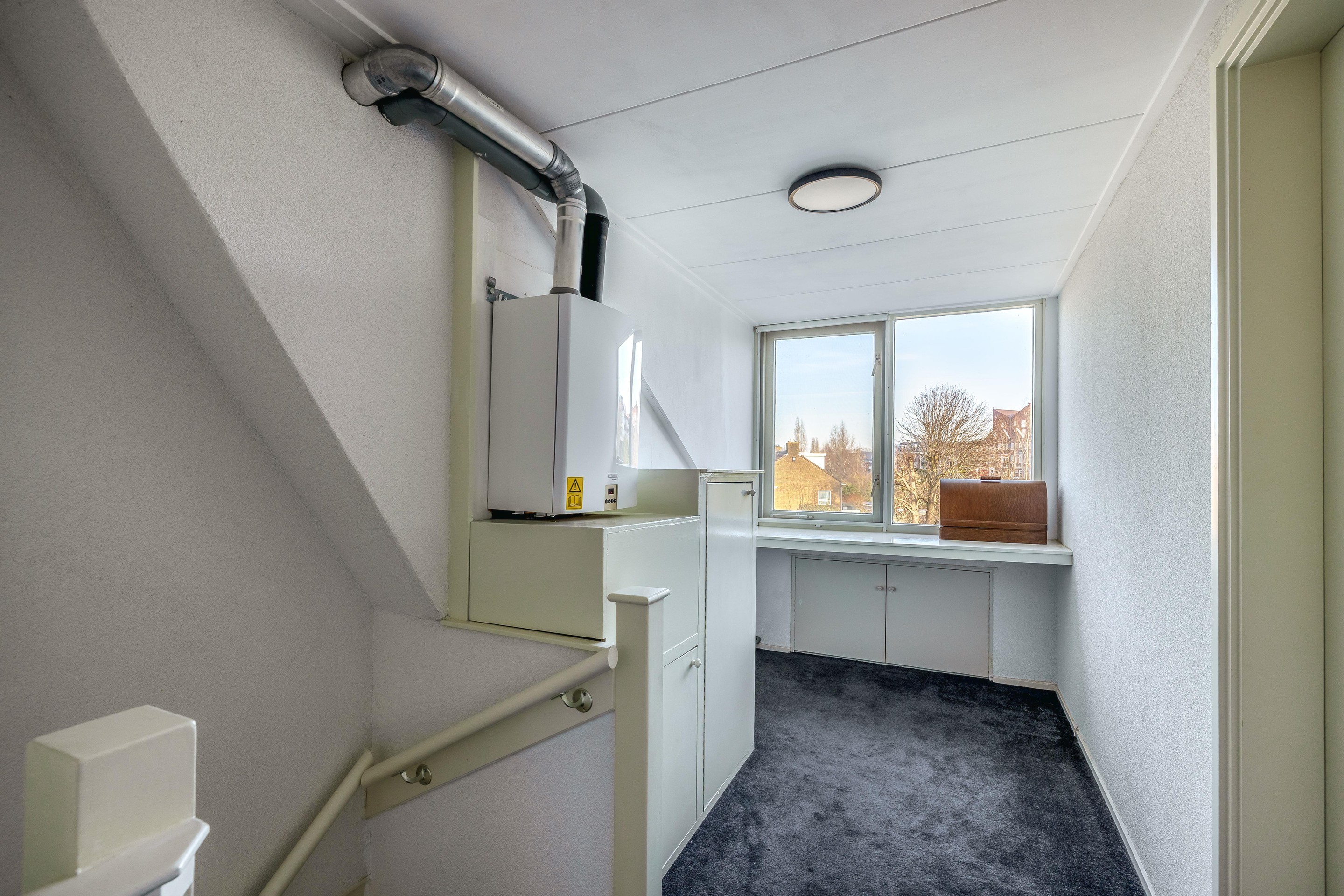Tweede verdieping Via een vaste trap bereik je de zolder. Hier vind je een mooie, ruime overloop met de cv-opstelling en genoeg plek voor bijvoorbeeld je eigen werkplek. Daarnaast is er een grote vierde slaapkamer, die dankzij de woningbrede dakkapel heerlijk licht en ruim aanvoelt. Onder de schuine kap van het huis zijn bergschotten gemaakt, zodat koffers en de kerstspullen ook opgeruimd kunnen worden.