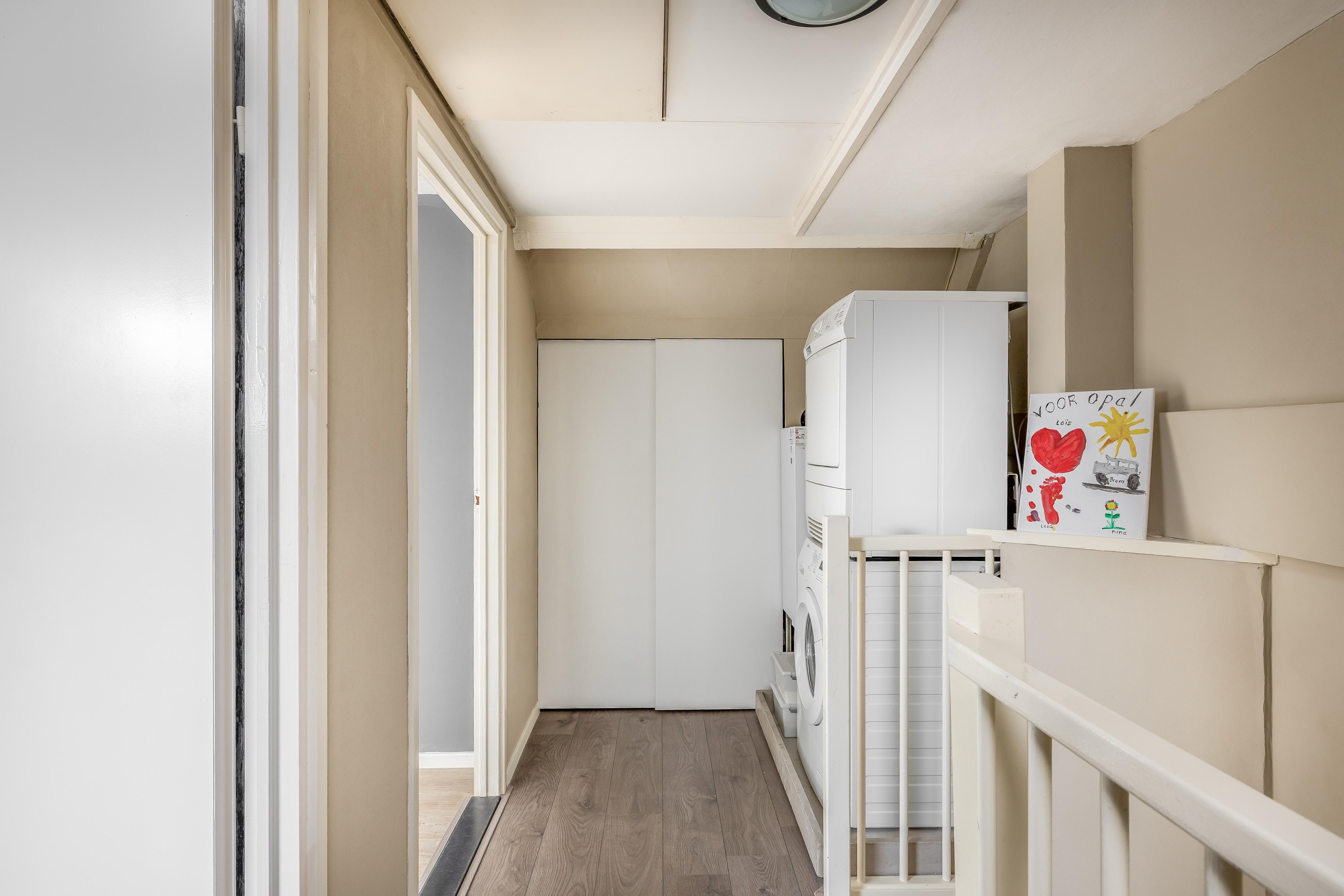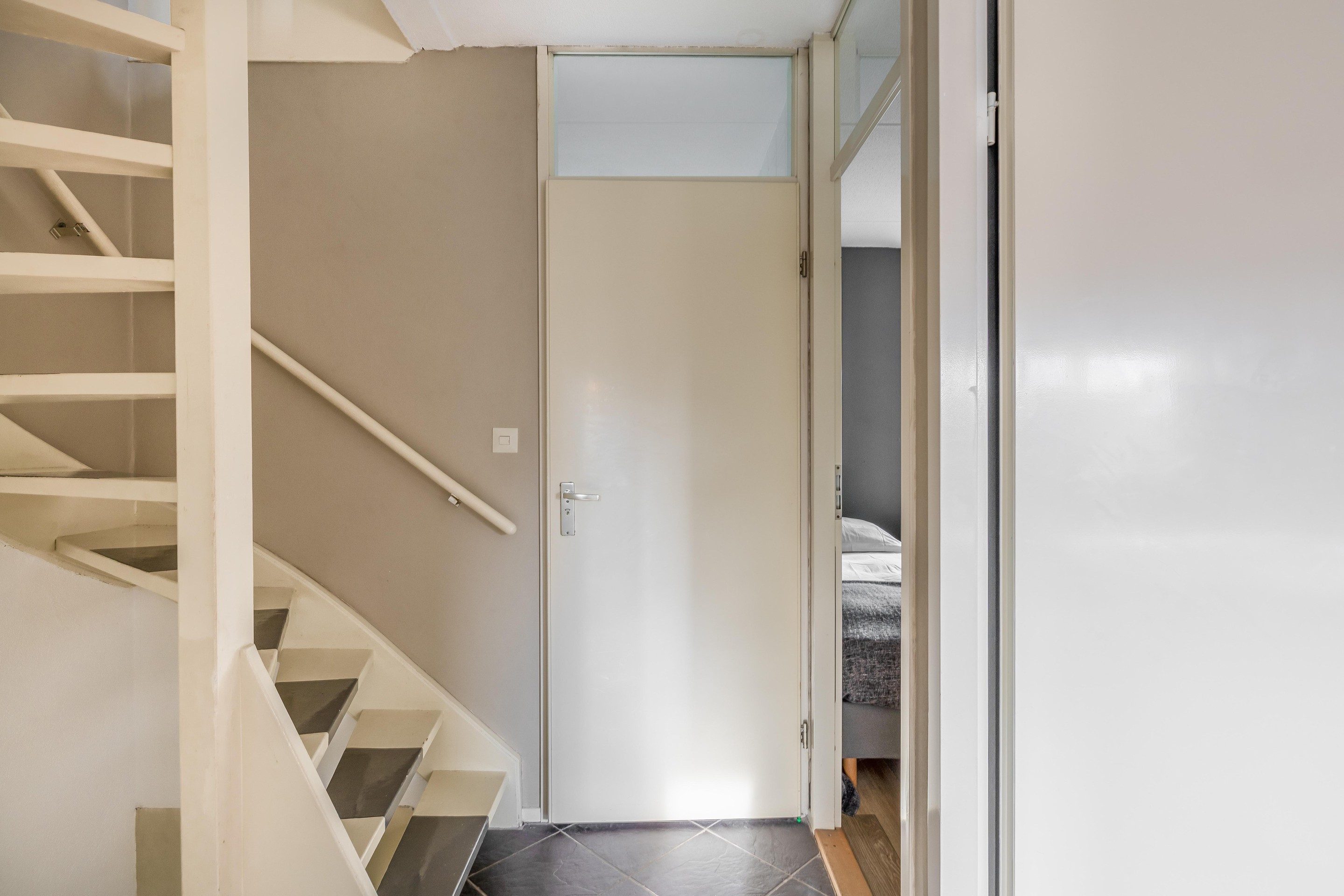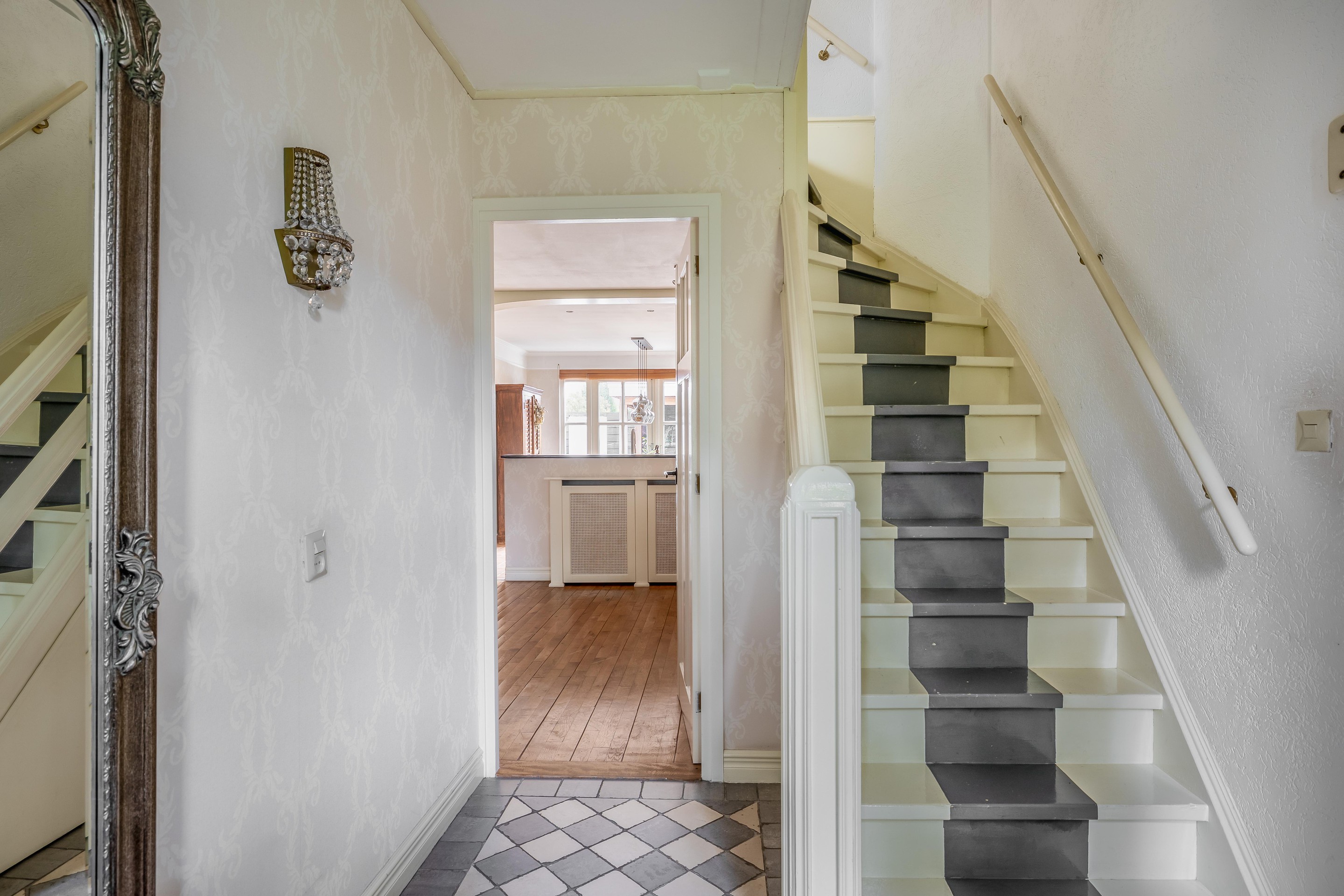 Begane grond Via de verzorgde voortuin kom je in de entree/hal van het huis. Deze is voorzien van een betegelde decorvloer en een keurige wandafwerking. Onder de trap bevindt zich een kleine bergruimte, namelijk een trapkast. Oorspronkelijk was in deze hal een toilet aanwezig, maar tijdens het uitbouwen is dit toilet verplaatst naar de achterzijde. Via de houten trap is er toegang tot de verdieping, en rechtdoor loop je naar de woonkamer met halfopen keuken.