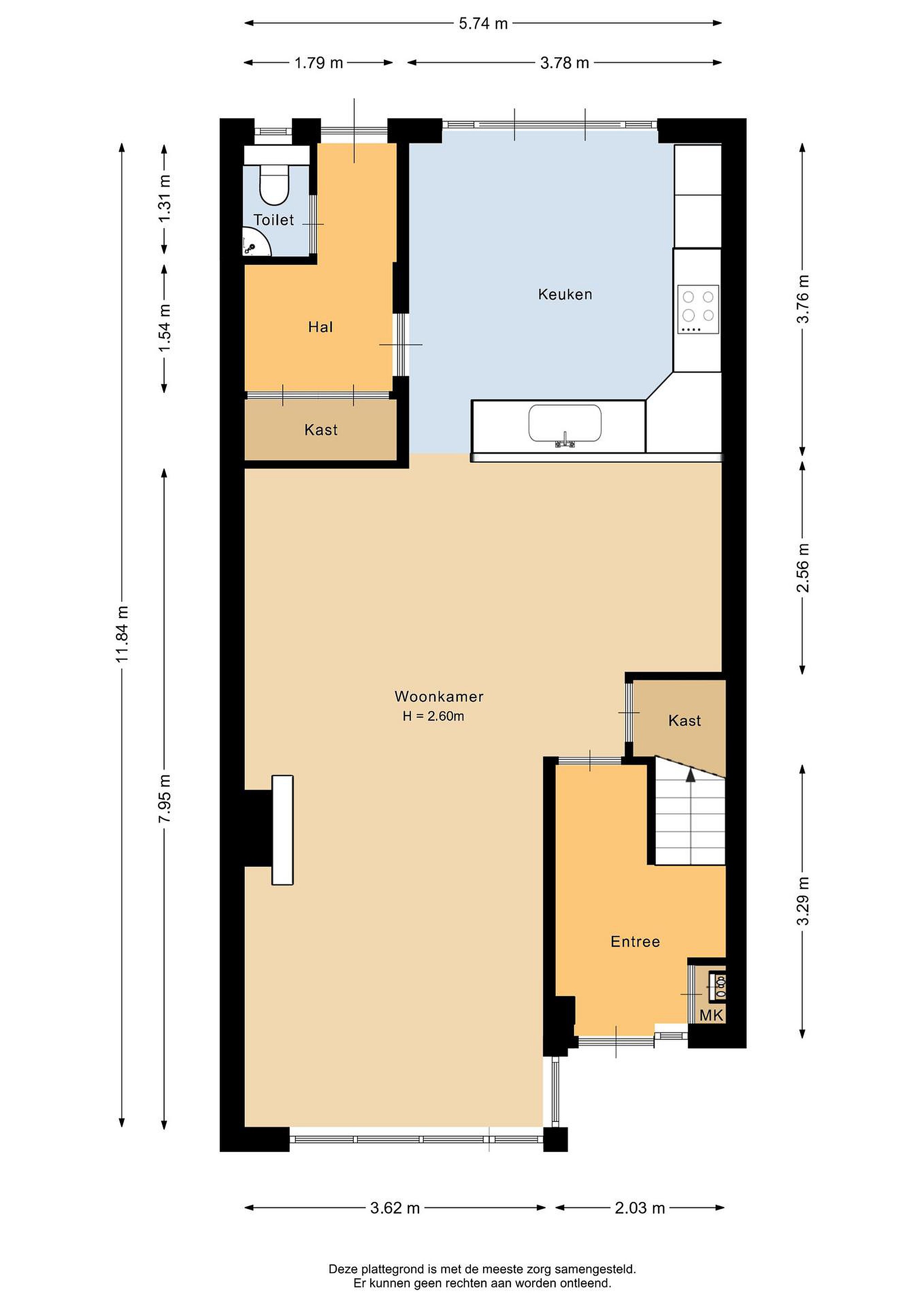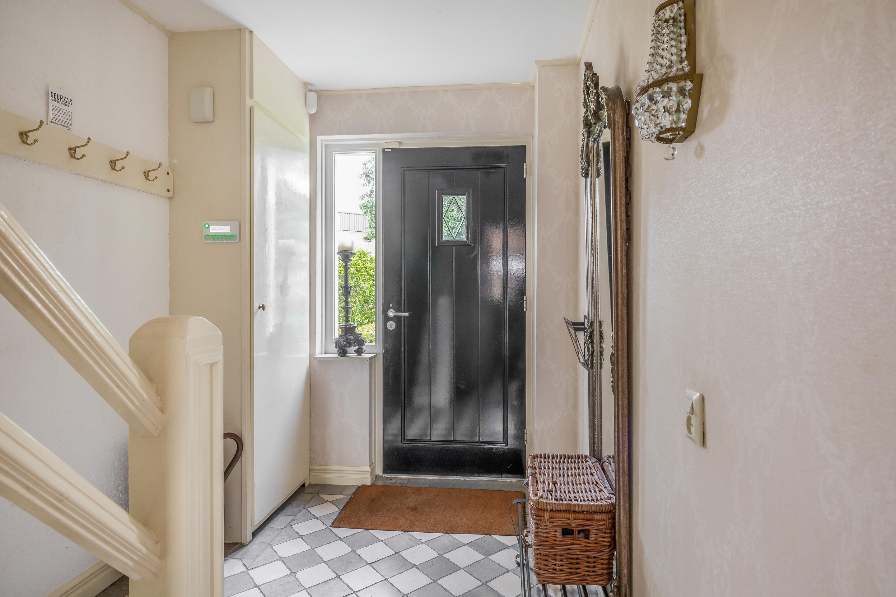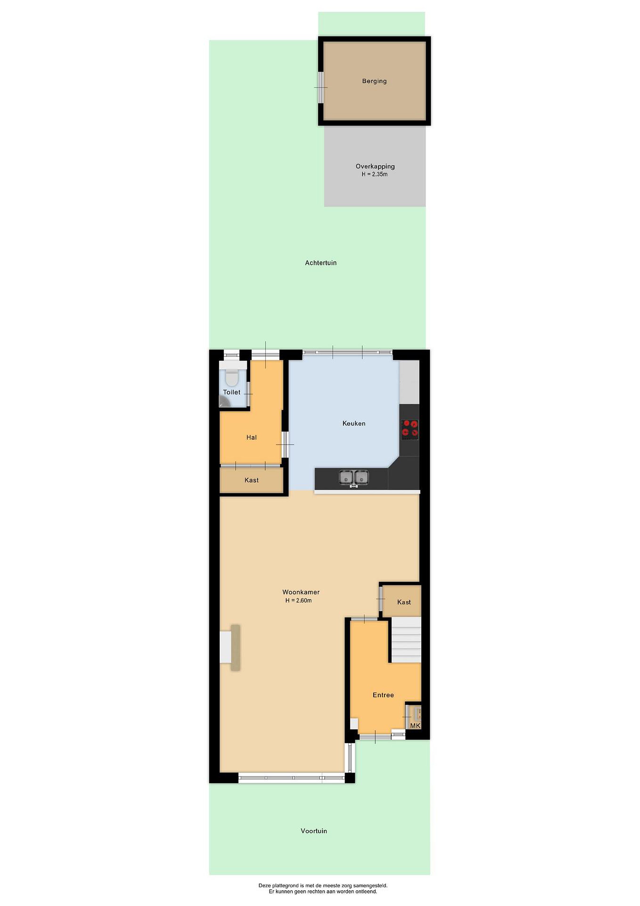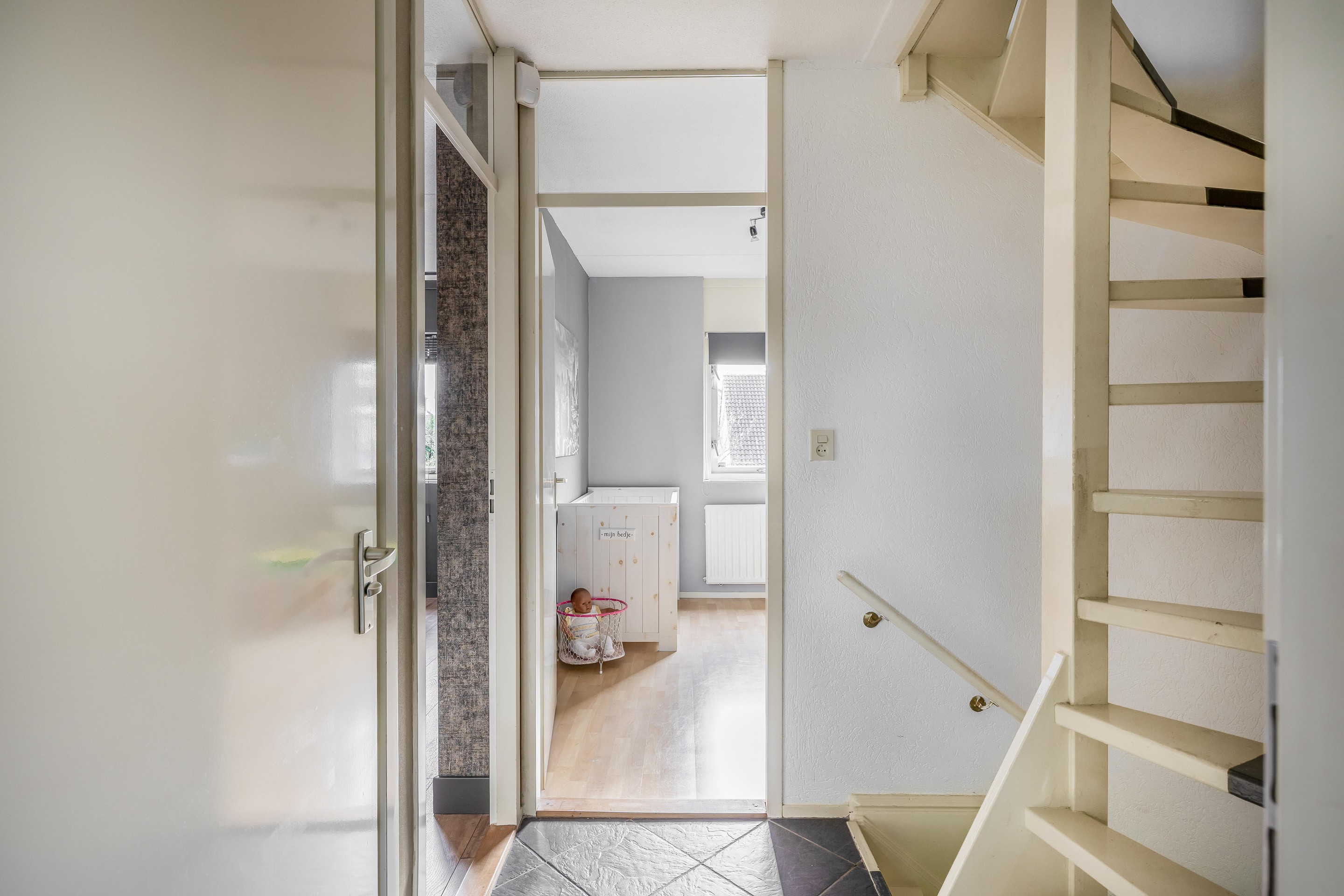 Begane grond Via de verzorgde voortuin kom je in de entree/hal van het huis. Deze is voorzien van een betegelde decorvloer en een keurige wandafwerking. Onder de trap bevindt zich een kleine bergruimte, namelijk een trapkast. Oorspronkelijk was in deze hal een toilet aanwezig, maar tijdens het uitbouwen is dit toilet verplaatst naar de achterzijde. Via de houten trap is er toegang tot de verdieping, en rechtdoor loop je naar de woonkamer met halfopen keuken.