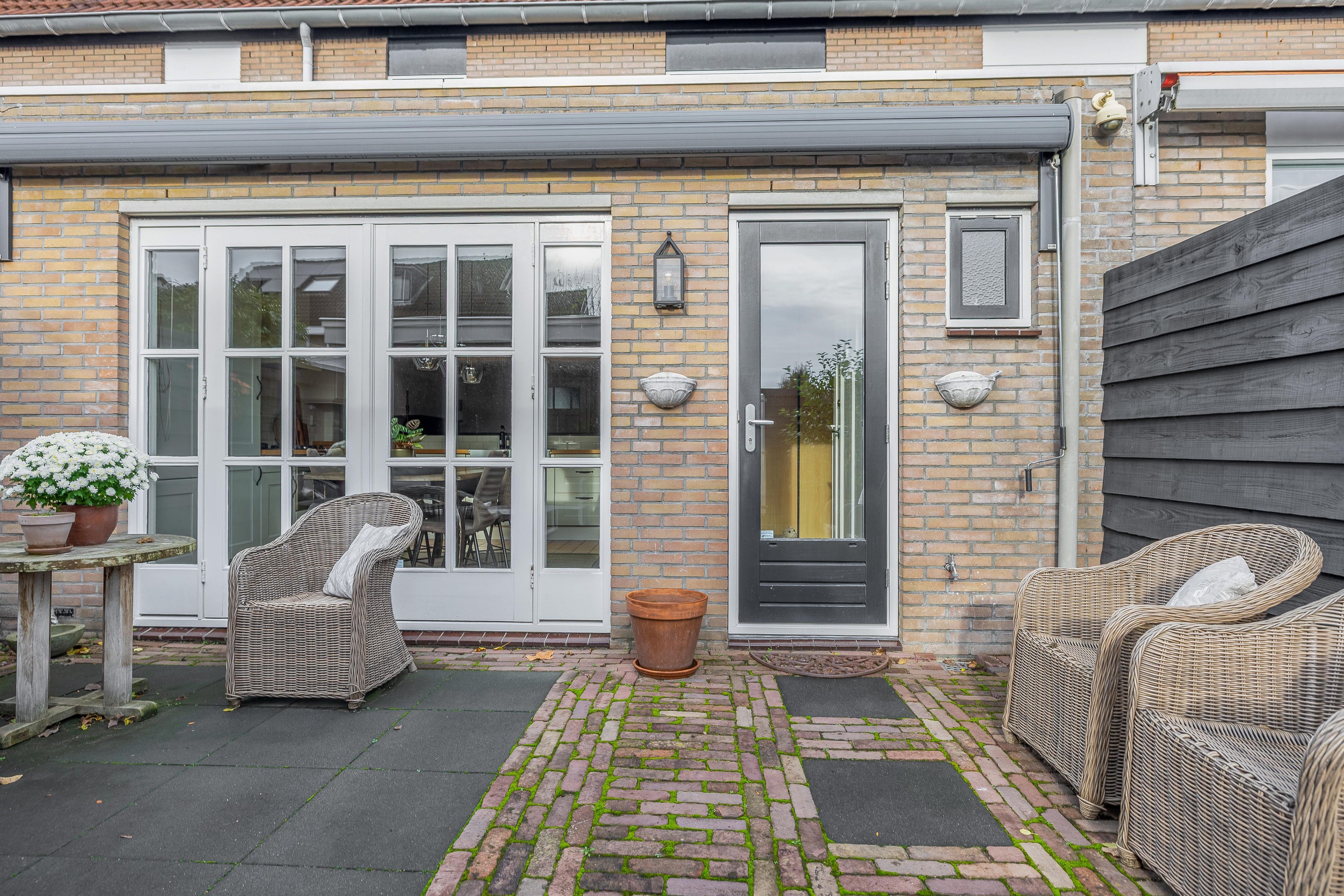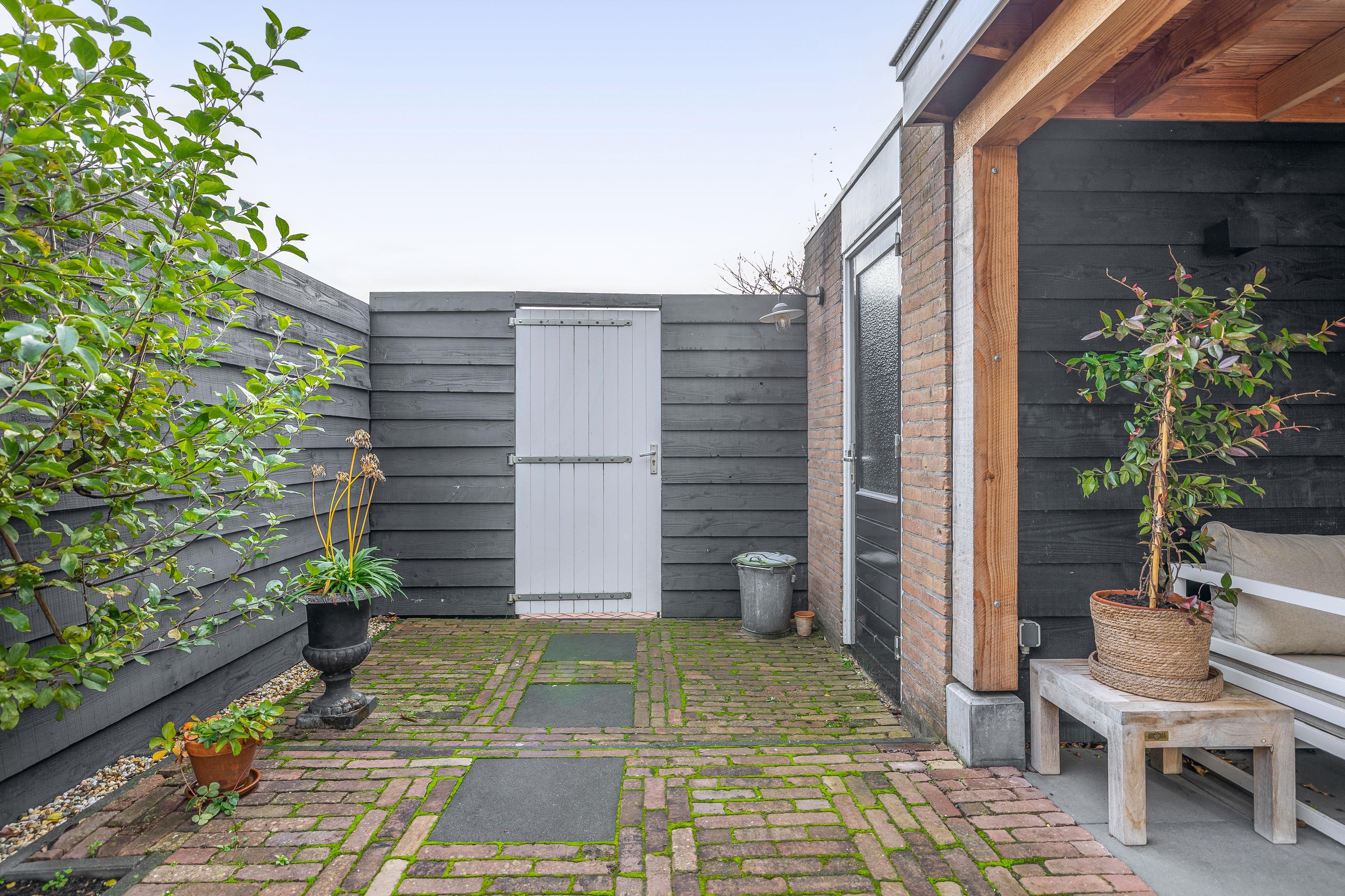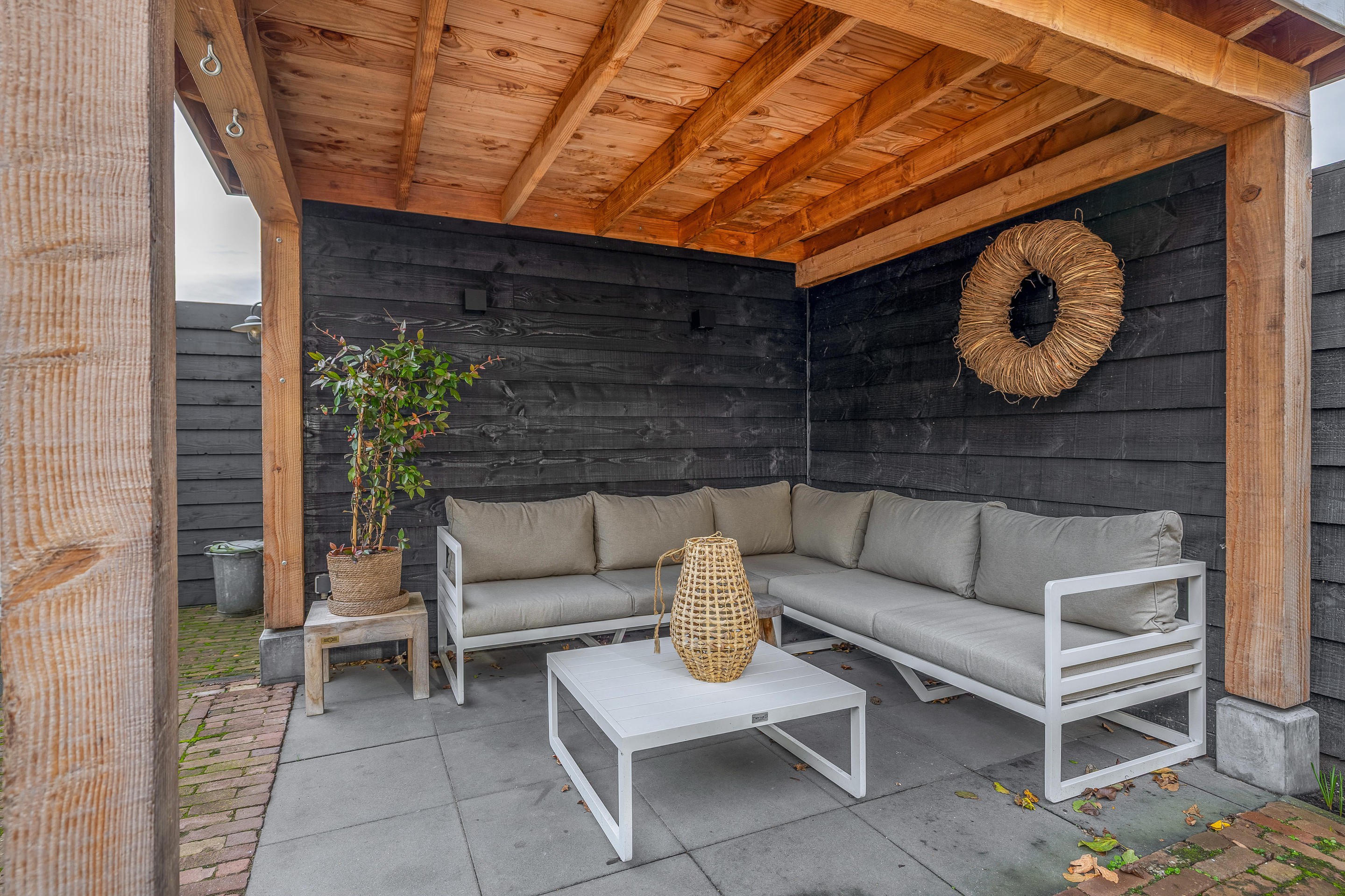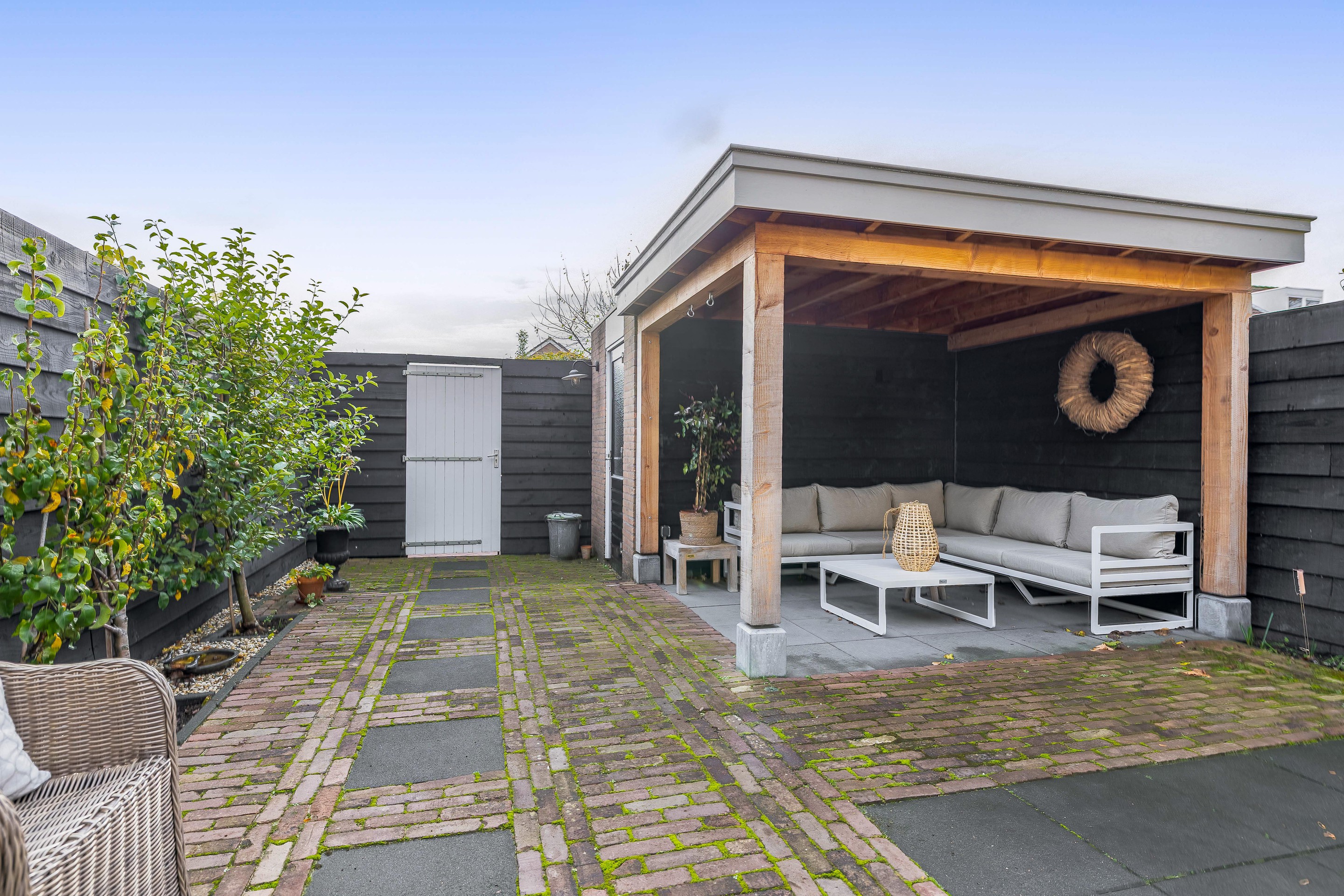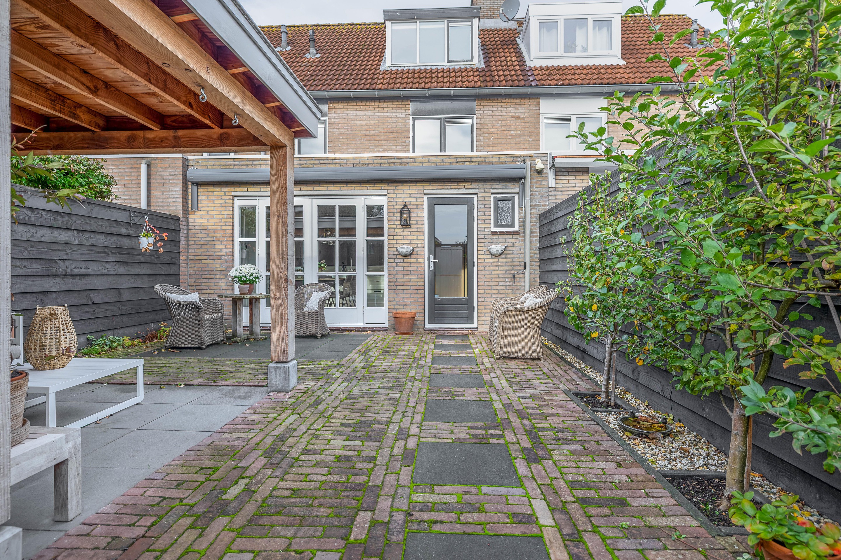 Als je vanuit de hal doorloopt naar buiten, kom je in de mooie en zonnige tuin. De tuin is voorzien van een gezellige veranda, stenen berging en een achterom naar het parkeerterrein. Het straatwerk bestaat uit klinkers en tegels, en de erfafscheiding is uitgevoerd met zwarte potdekseldelen – helemaal passend bij deze leuke tuin. Verder is er buitenverlichting en een groot elektrisch zonnescherm aanwezig.