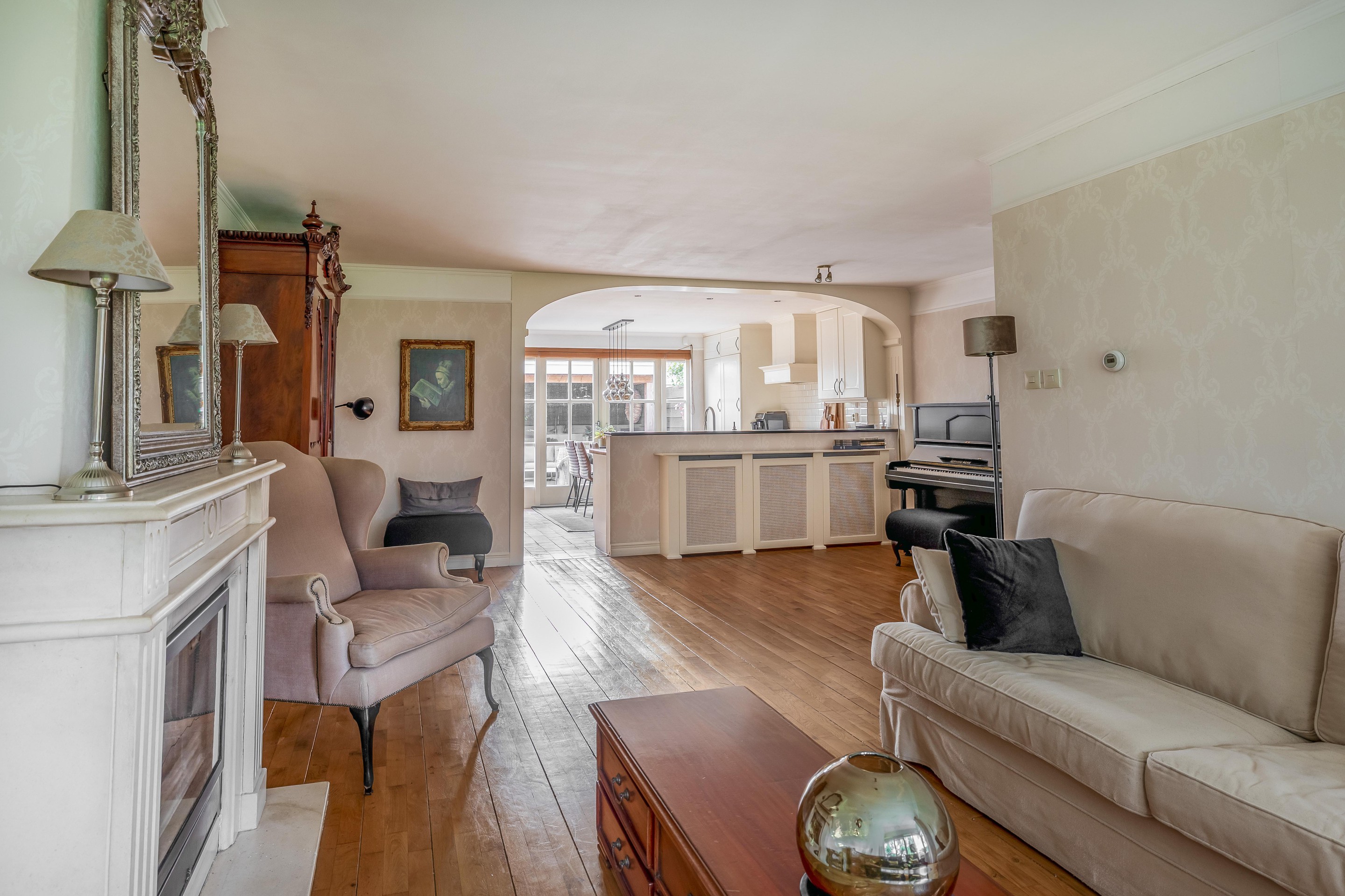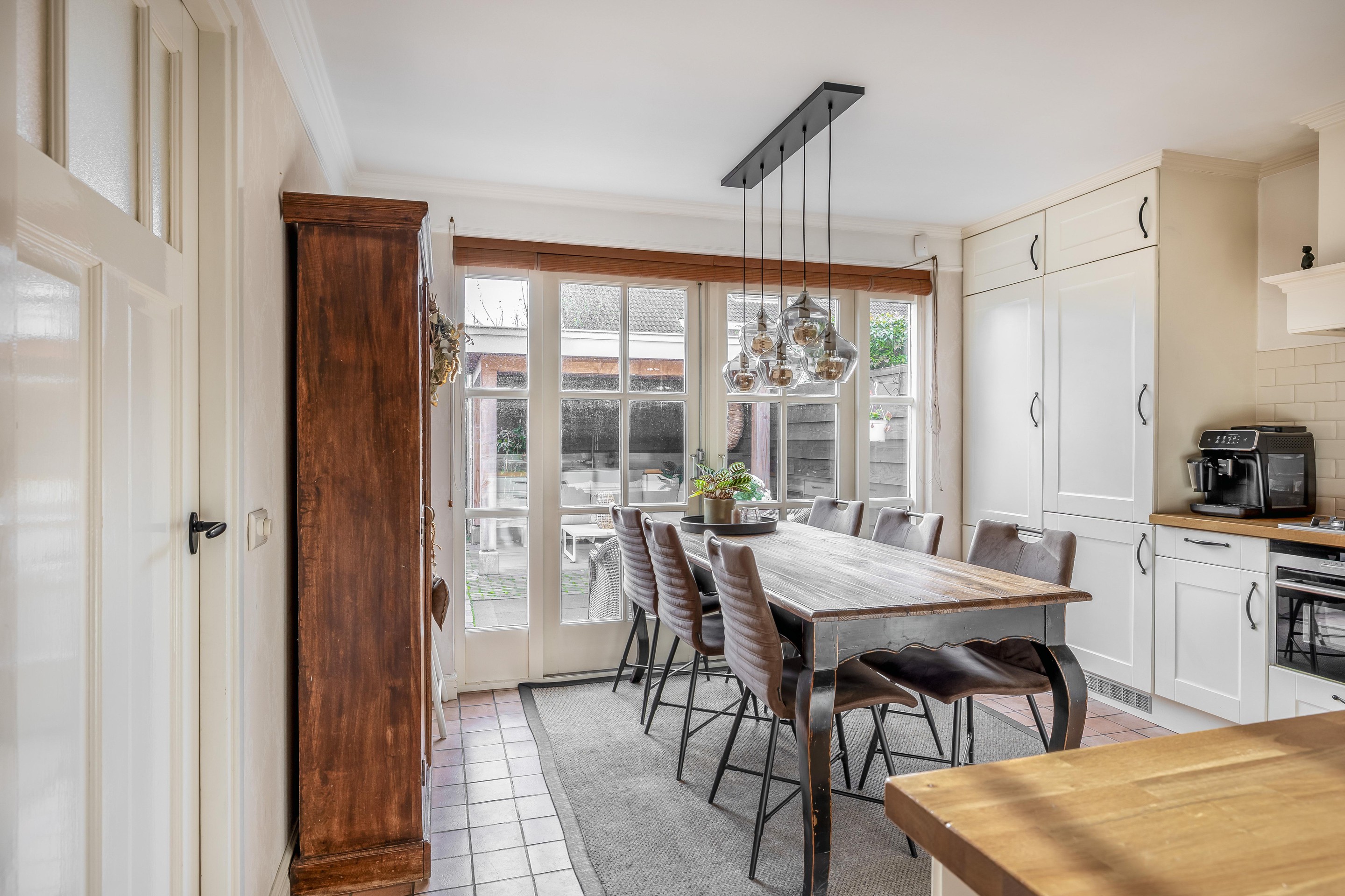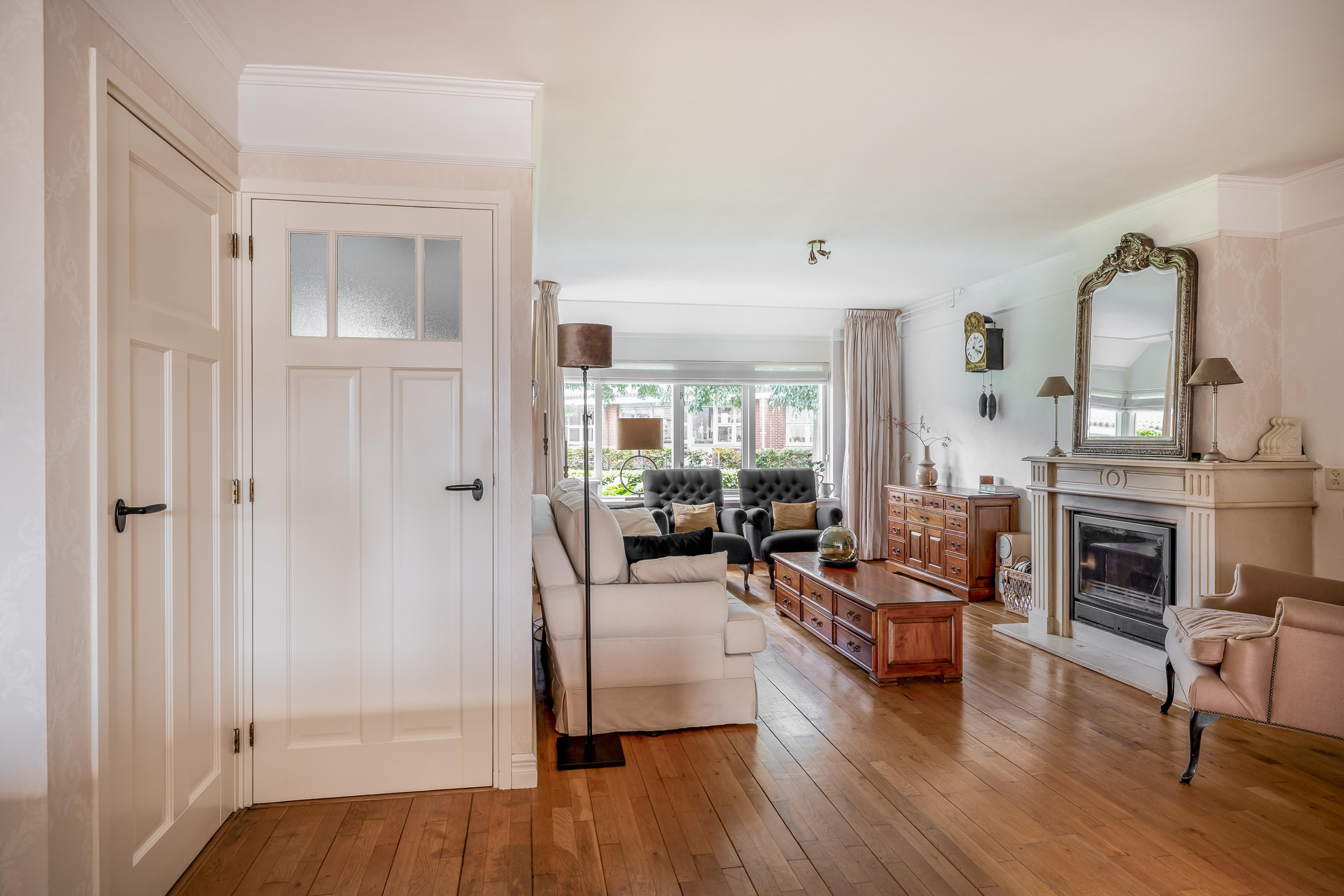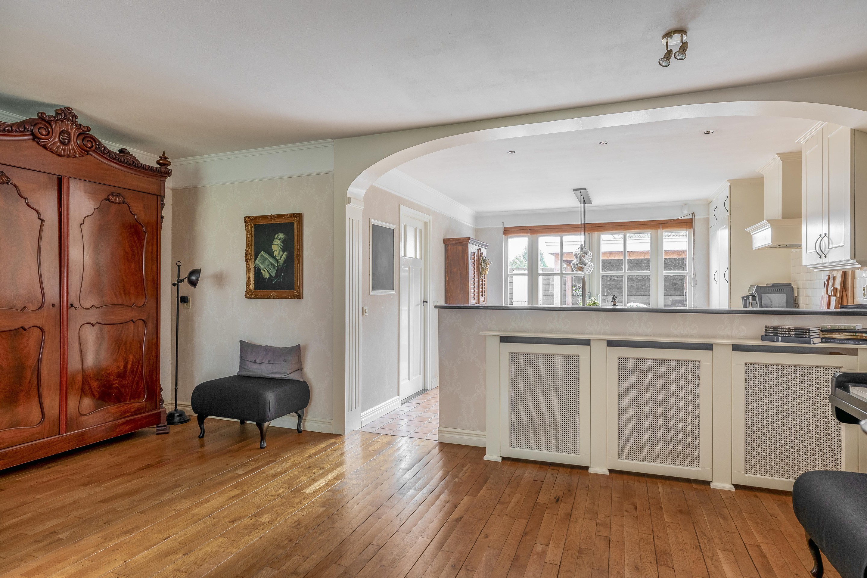 De woonkamer bevindt zich aan de voorzijde, deels in de erker die gedeeld wordt met de buren. De open haard is centraal geplaatst en staat garant voor veel gezellige avonden. De afwerking is in de loop der jaren flink aangepakt, met een houten vloer, fraaie paneeldeuren en lijsten langs de plafonds. Aan de achterzijde van de woning vind je de gezellige woonkeuken, waar je na een dag werken heerlijk kunt aanschuiven. Er is genoeg ruimte voor een flinke eettafel en in de zomer kunnen de openslaande deuren open, zodat de tuin mooi bij de keuken wordt betrokken.