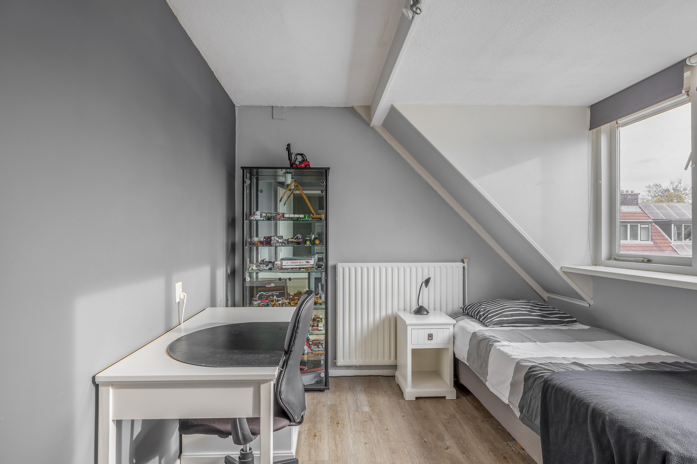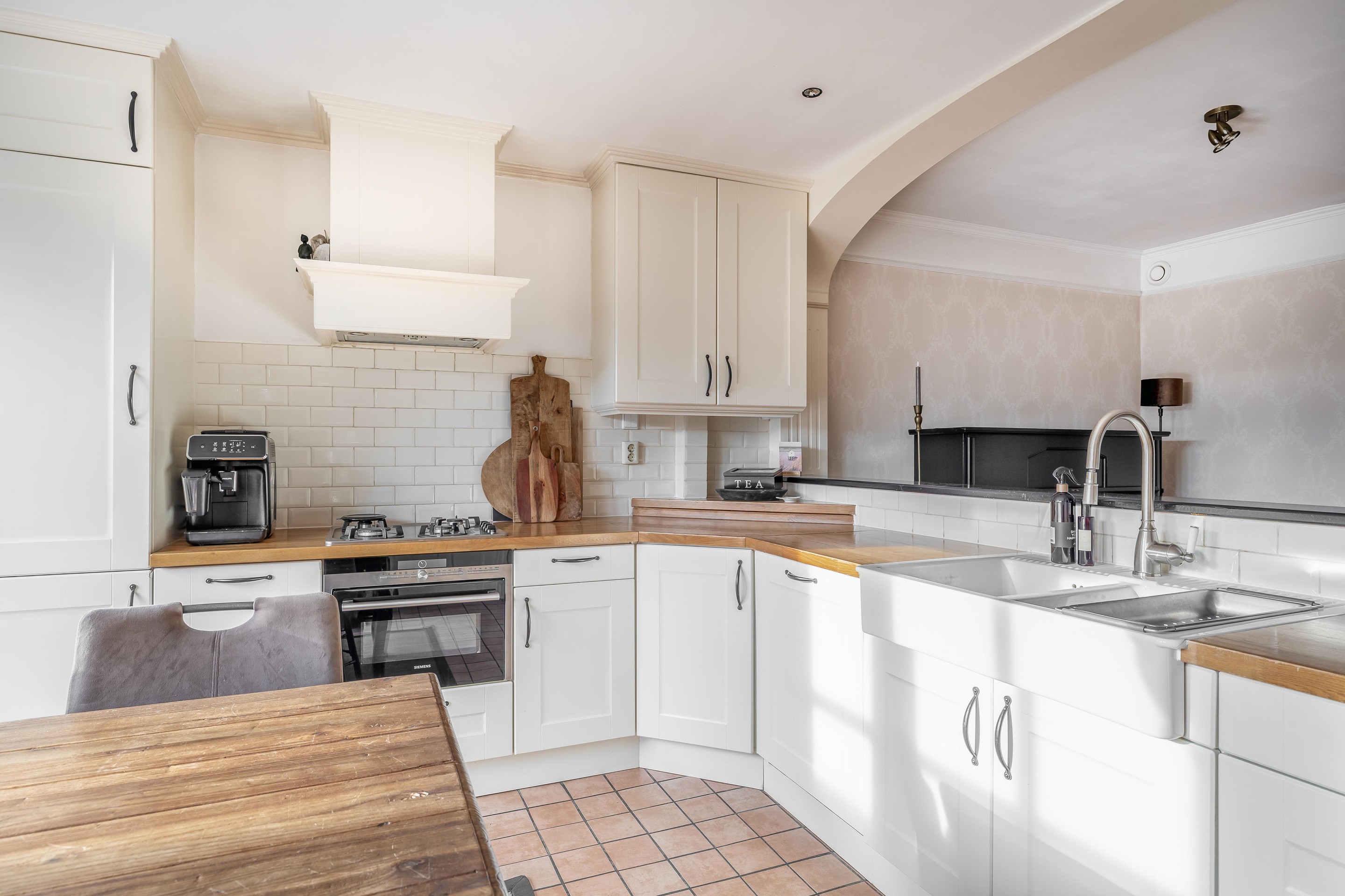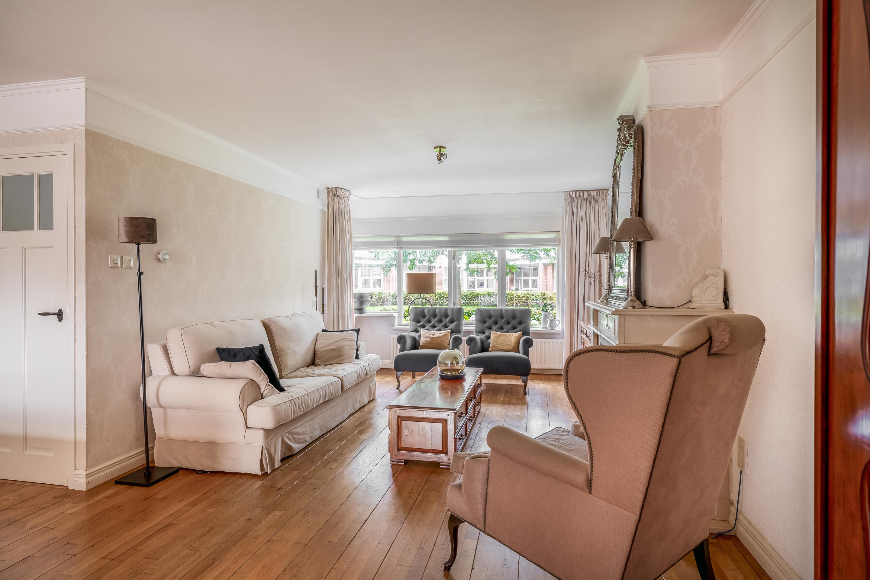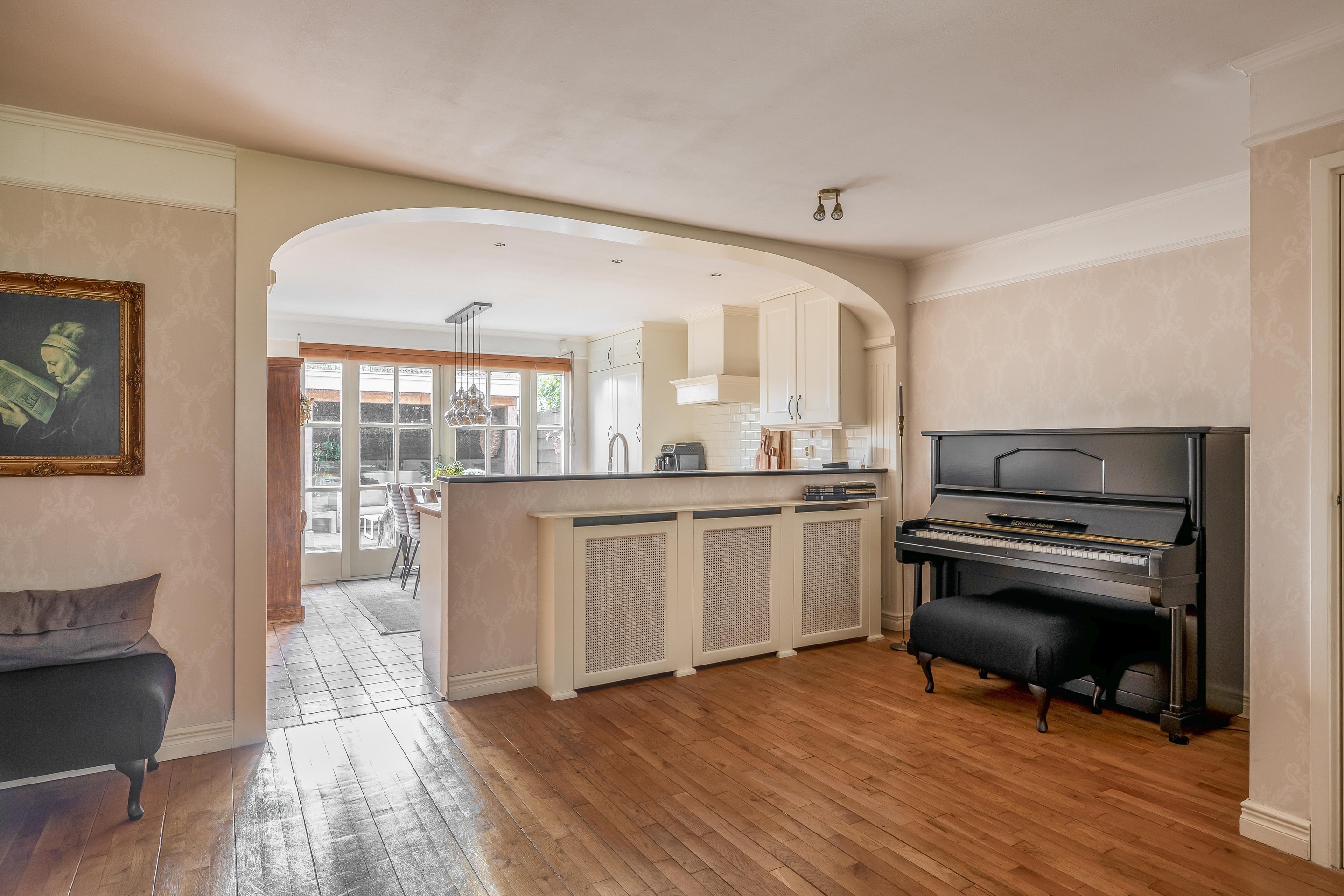 De woonkamer bevindt zich aan de voorzijde, deels in de erker die gedeeld wordt met de buren. De open haard is centraal geplaatst en staat garant voor veel gezellige avonden. De afwerking is in de loop der jaren flink aangepakt, met een houten vloer, fraaie paneeldeuren en lijsten langs de plafonds. Aan de achterzijde van de woning vind je de gezellige woonkeuken, waar je na een dag werken heerlijk kunt aanschuiven. Er is genoeg ruimte voor een flinke eettafel en in de zomer kunnen de openslaande deuren open, zodat de tuin mooi bij de keuken wordt betrokken.