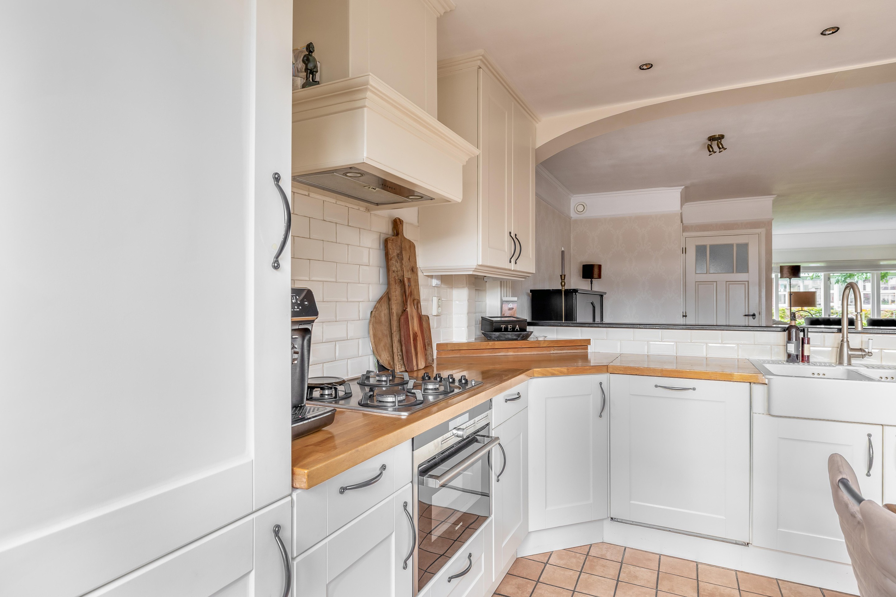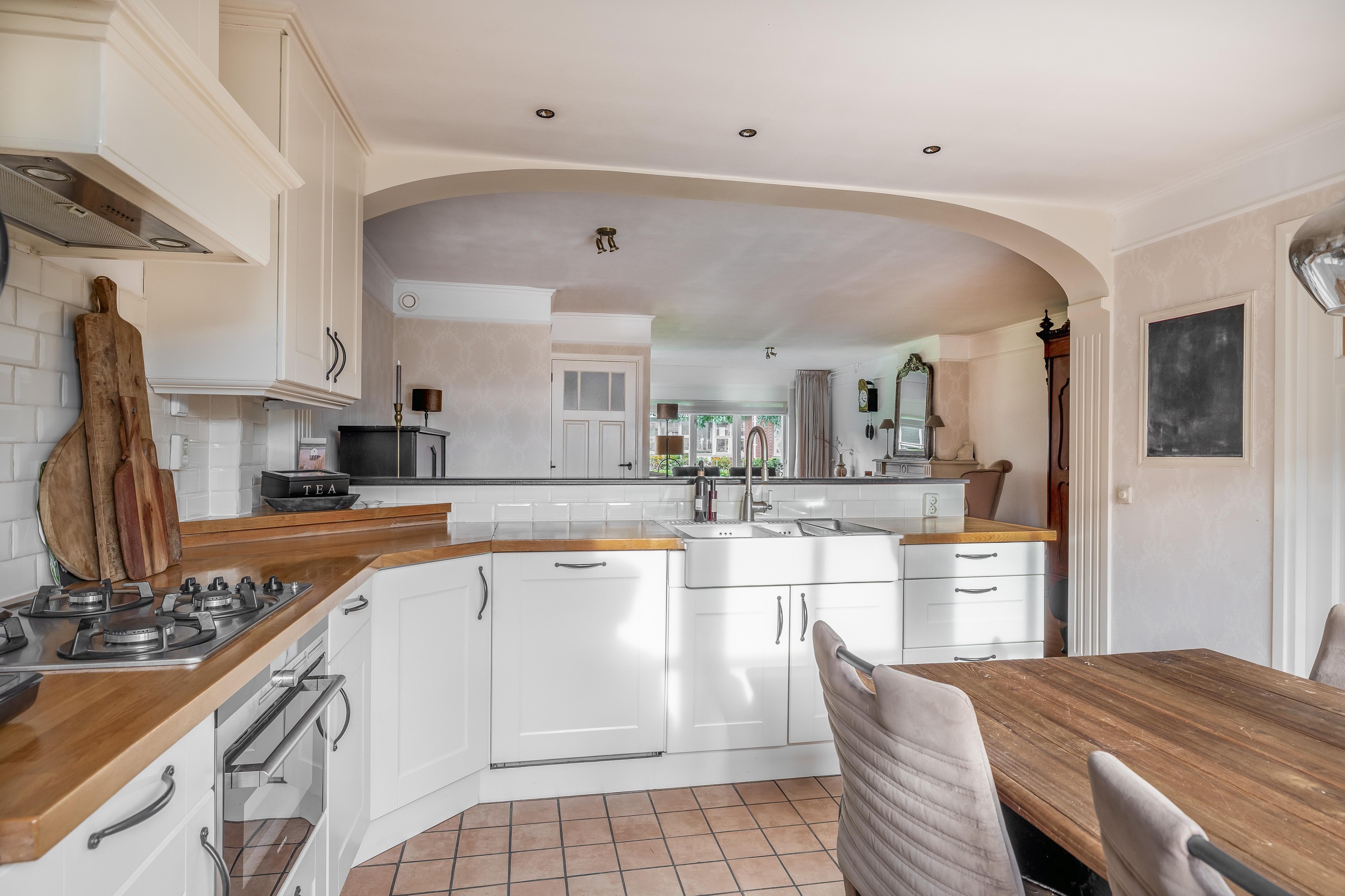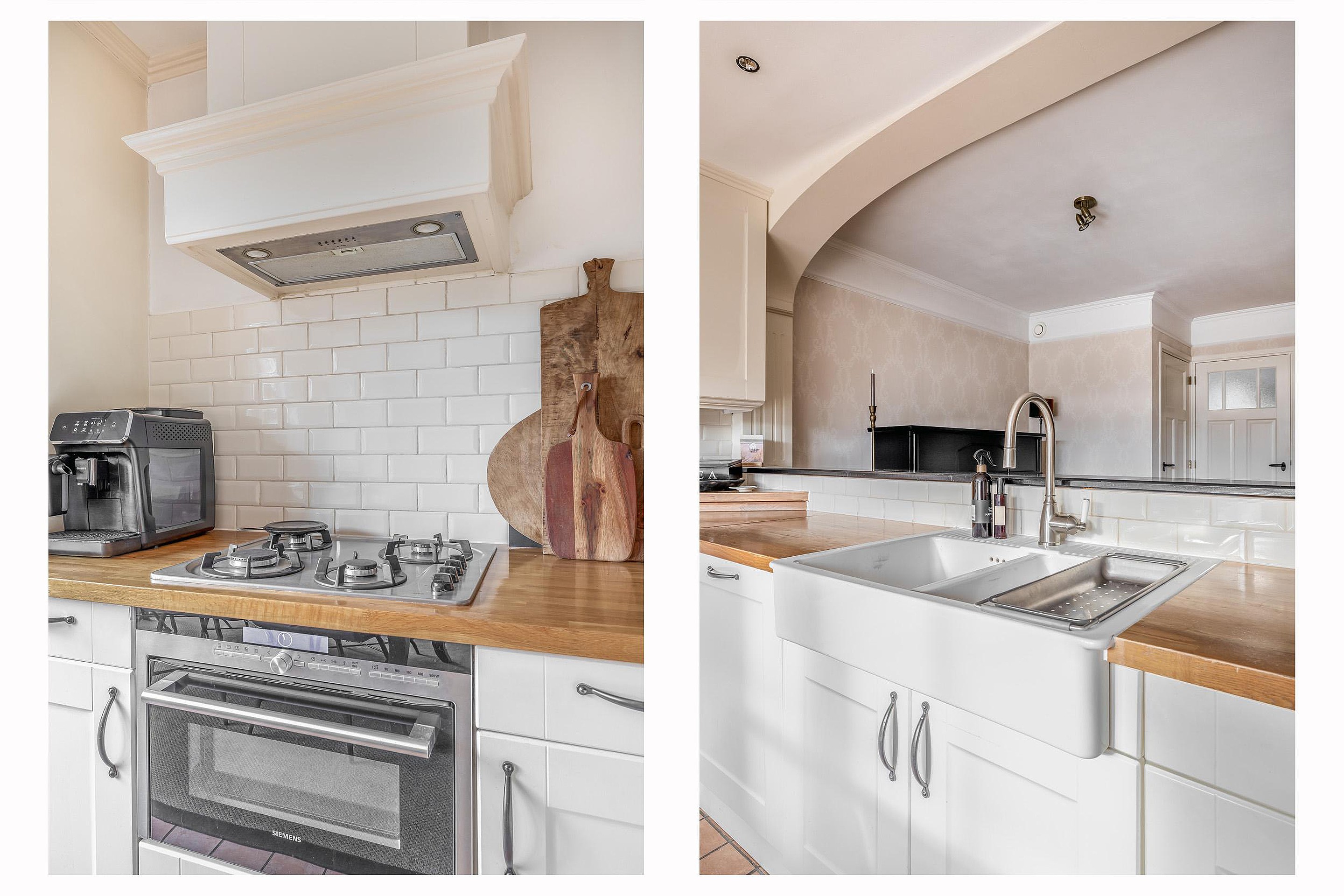 De keuken zelf staat in een grote L-opstelling en heeft een landelijk karakter. De apparatuur – waaronder een vaatwasser, gaskookplaat en combimagnetron – is netjes ingebouwd. Het houten werkblad is voorzien van een gaskookplaat en een dubbele stenen spoelbak. De ruimte is afgescheiden van de woonkamer middels een wand van circa 1,5 meter hoog en een halfronde toog over de volledige breedte.