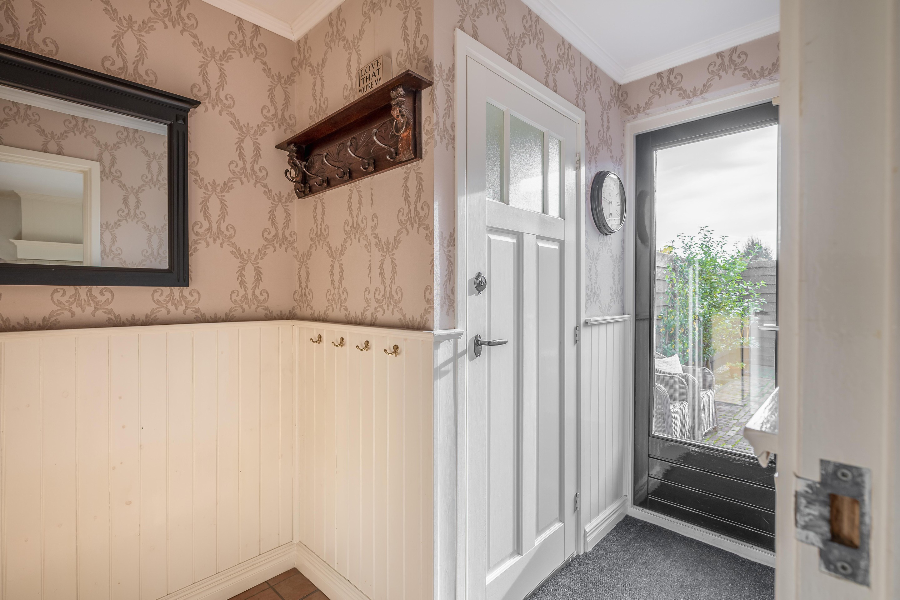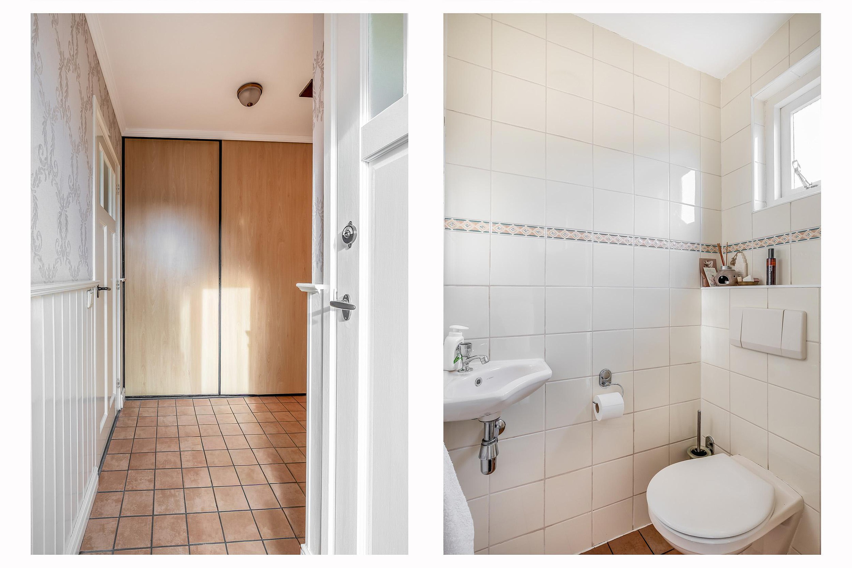 Naast de keuken bevindt zich de hal naar de tuin. Deze is nu voorzien van een toilet en veel kastruimte in een schuifdeurenkast. Ook deze hal is weer fraai afgewerkt met een tegelvloer, lambrisering en een nette plafondafwerking. Het toilet is geheel betegeld en voorzien van een hangend closet en wastafeltje.