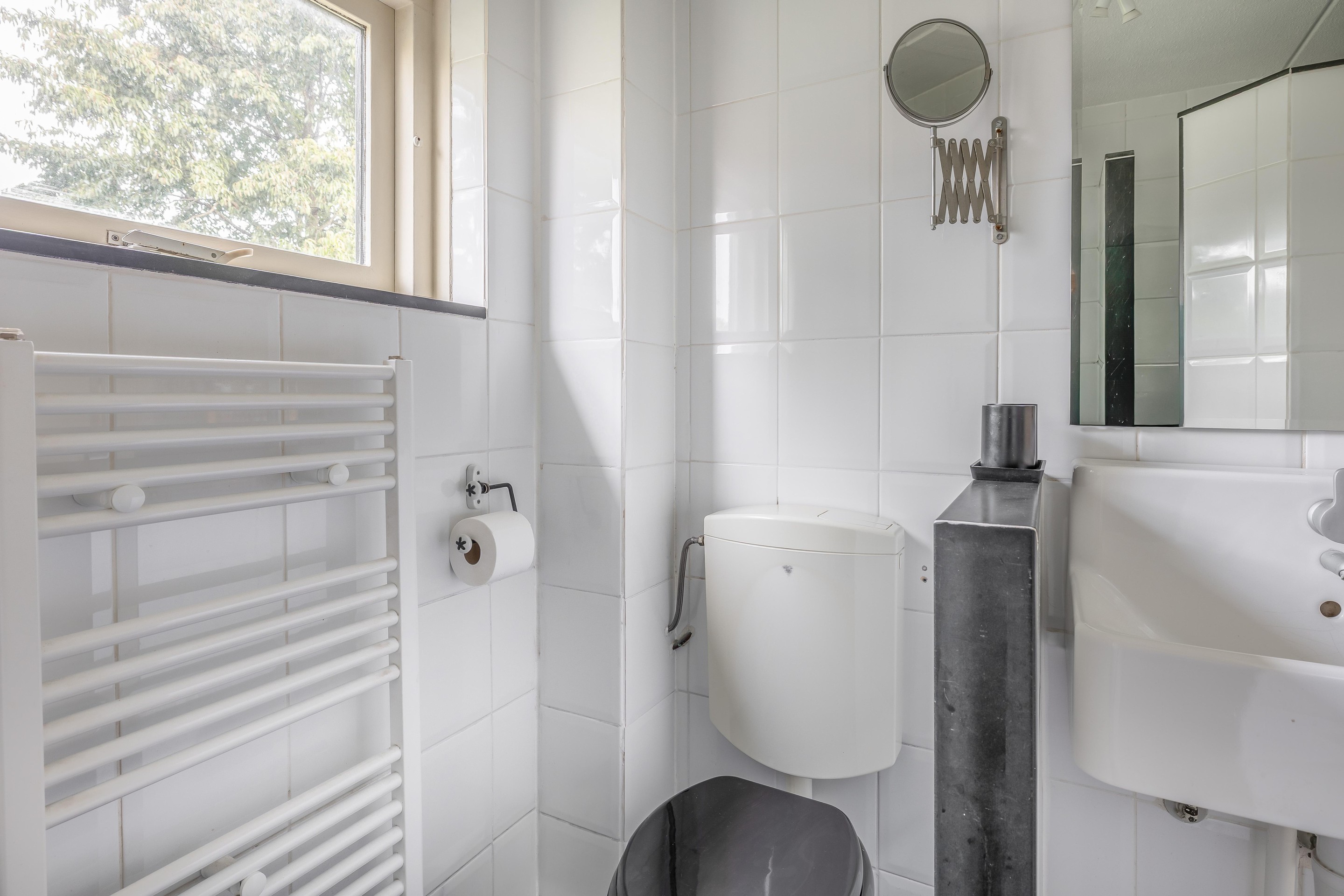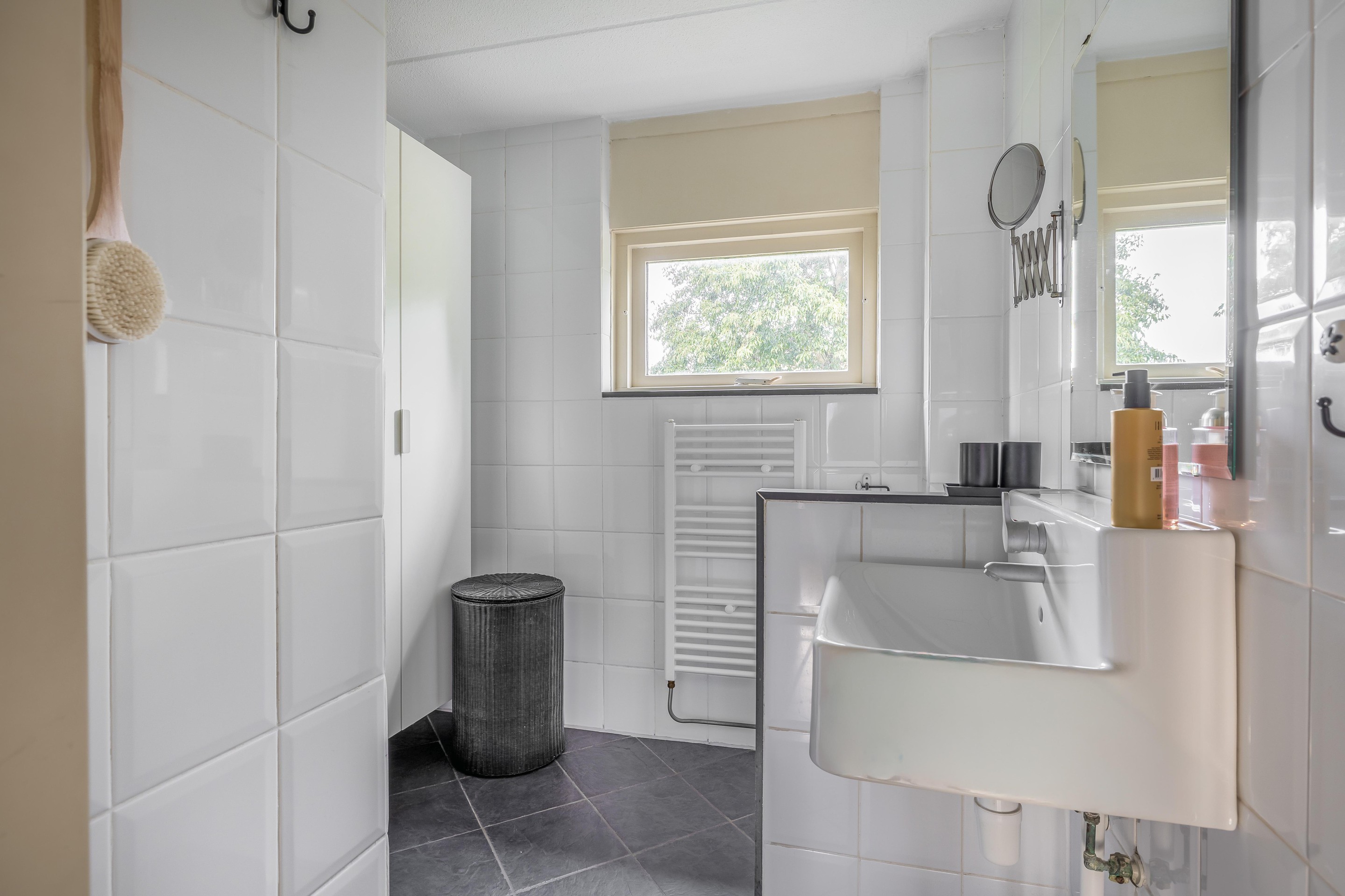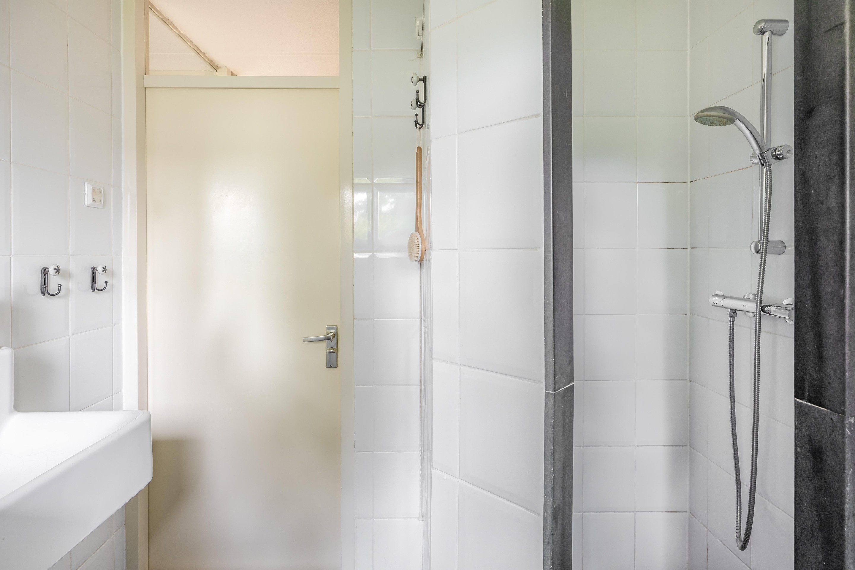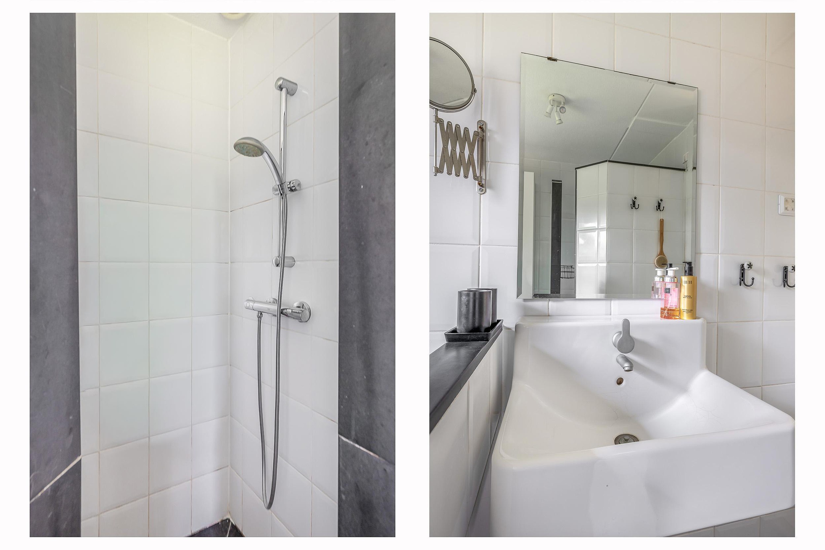 De badkamer meet 213 x 211 cm en is voorzien van een gemetselde inloopdouche, een hangend closet en een wastafel. De ruimte is geheel betegeld en beschikt over zowel mechanische ventilatie als een openslaand raam.