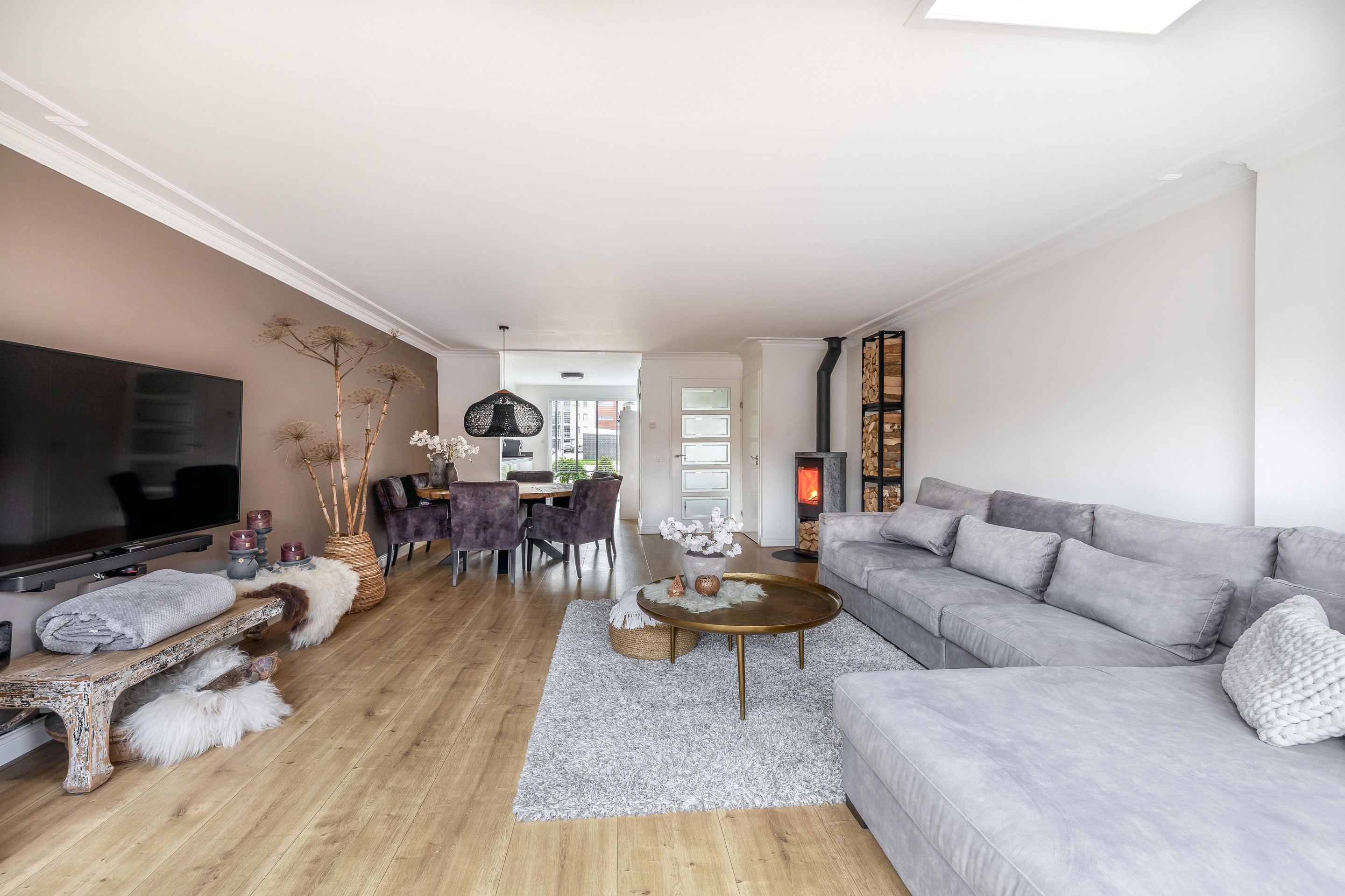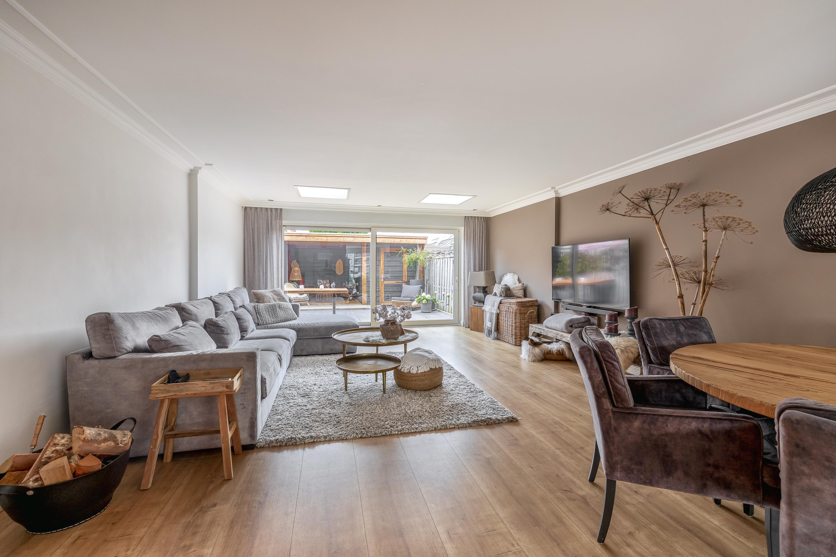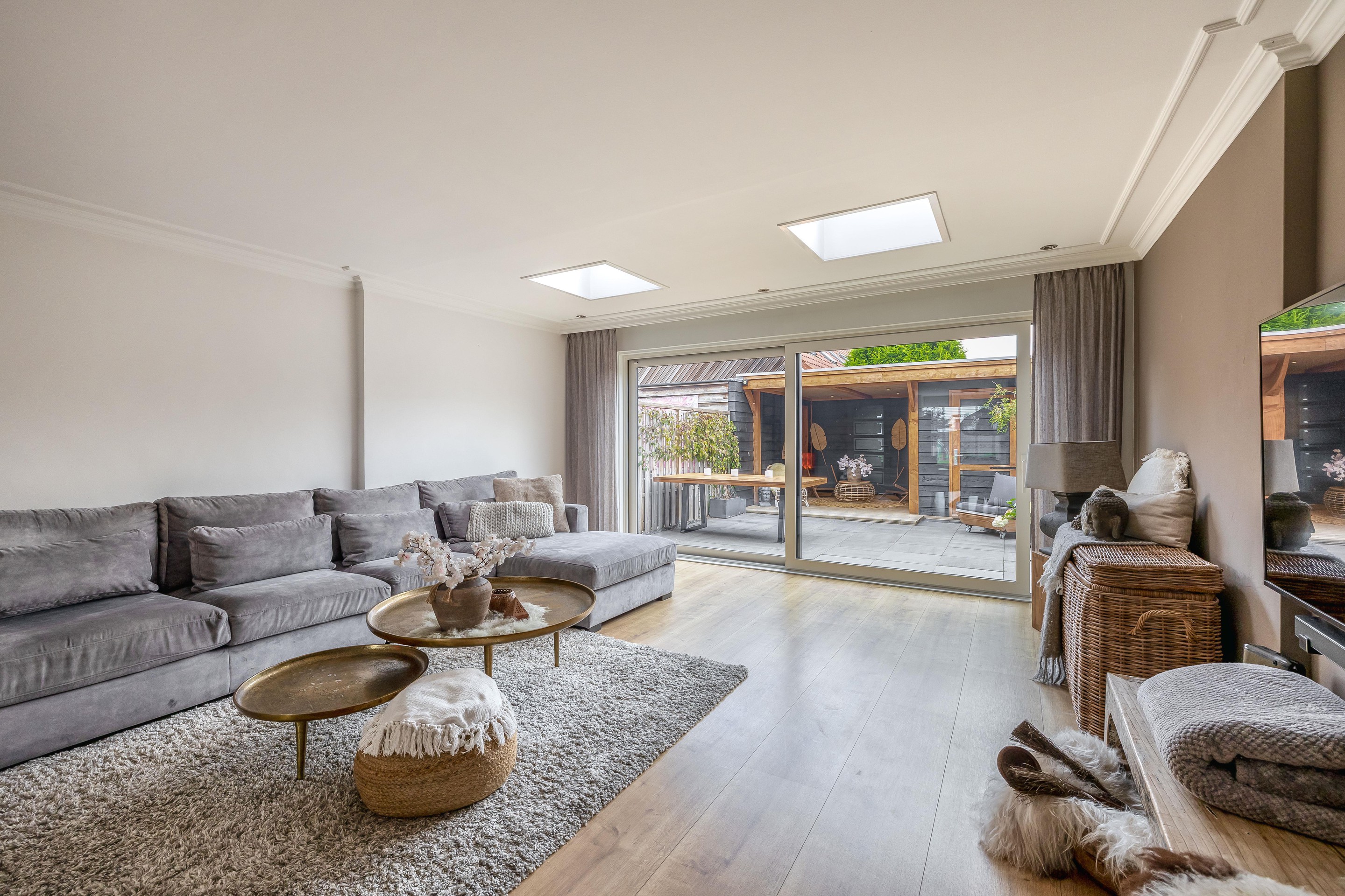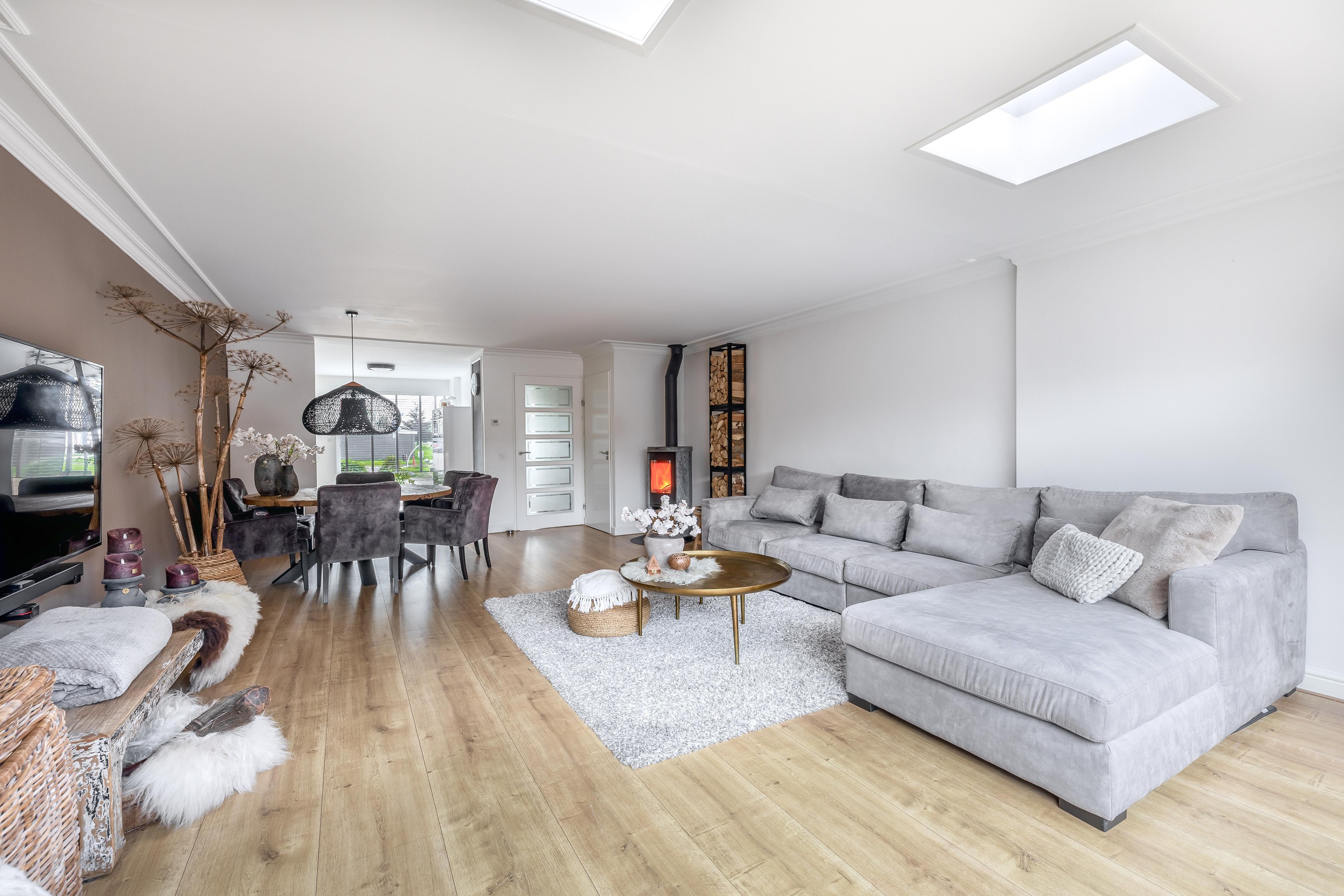 De uitgebouwde woonkamer is een ware blikvanger. Door de uitbouw is de ruimte royaal en licht, mede dankzij de twee dakramen in het uitbouw. Vanuit hier heb je via een grote kunststof schuifpui (geplaatst in 2024) direct toegang tot de achtertuin. Onder de trap bevindt zich een ruime trapkast voor extra opbergruimte.