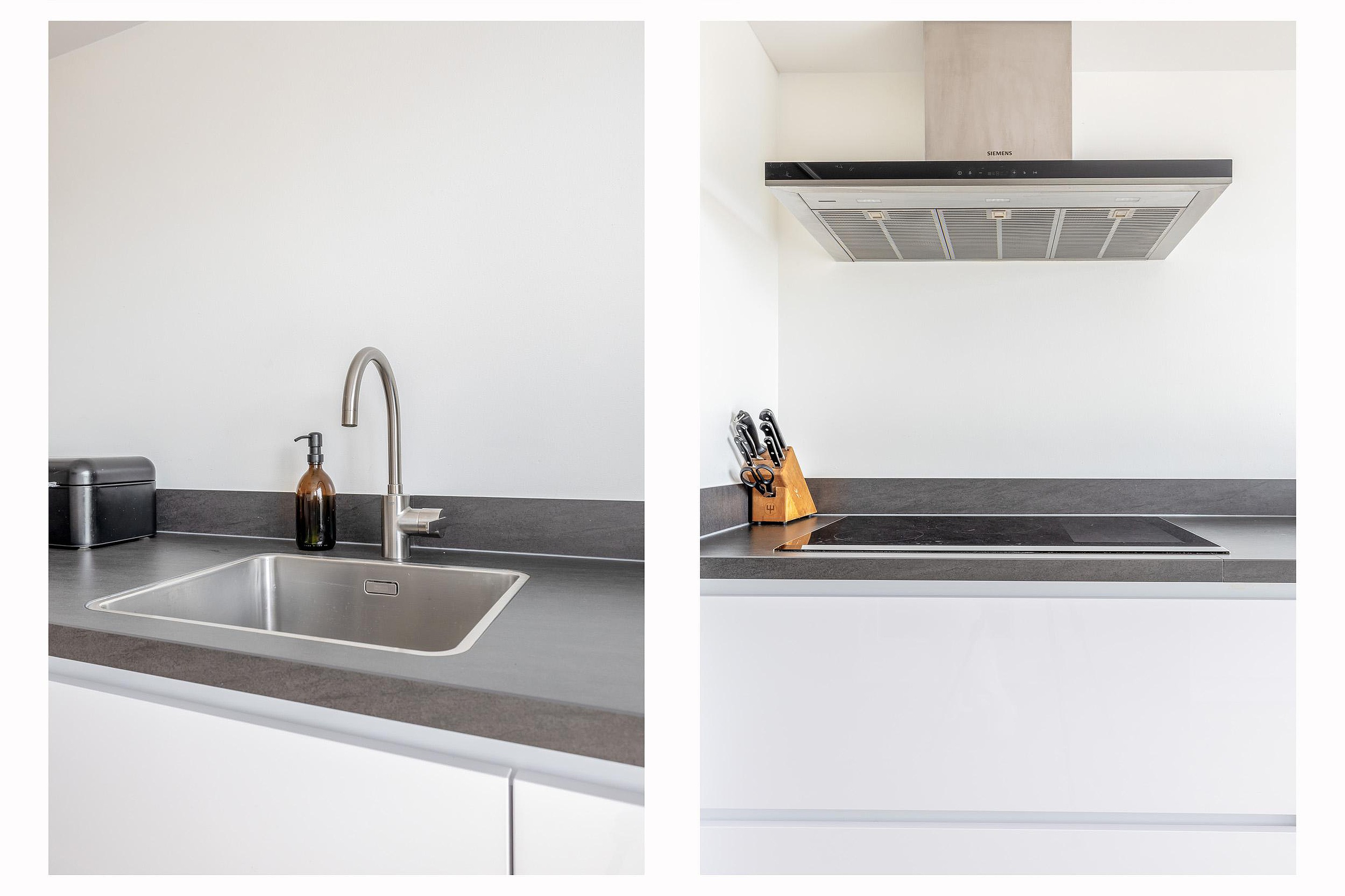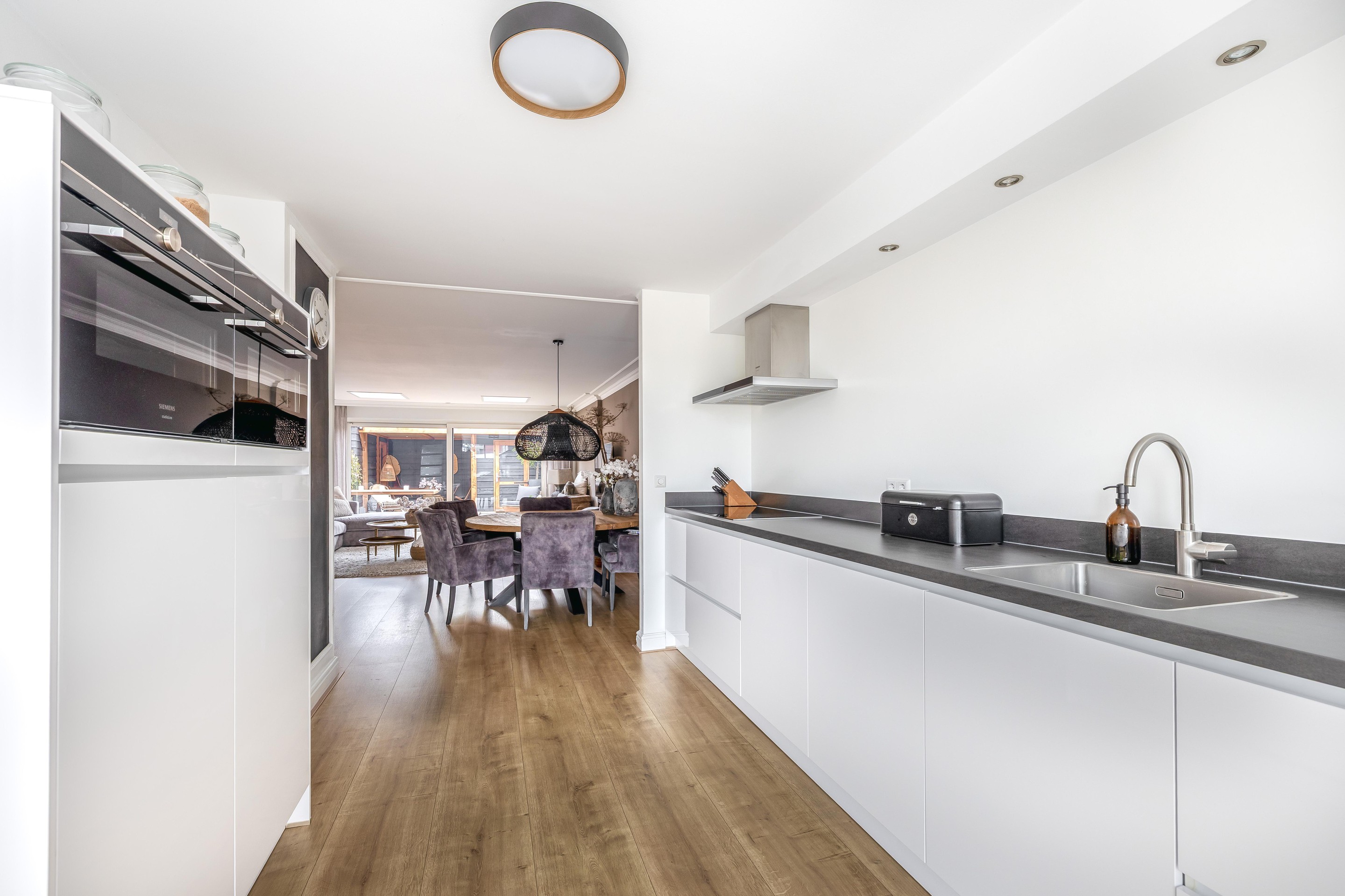 Aan de voorzijde van het huis is de ruime keuken gesitueerd, met uitzicht op de straat. De huidige eigenaren koken graag en dat zie je terug in de complete en praktische keukenopstelling. Deze keuken, in een rechte opstelling met een aparte apparatenwand, is voorzien van alle denkbare inbouwapparatuur: een 5-pits inductiekookplaat, afzuigkap, oven, combi-oven/magnetron, vaatwasser, koelkast en een vriezer.
