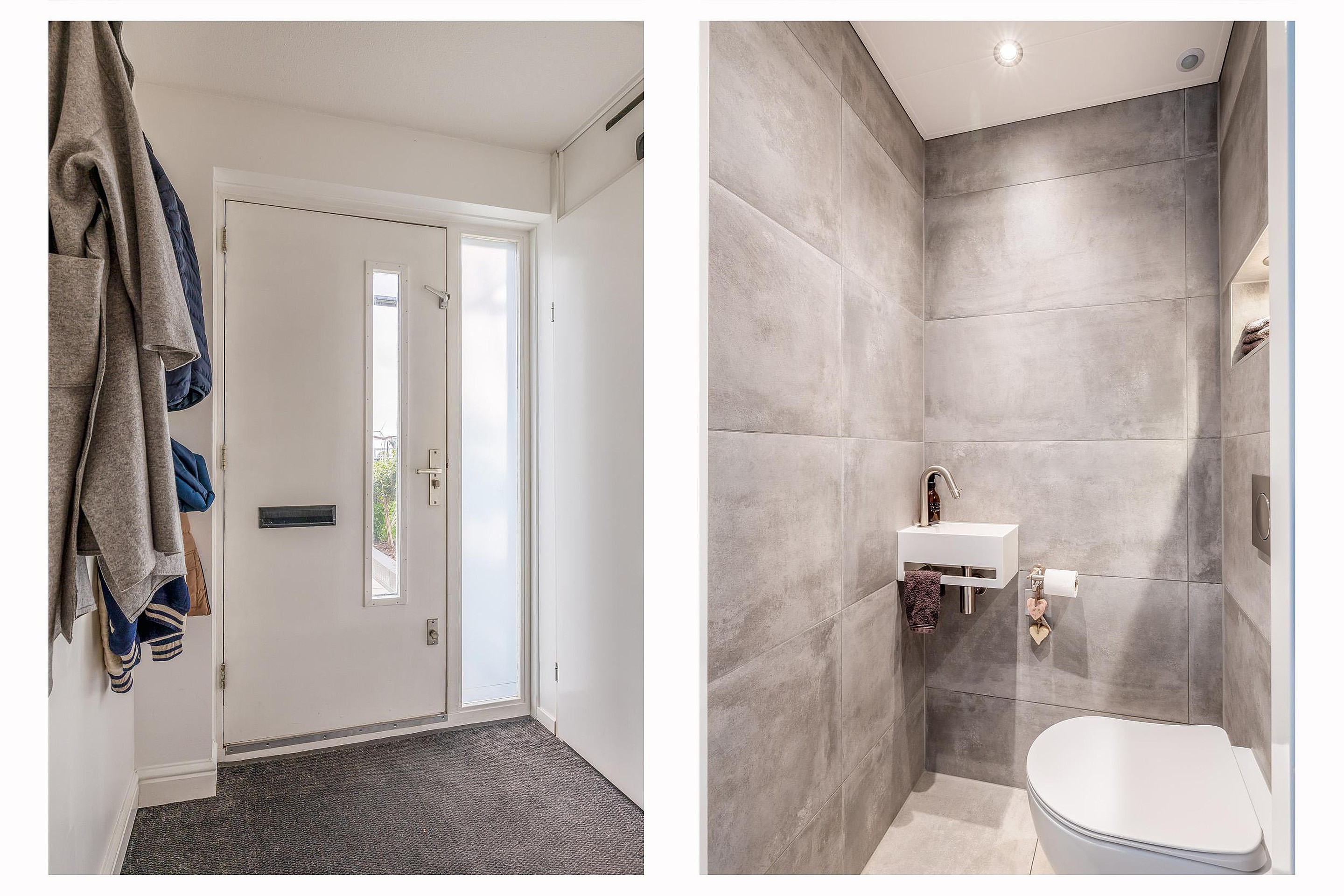 Begane grond Bij binnenkomst in de woning betreed je de entree/hal met de meterkast, die is voorzien van 11 groepen en 2 aardlekschakelaars. Hier vind je ook een modern, geheel betegeld toilet met een vrijhangend toilet en fonteintje, en een fraai afgewerkte trap naar de eerste verdieping.