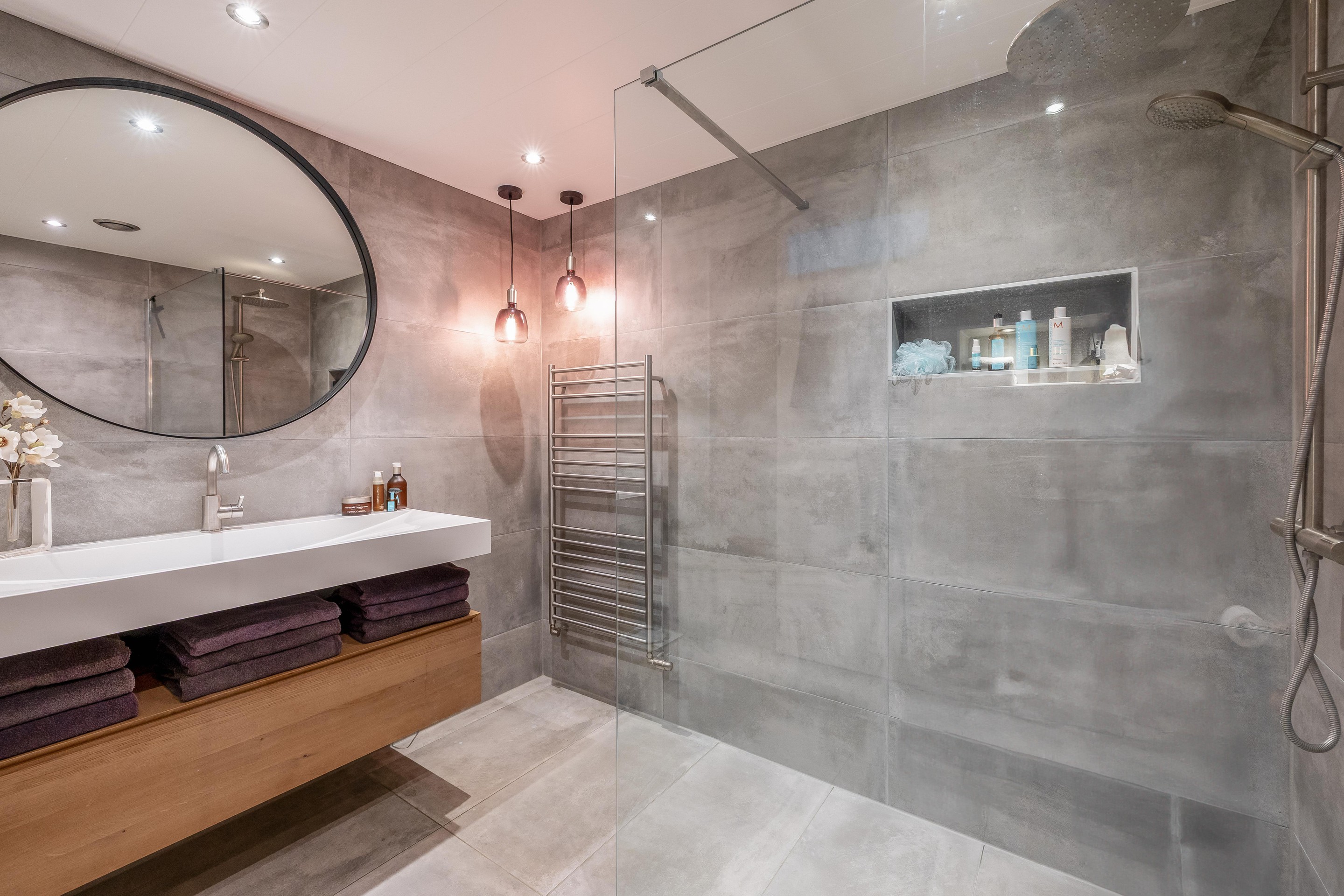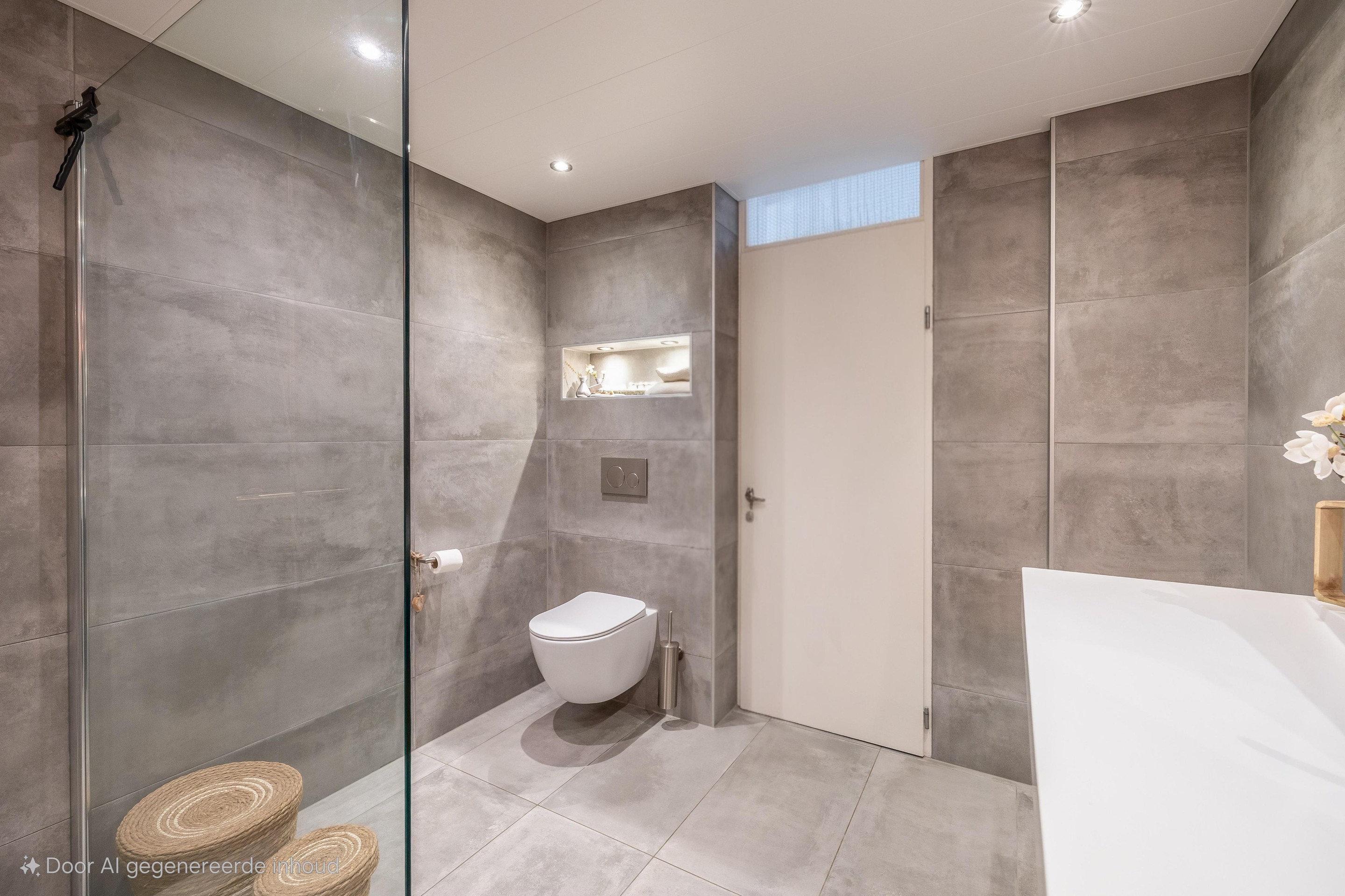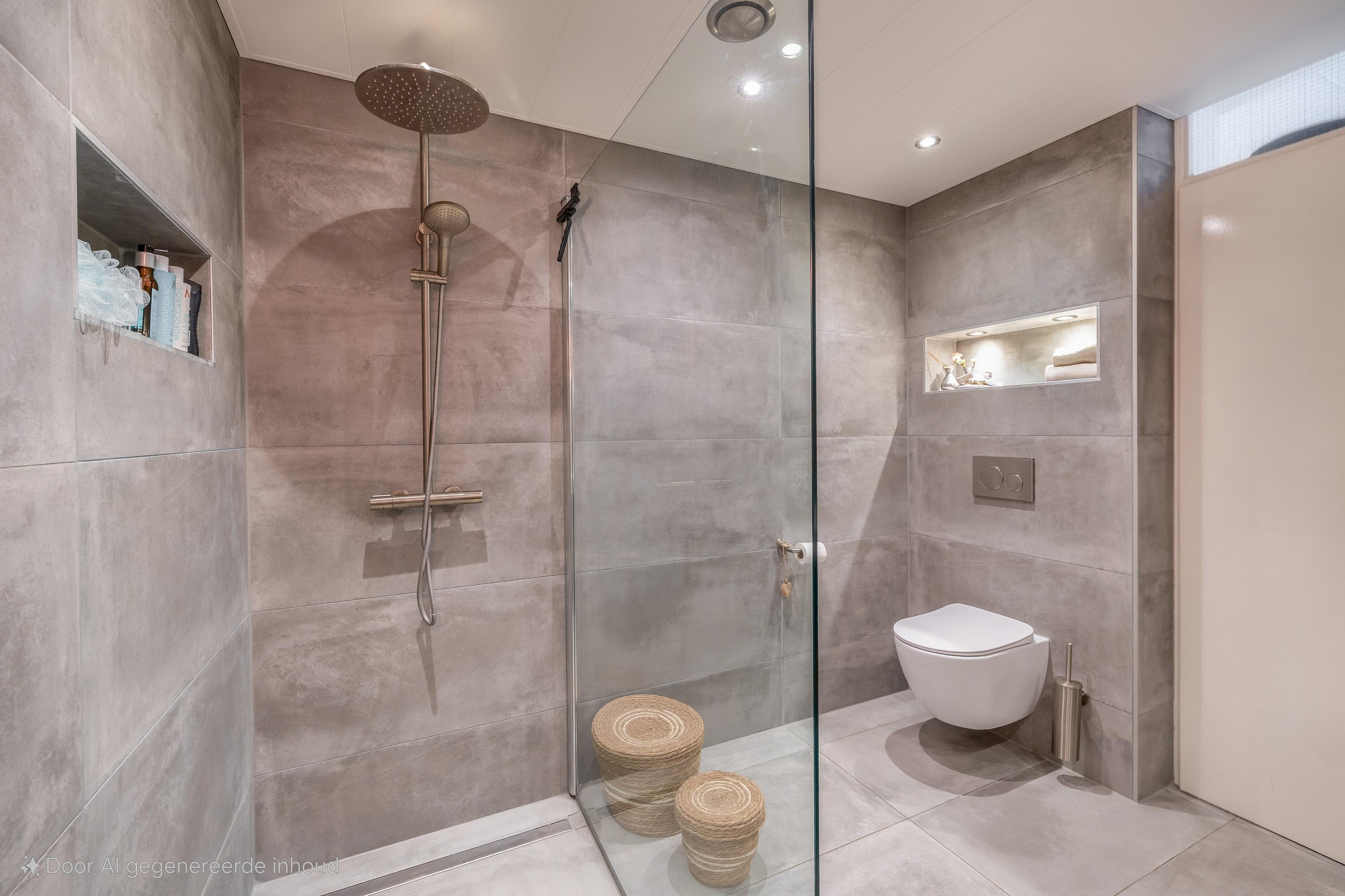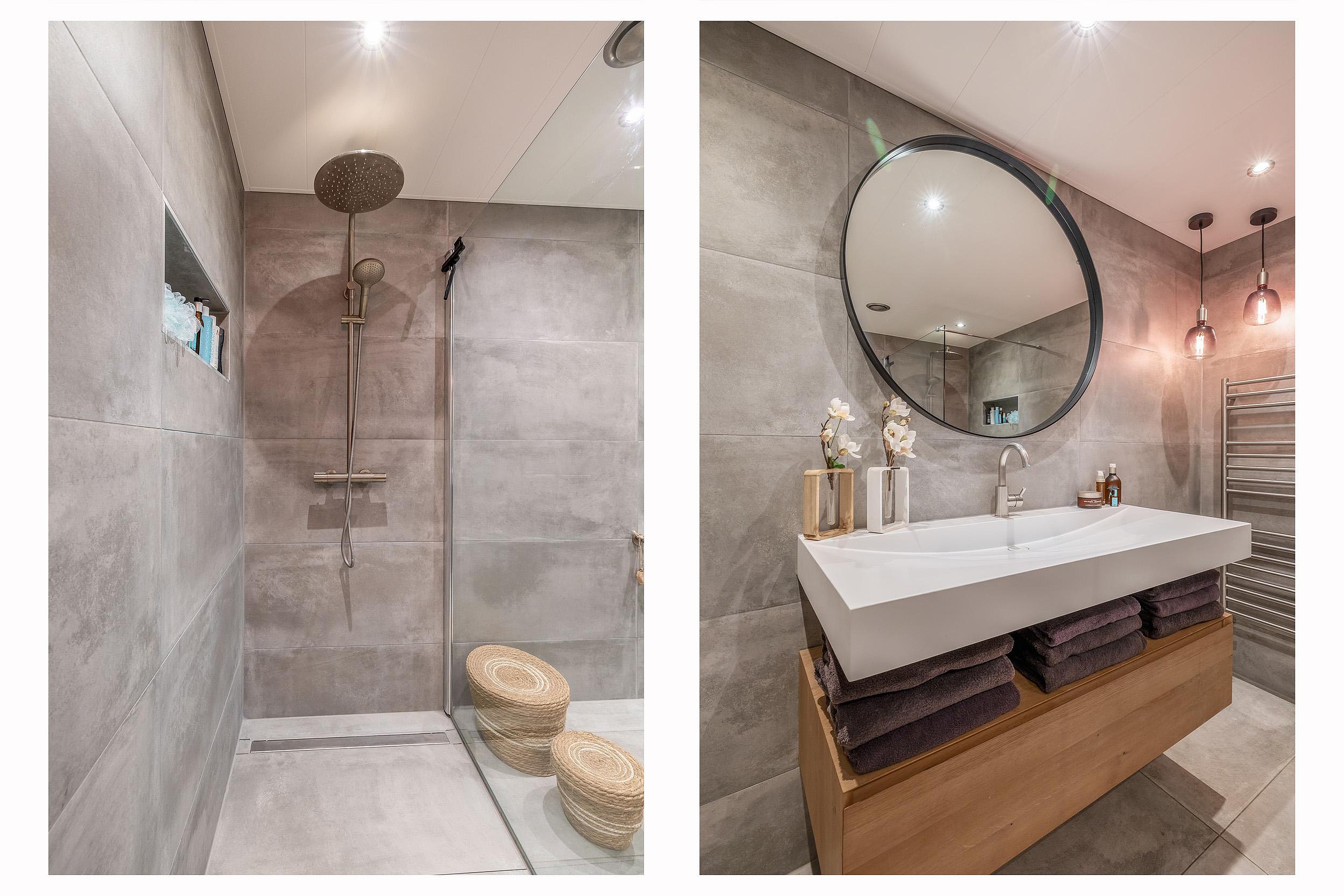 De badkamer is ruim opgezet en van alle gemakken voorzien. De kamer is volledig betegeld en heeft een moderne uitstraling. Je vindt er een inloopdouche met glazen wand, een breed wastafelmeubel met een grote spiegel en een toilet. De spotjes in het plafond maken het geheel af.