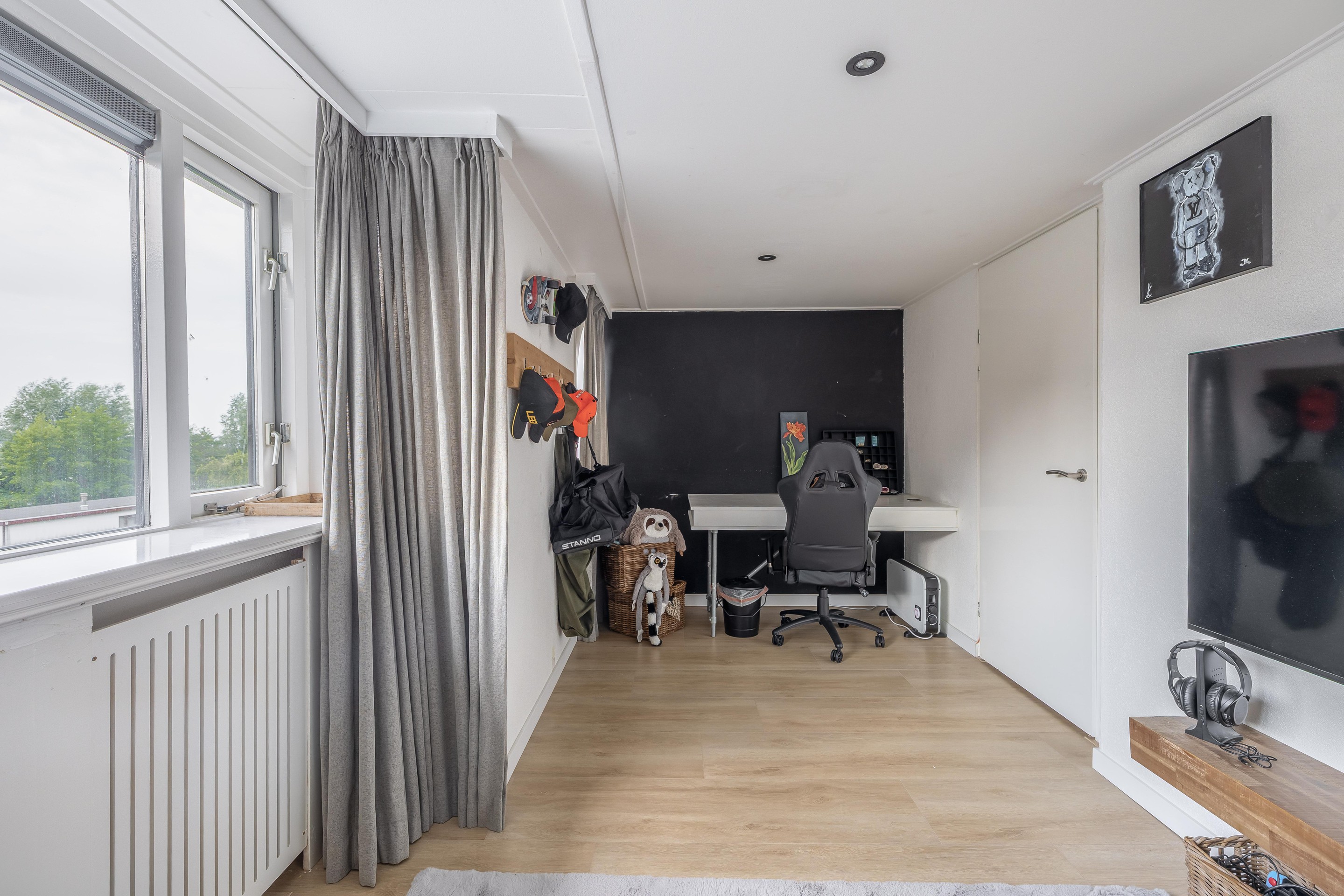 Deze achterste slaapkamer heeft een leuke extra: een open zolder die je met een trapje bereikt. In een handige inbouwkast zijn de cv-installatie en de aansluitingen voor de wasmachine en droger netjes weggewerkt.