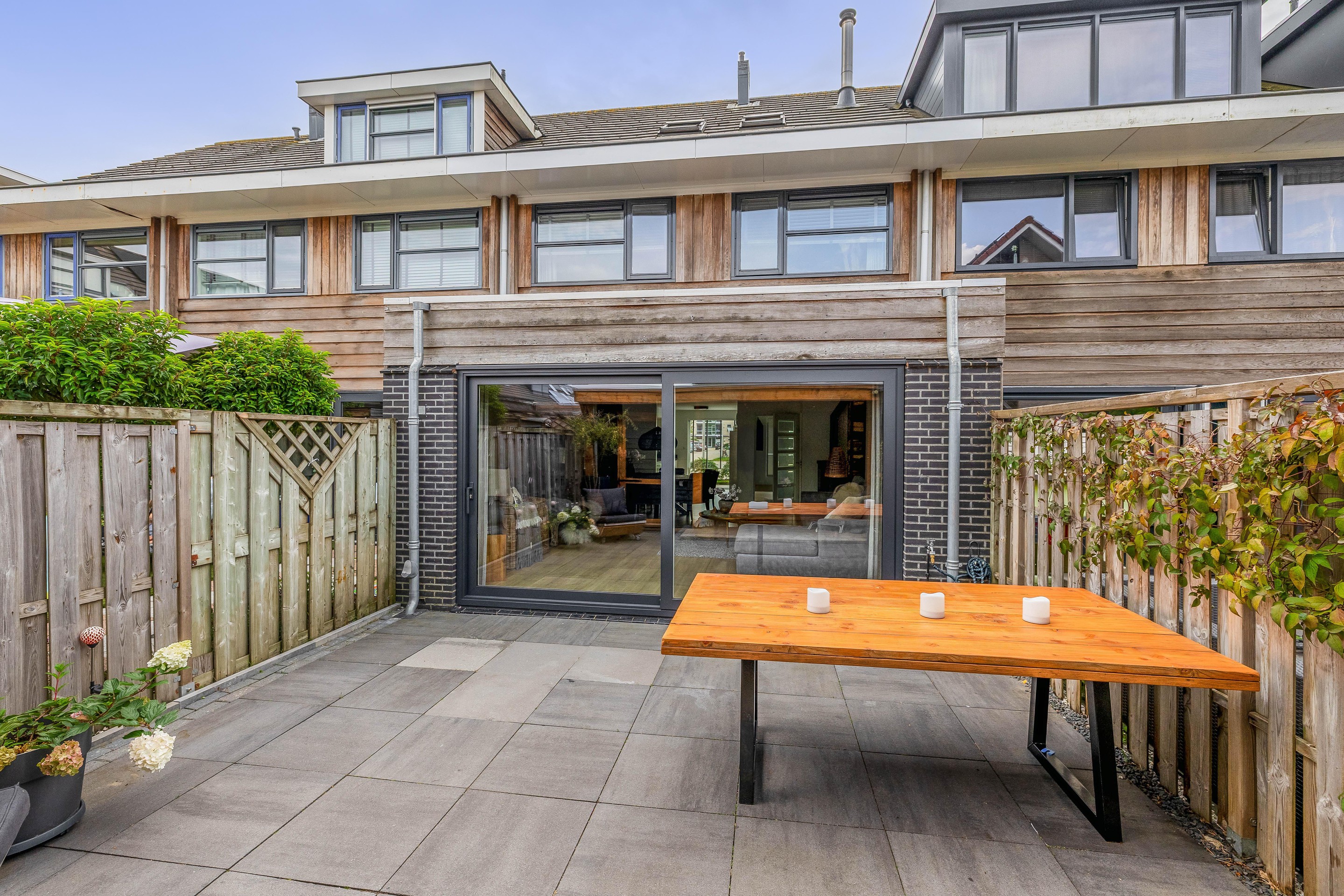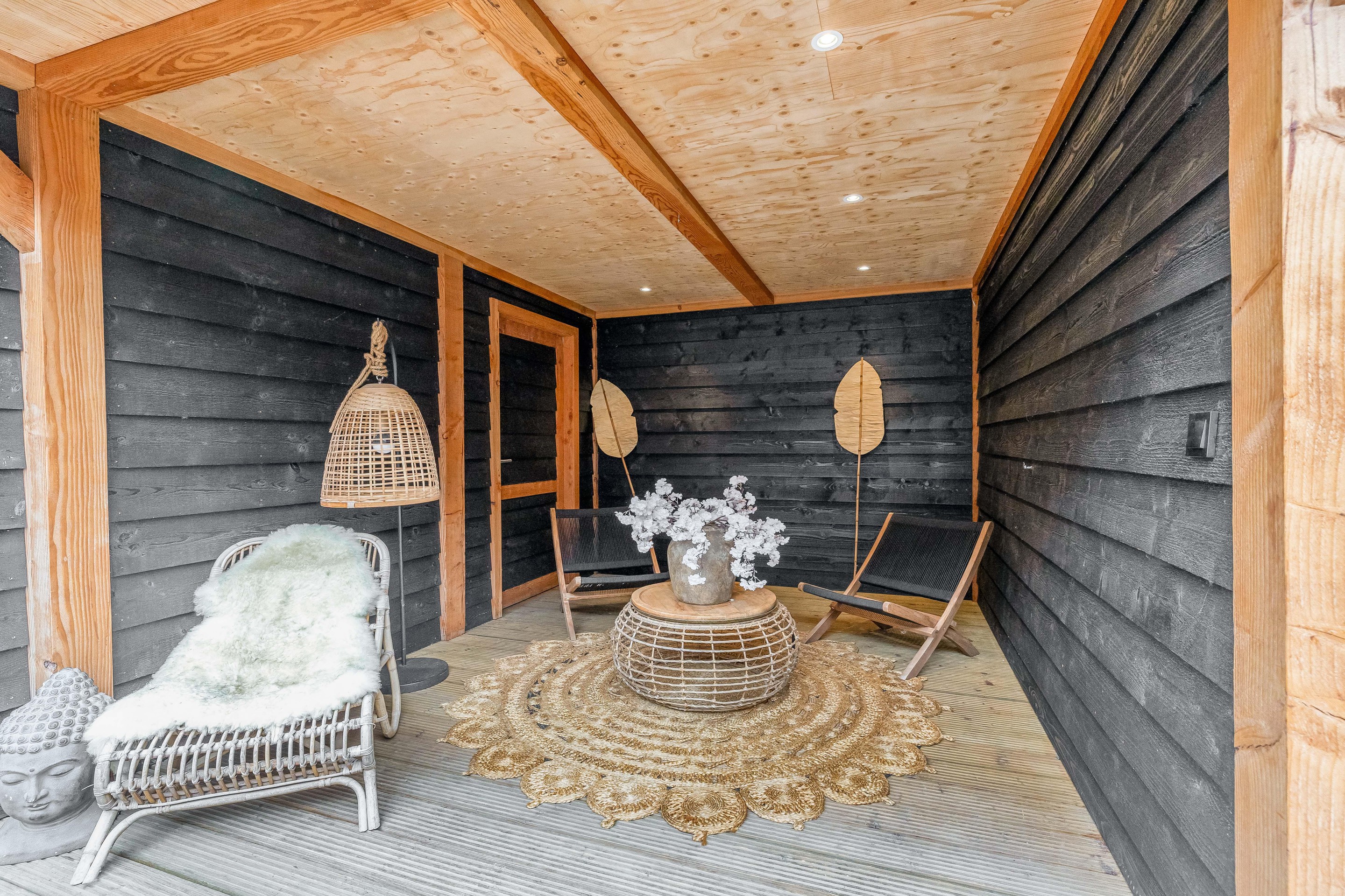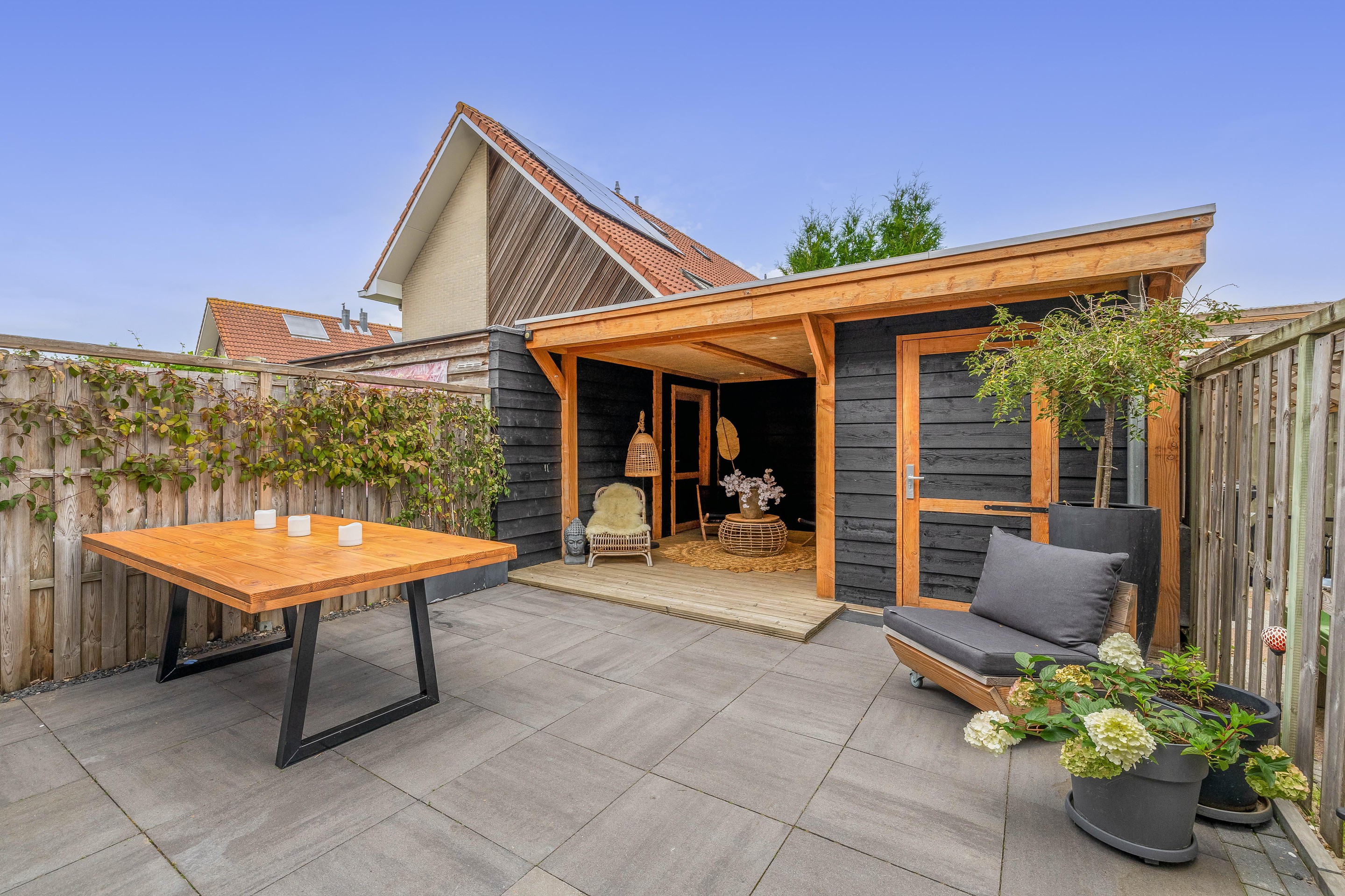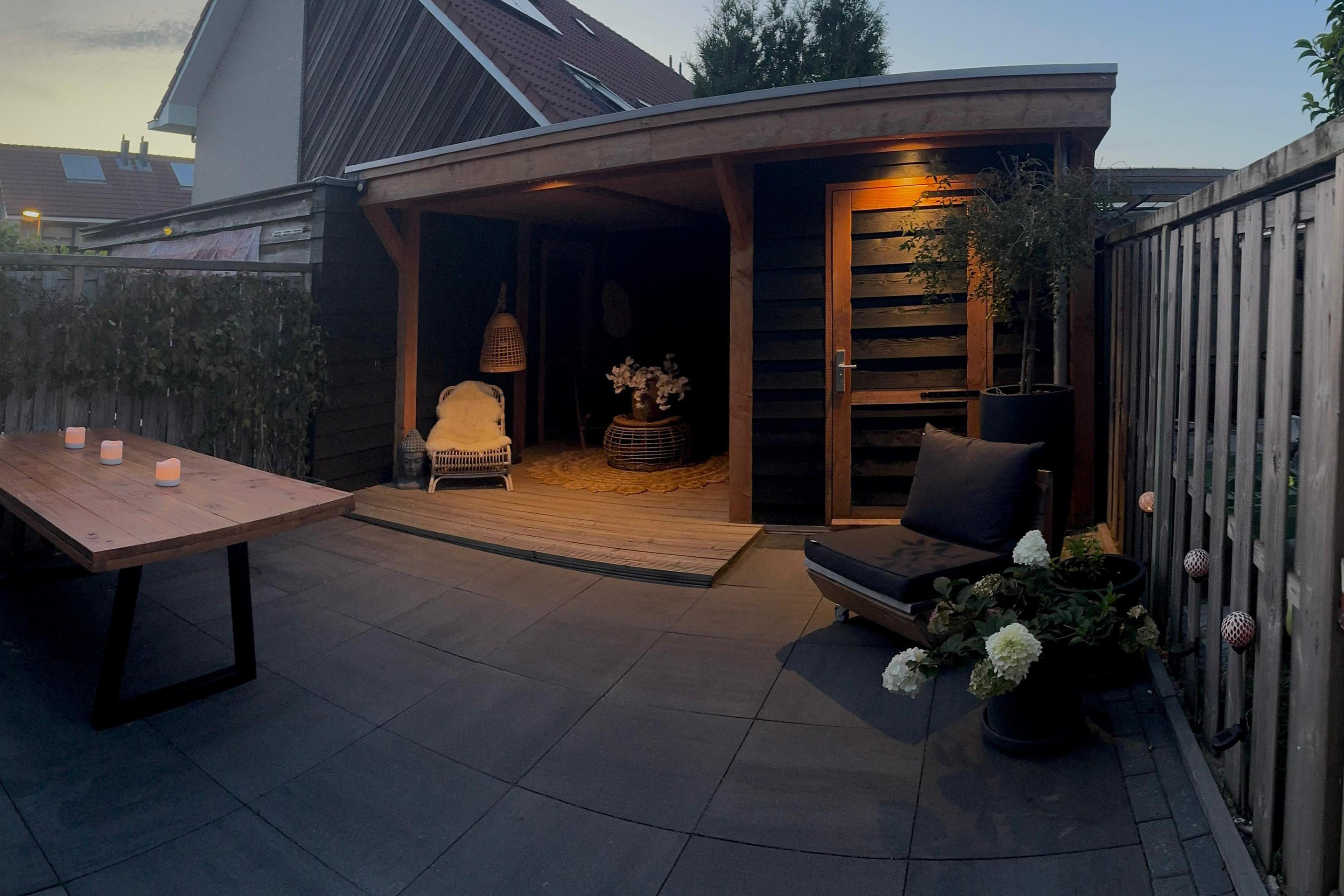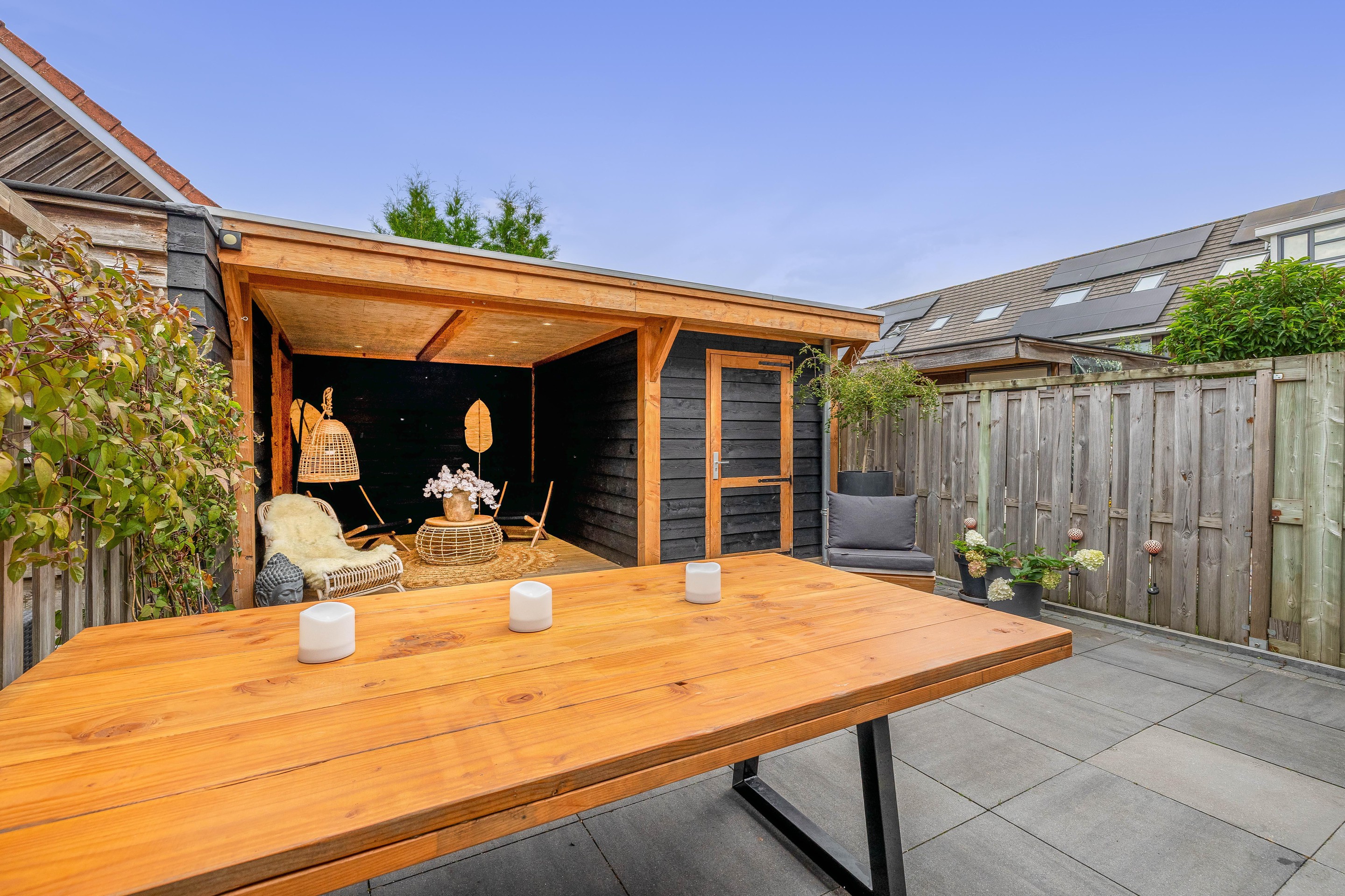 De veranda is dé perfecte plek om heerlijk te ontspannen en te genieten van de lange zomeravonden. Dankzij de subtiele verlichting in zowel de veranda als de berging, is de tuin ook in de avond een sfeervolle plek om tot rust te komen. Via de veranda bereik je bovendien de achtergelegen poort.