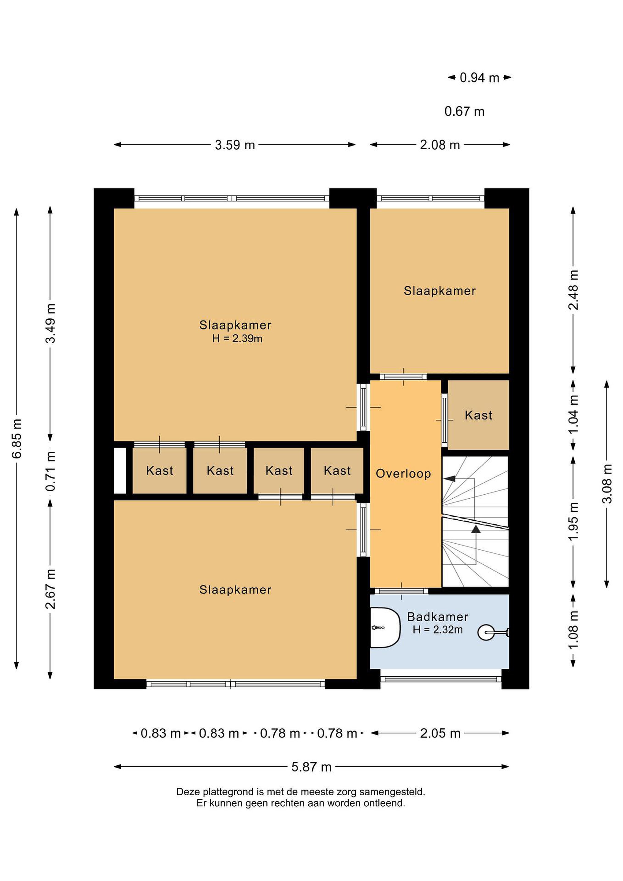 Eerste verdieping Deze verdieping is ingedeeld met drie slaapkamers en een badkamer. De slaapkamers zijn respectievelijk 3,59 x 3,49 m, 3,59 x 2,67 m en 2,08 x 2,48 m groot.