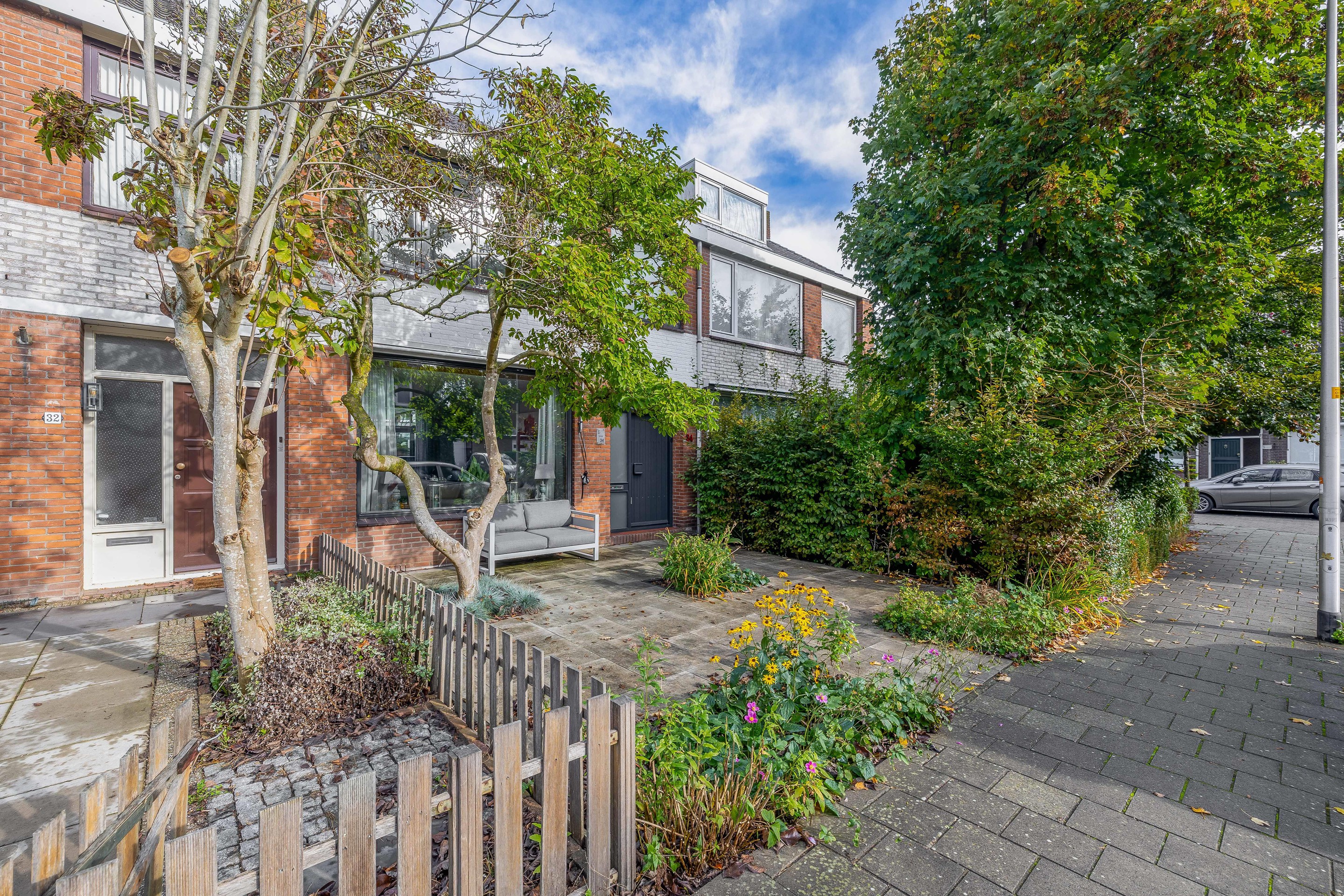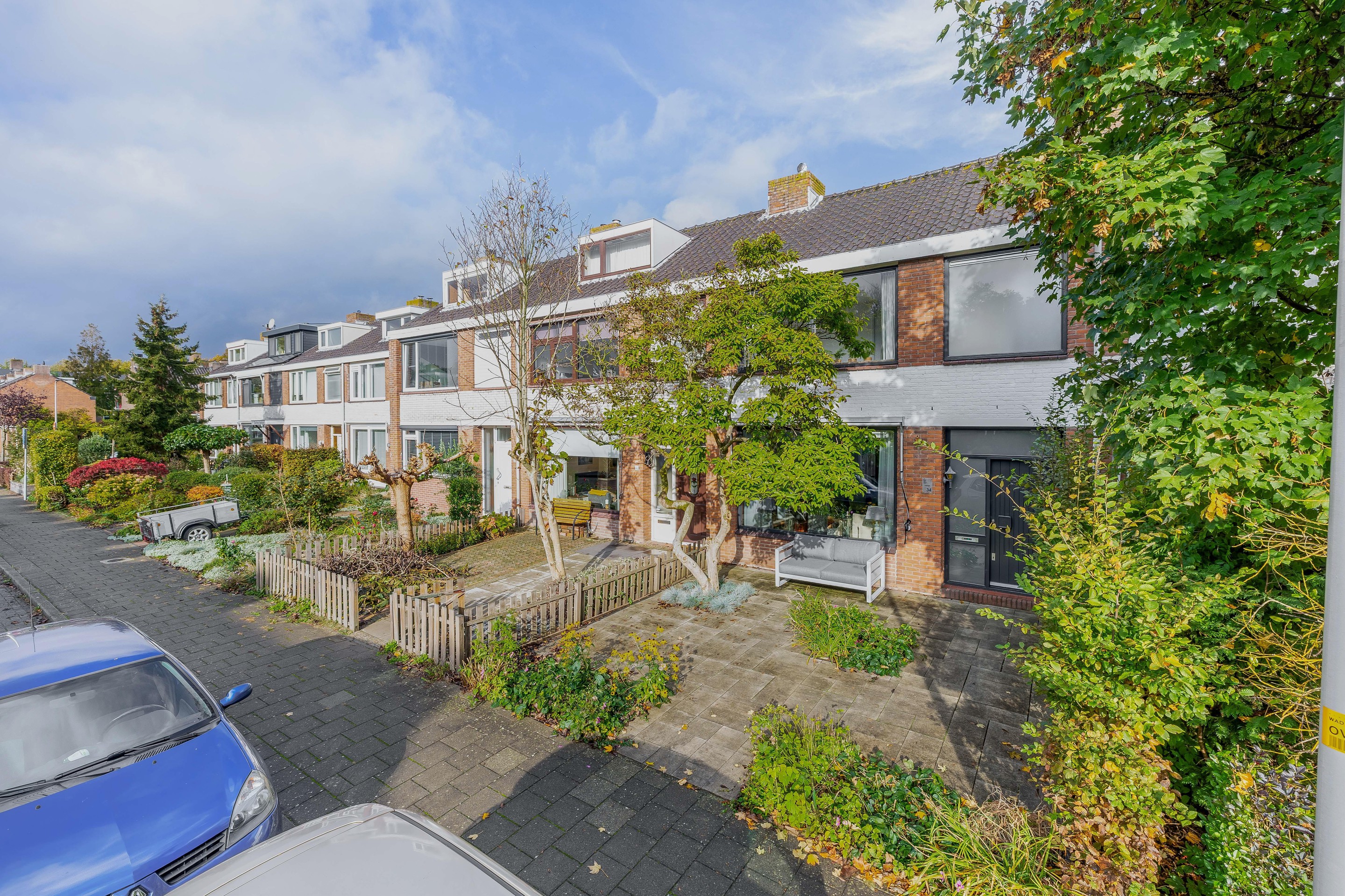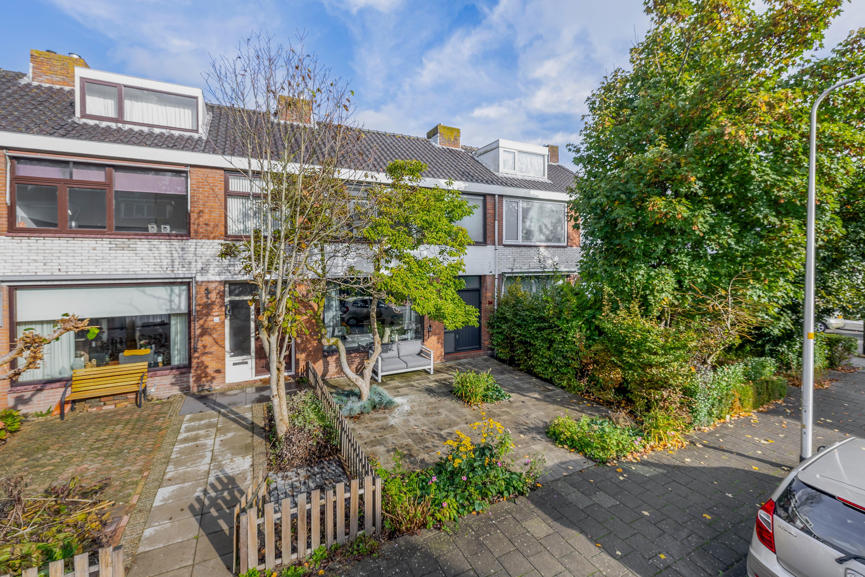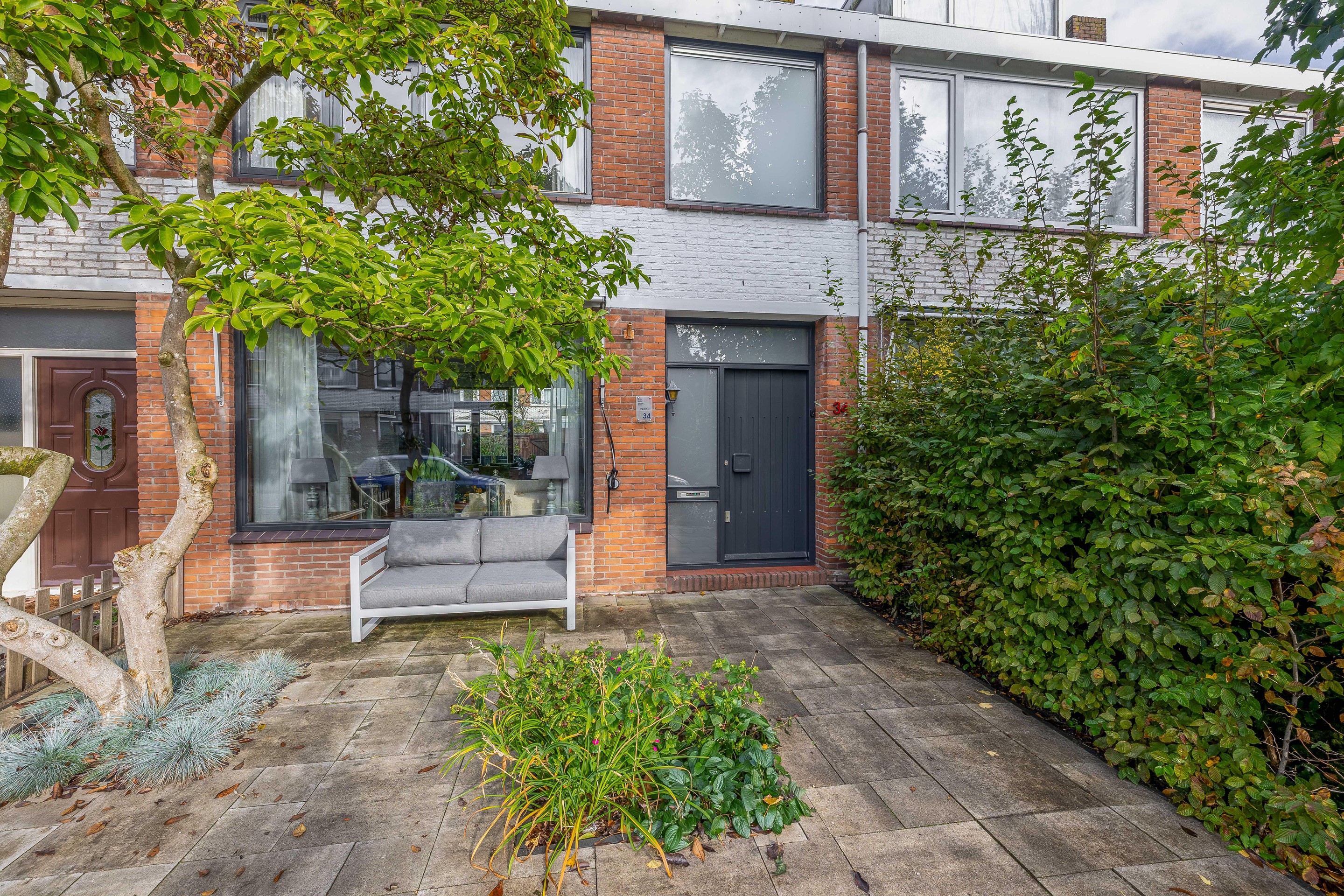 De diepe voortuin met sierbestrating en vaste beplanting geeft het huis een verzorgde uitstraling en extra privacy.