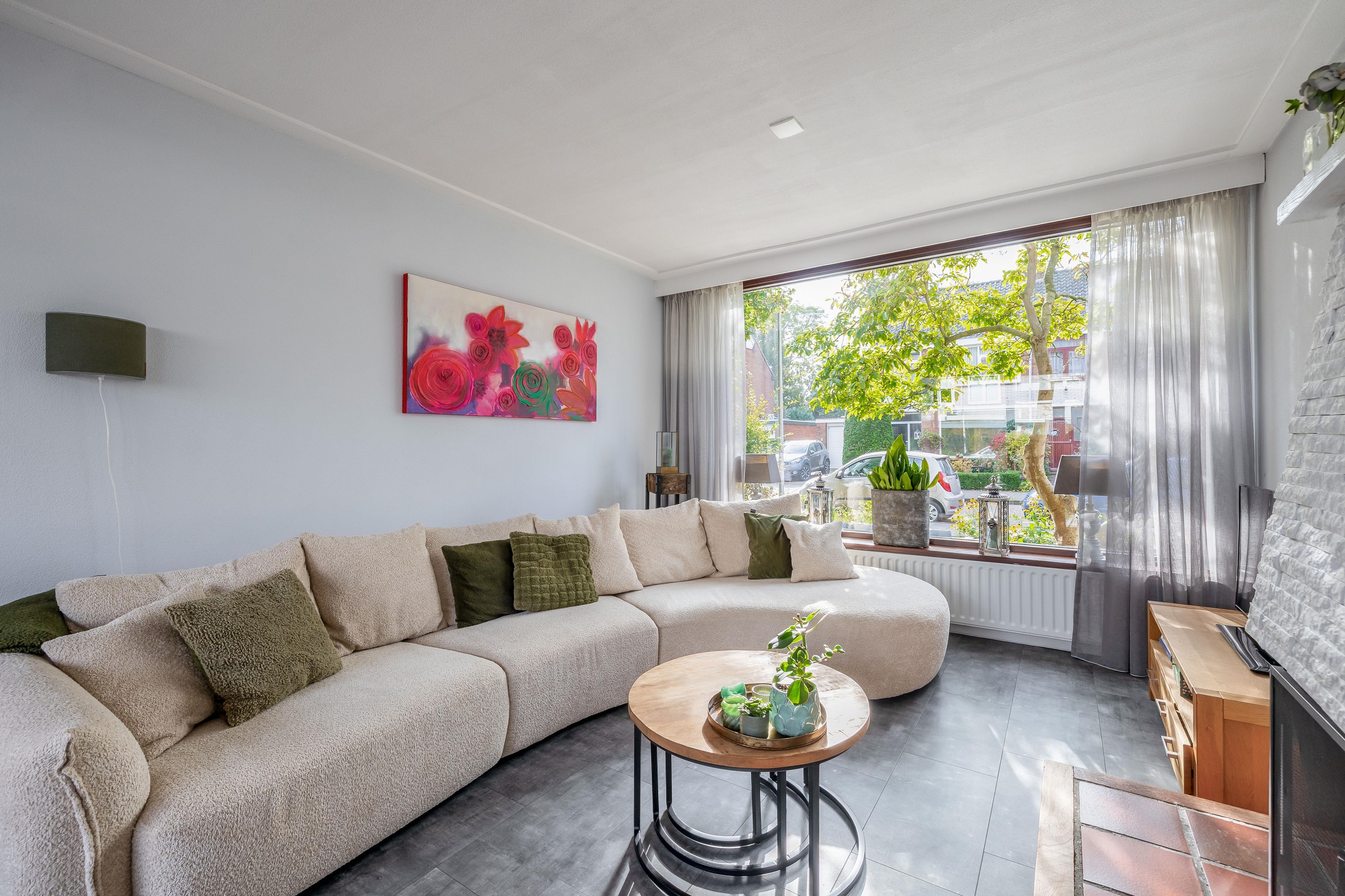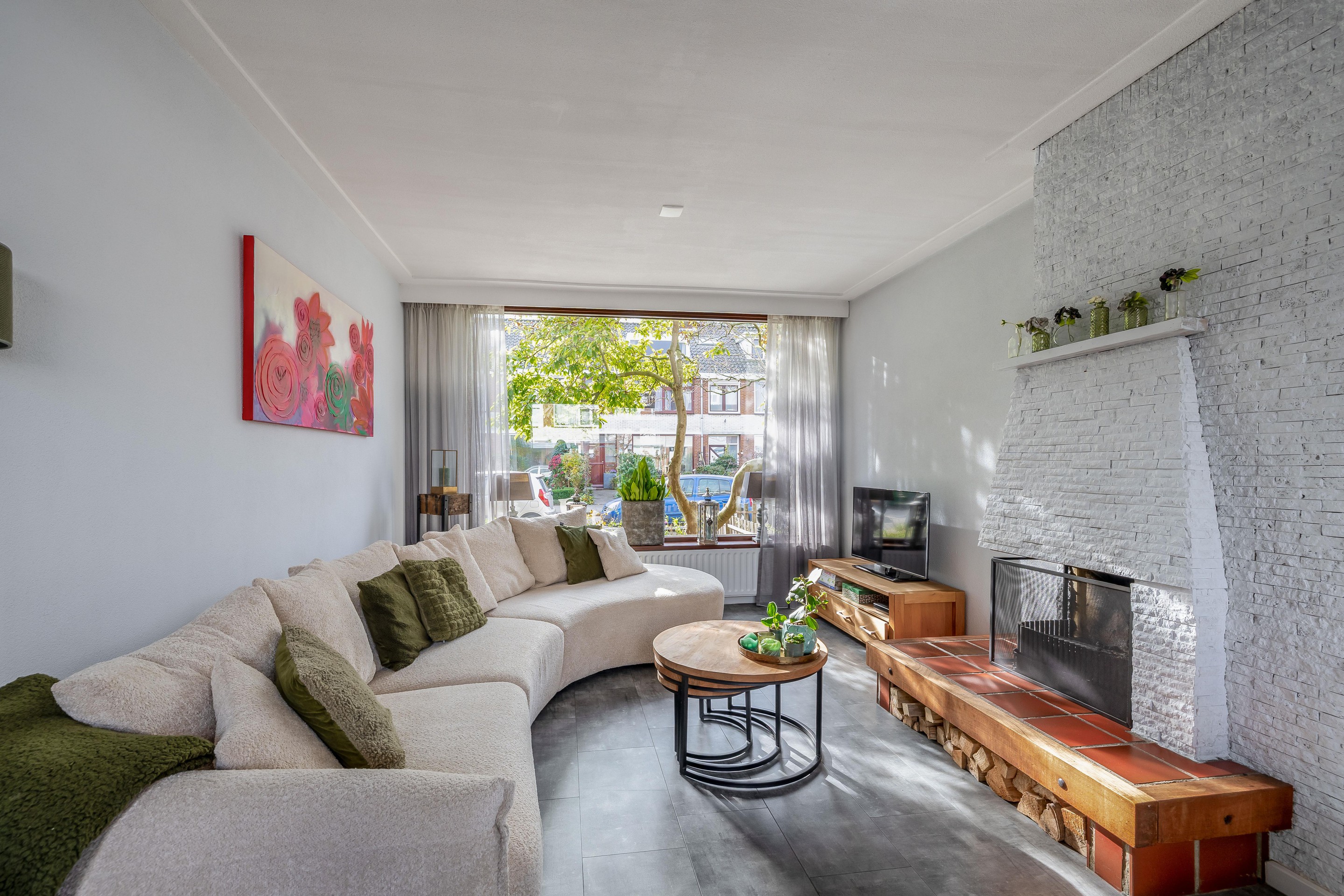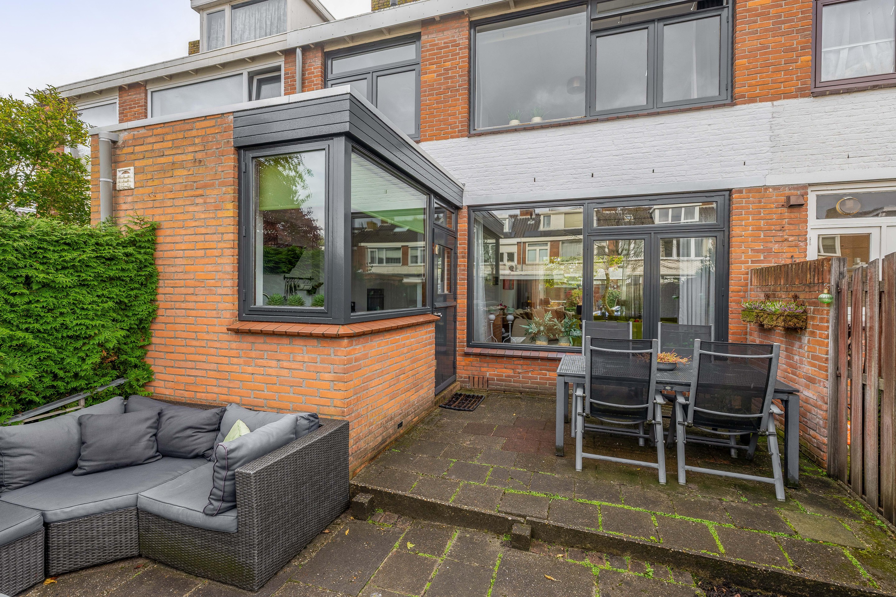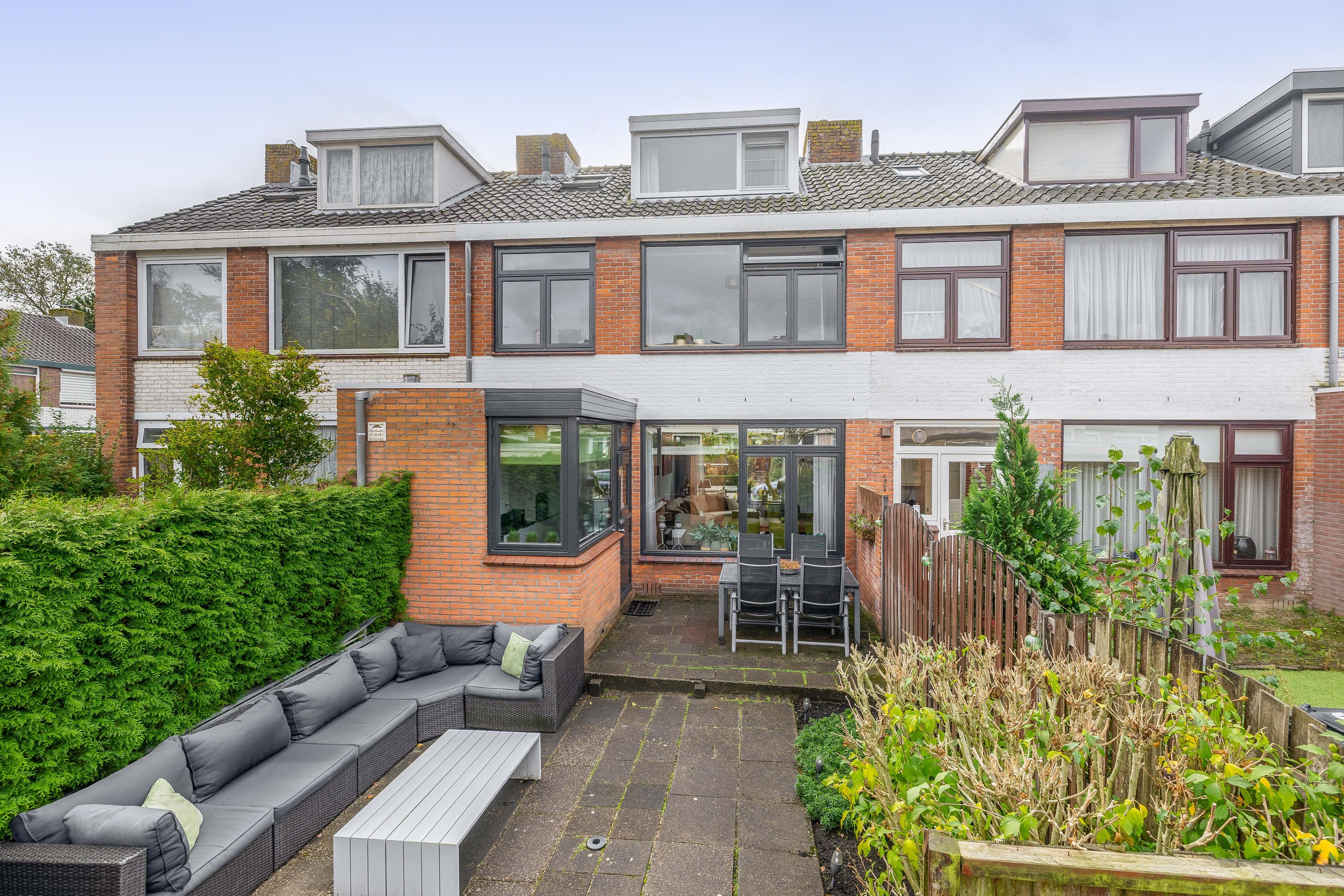De diepe voortuin met sierbestrating en vaste beplanting geeft het huis een verzorgde uitstraling en extra privacy.