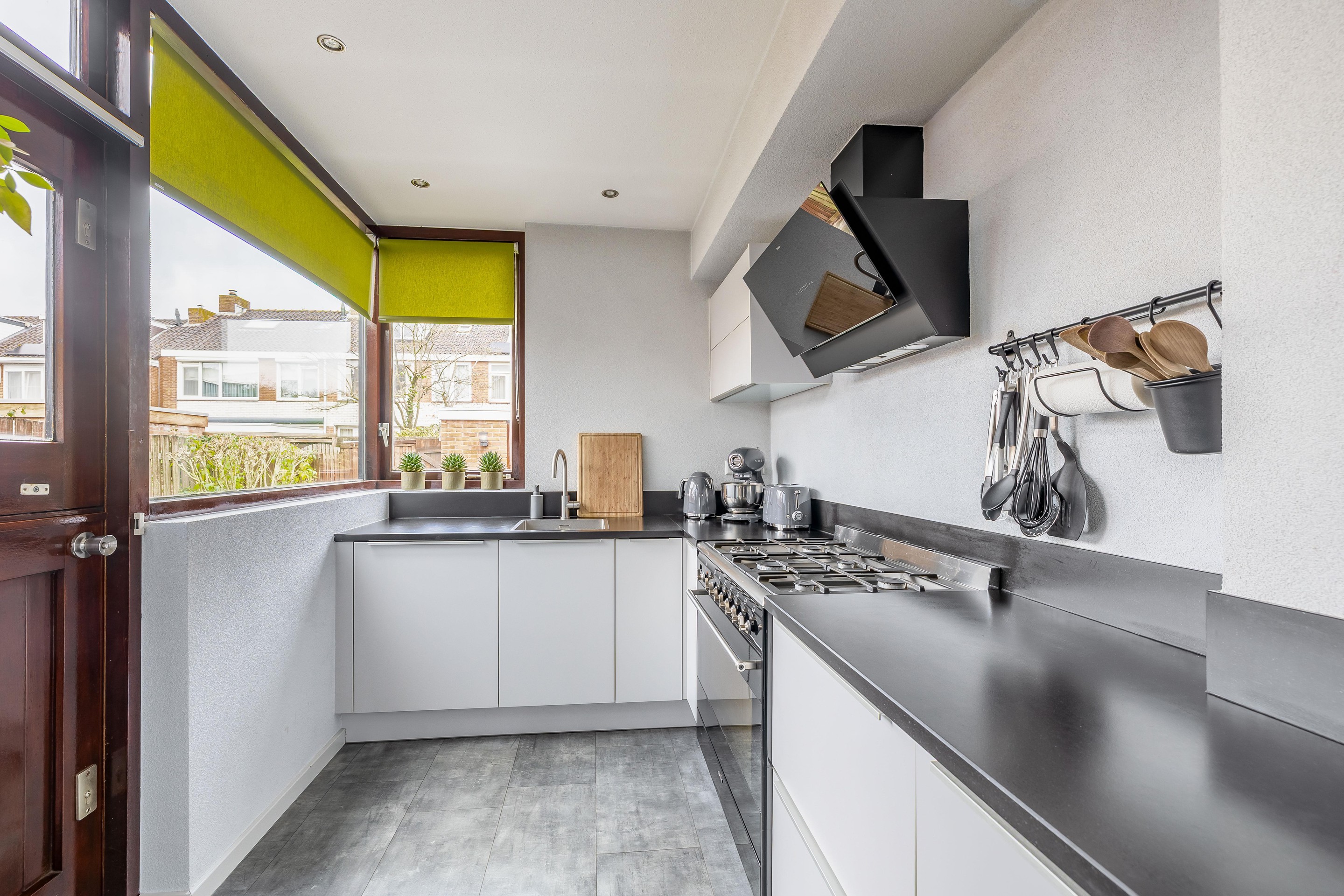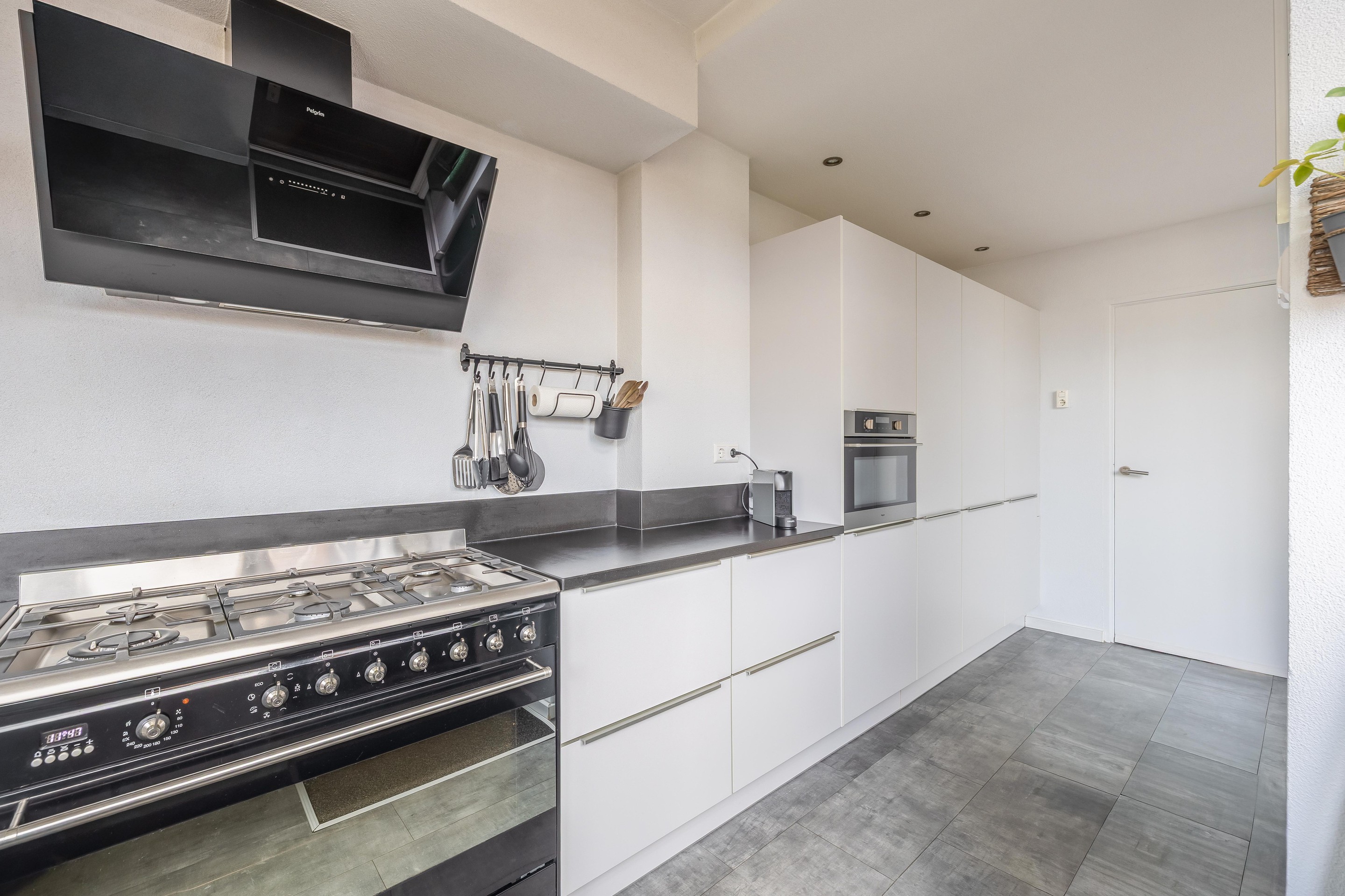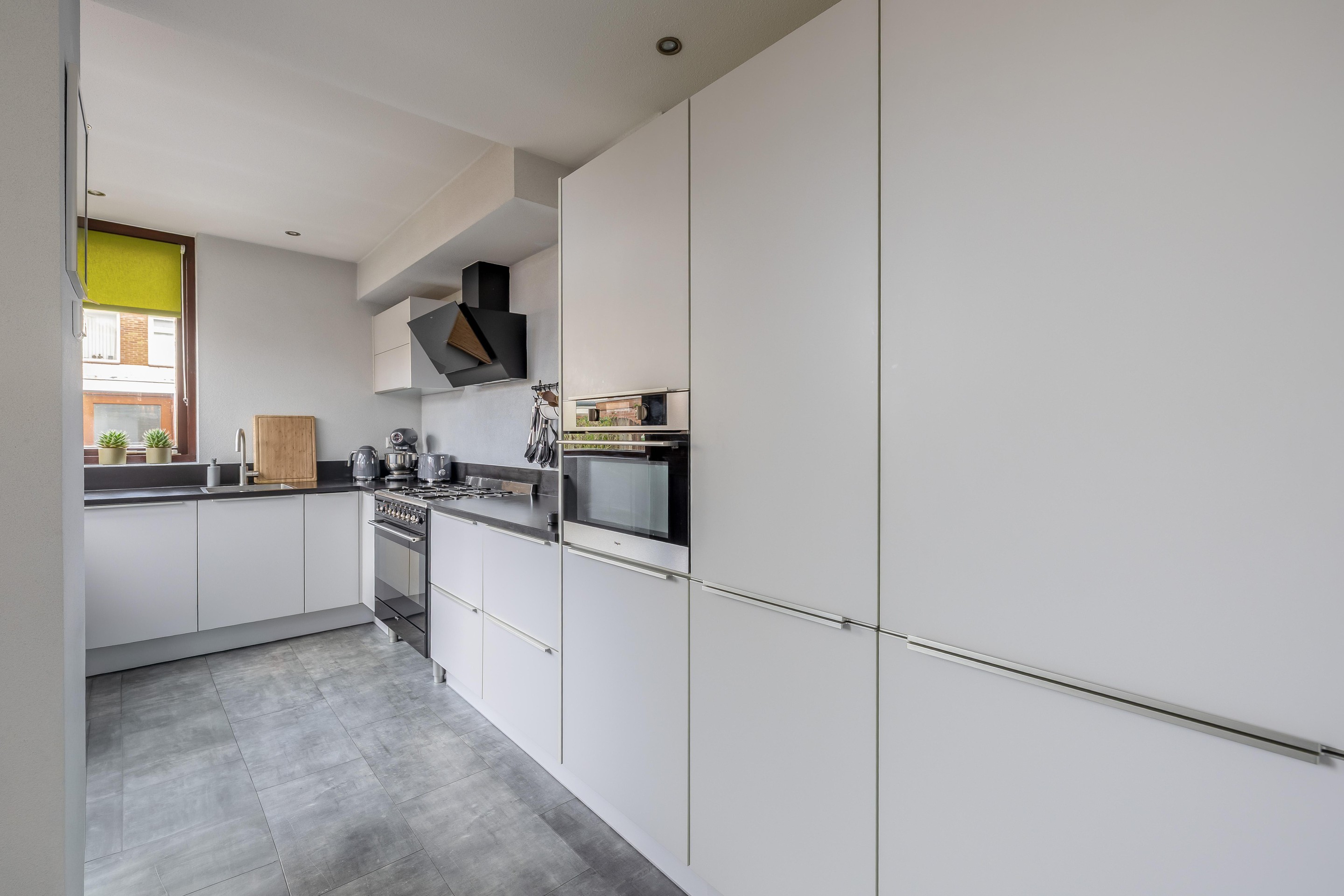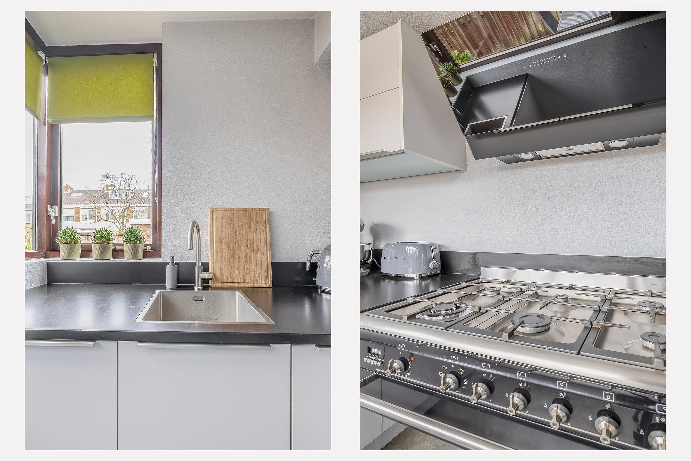 En dan de keuken, een echte eyecatcher! Deze is in 2020 volledig vernieuwd en vormt het hart van het huis. Kookliefhebbers kunnen hier hun creativiteit kwijt: veel bergruimte, een royaal werkblad van donker composiet en hoogwaardige apparatuur zoals een 6-pits fornuis, combi-oven en een grote koel-/vriescombinatie. De lichte kastfronten zorgen voor een stijlvol contrast met het donkere blad. De keuken (ca. 2,24 x 5,52 m) is ingedeeld in een praktische L-opstelling en heeft direct tuincontact.