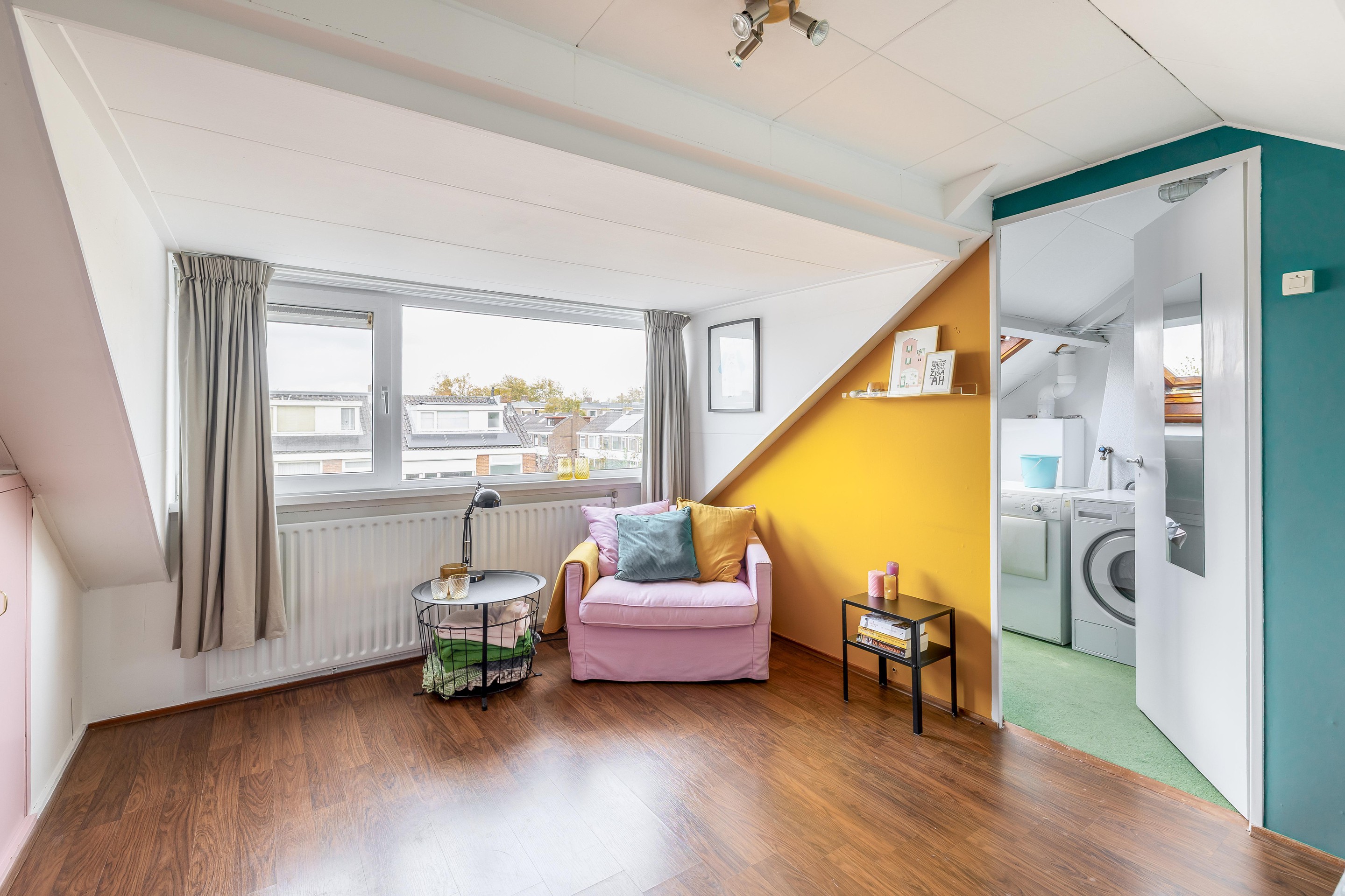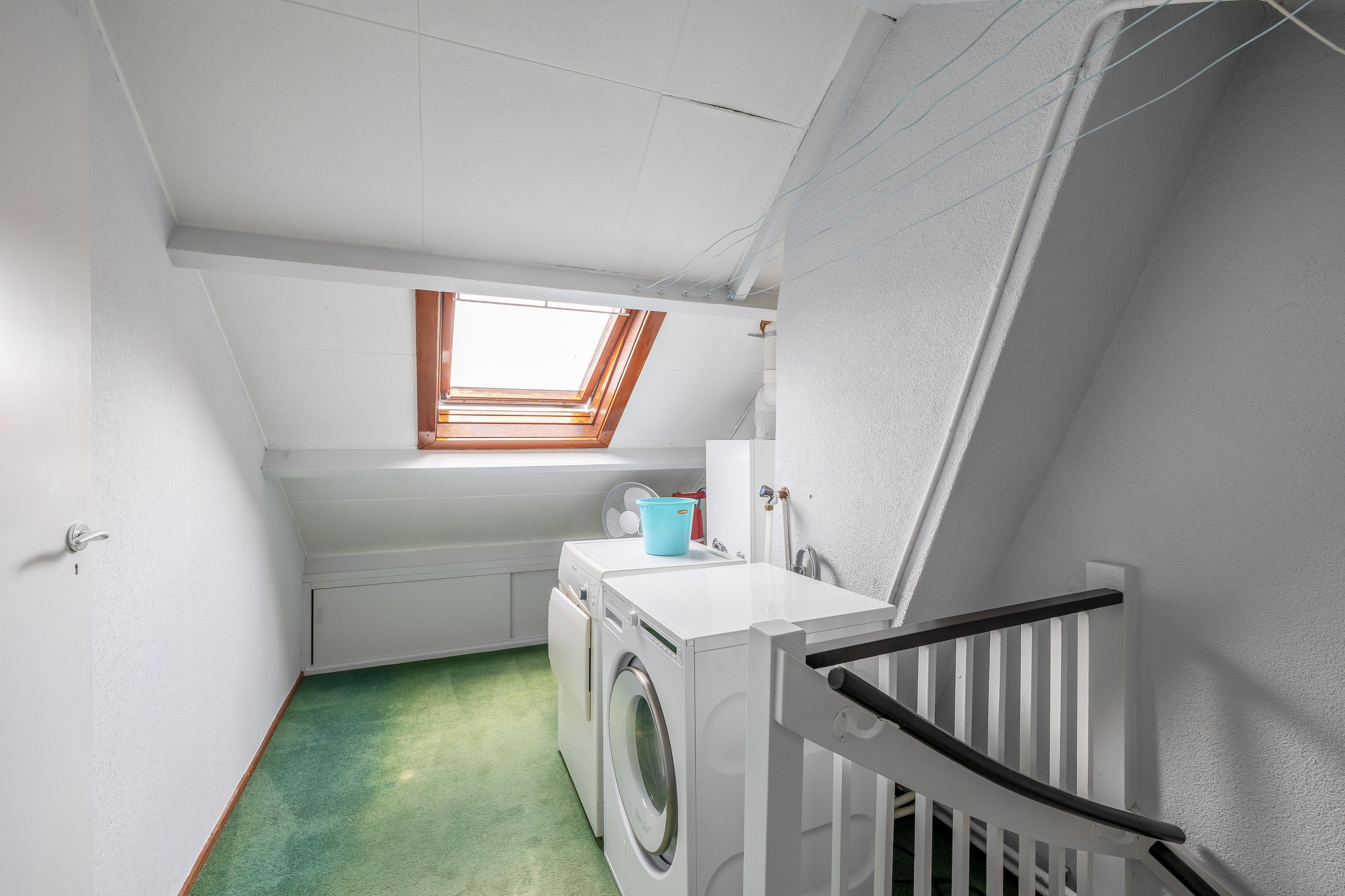 Tweede verdieping De zolderverdieping bestaat uit een grote zolderkamer en een praktische overloop met de aansluitingen voor de wasmachine en droger. De overloop heeft een Velux-venster voor ventilatie en daglicht, en onder de kap zijn bergschotten gemaakt.