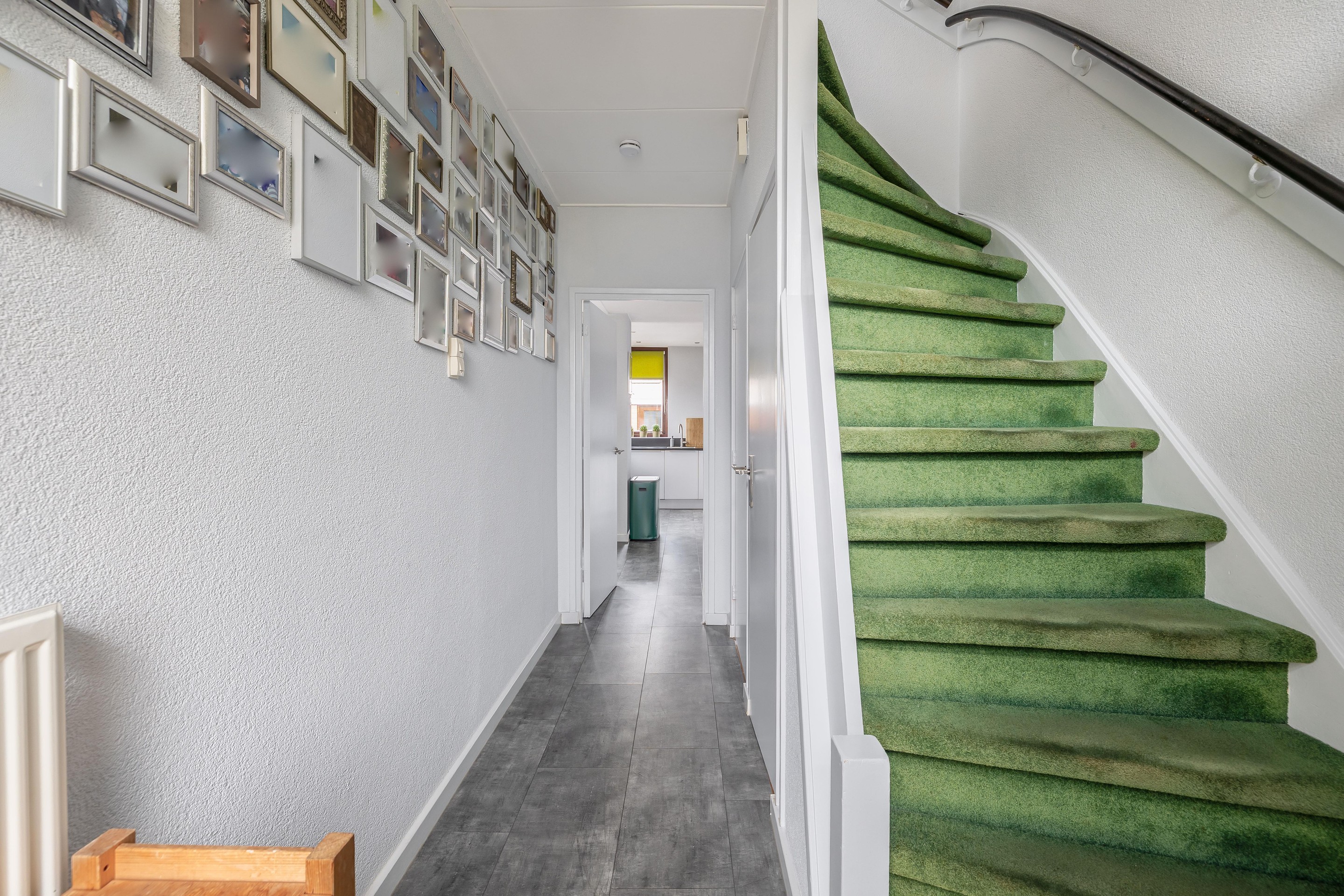 De wanden en plafonds zijn strak afgewerkt en op de vloer ligt een moderne pvc-vloer in grijs tegeldesign.