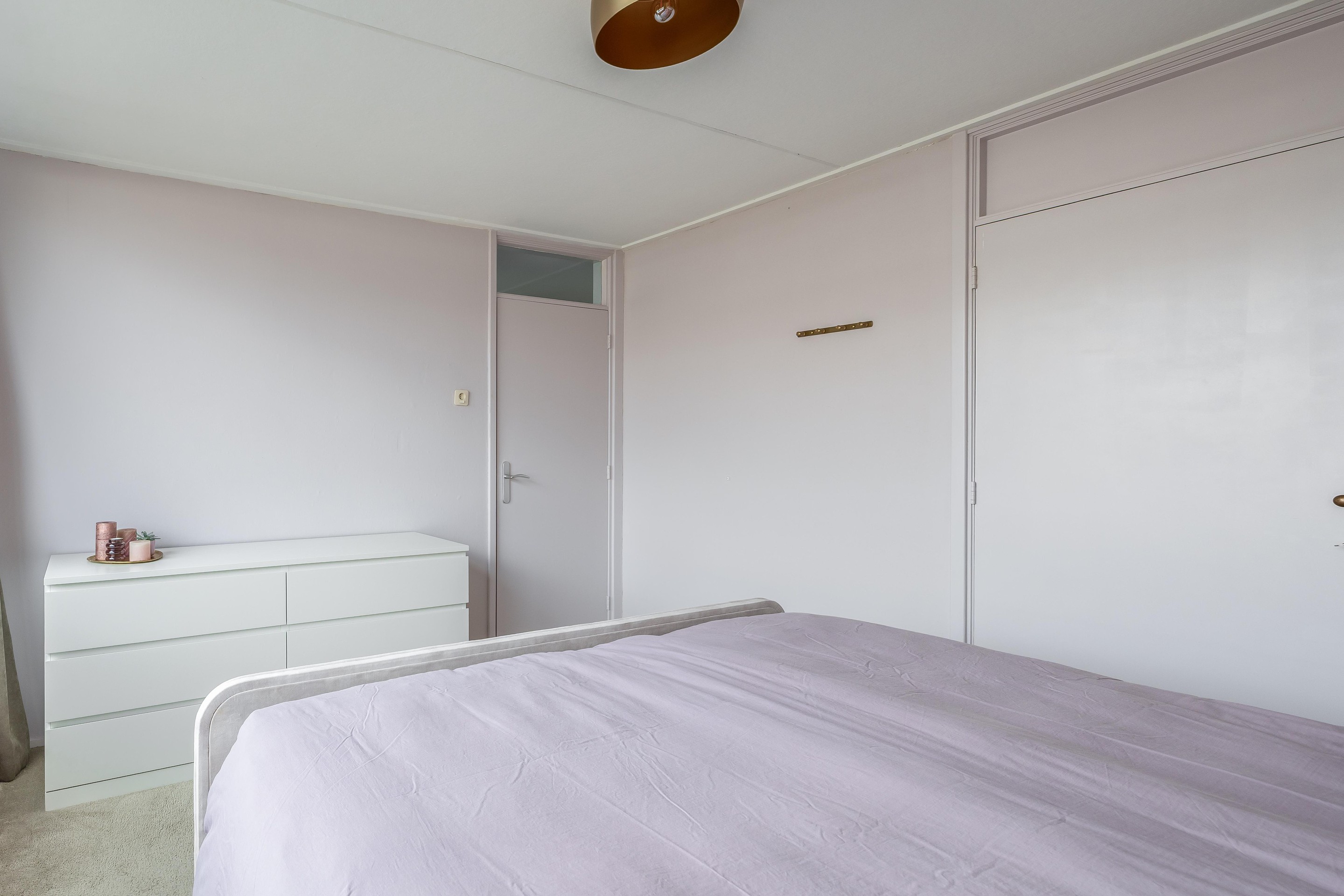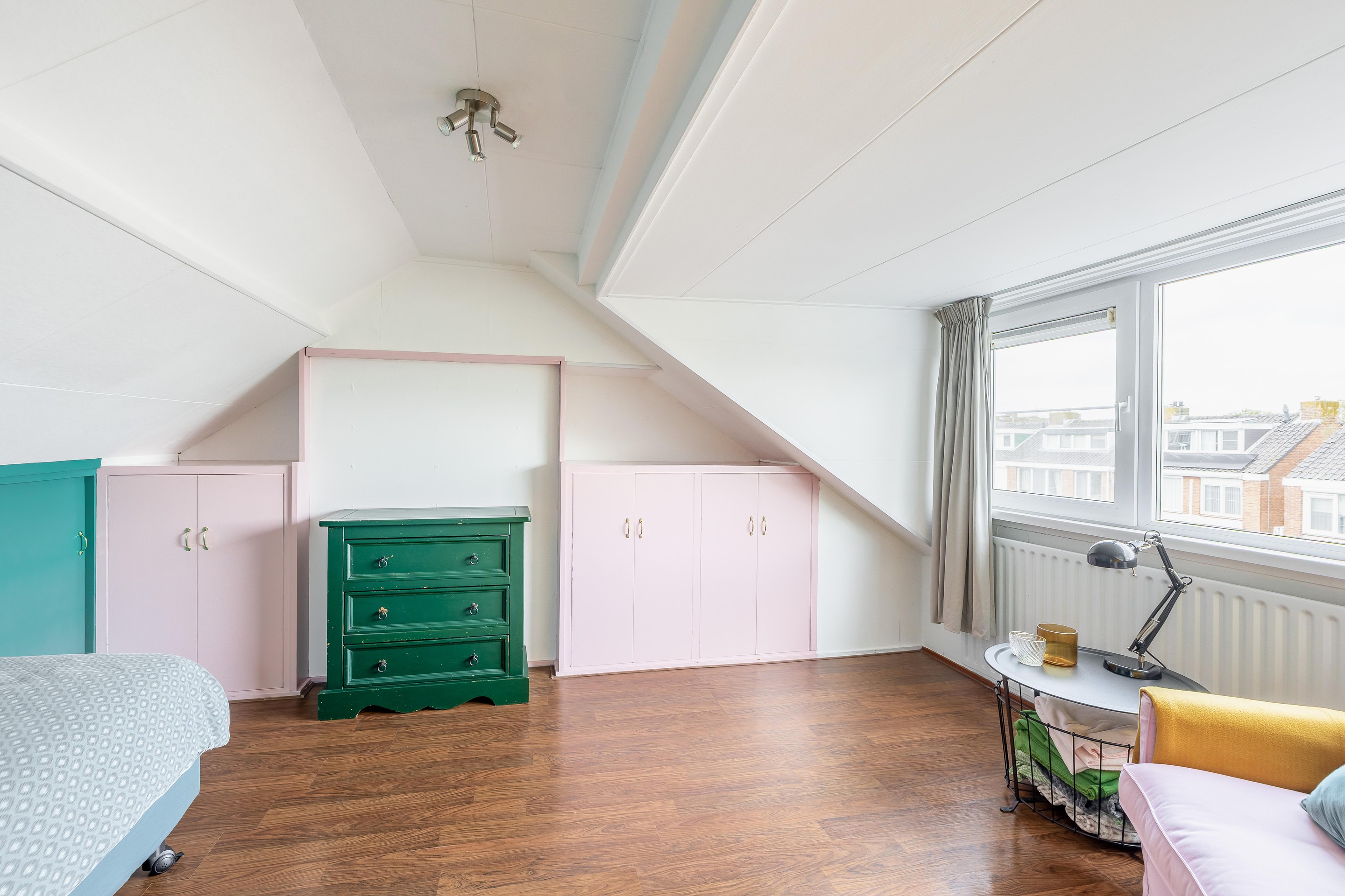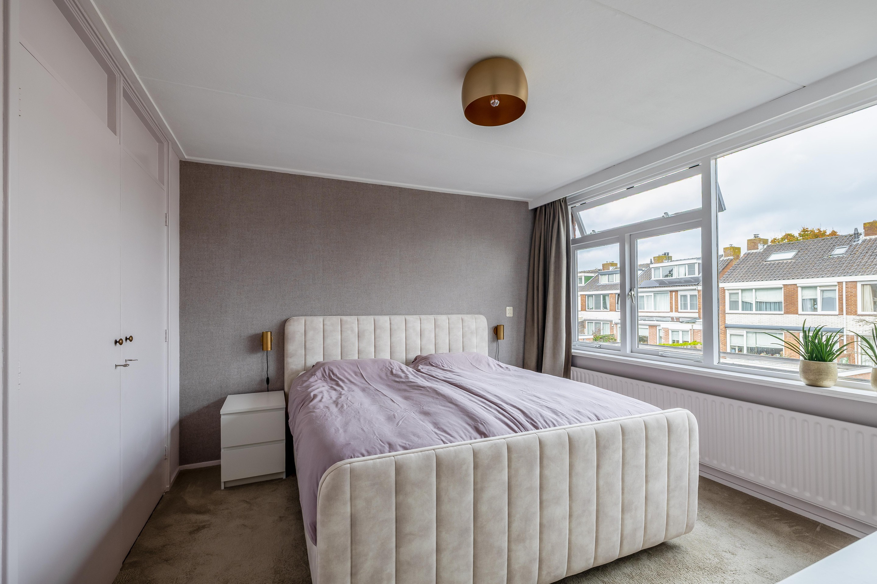 De slaapkamer is verrassend ruim en licht, mede dankzij de grote kunststof dakkapel. Ook hier is extra bergruimte gecreëerd, ditmaal tegen de woningscheidende wand.
