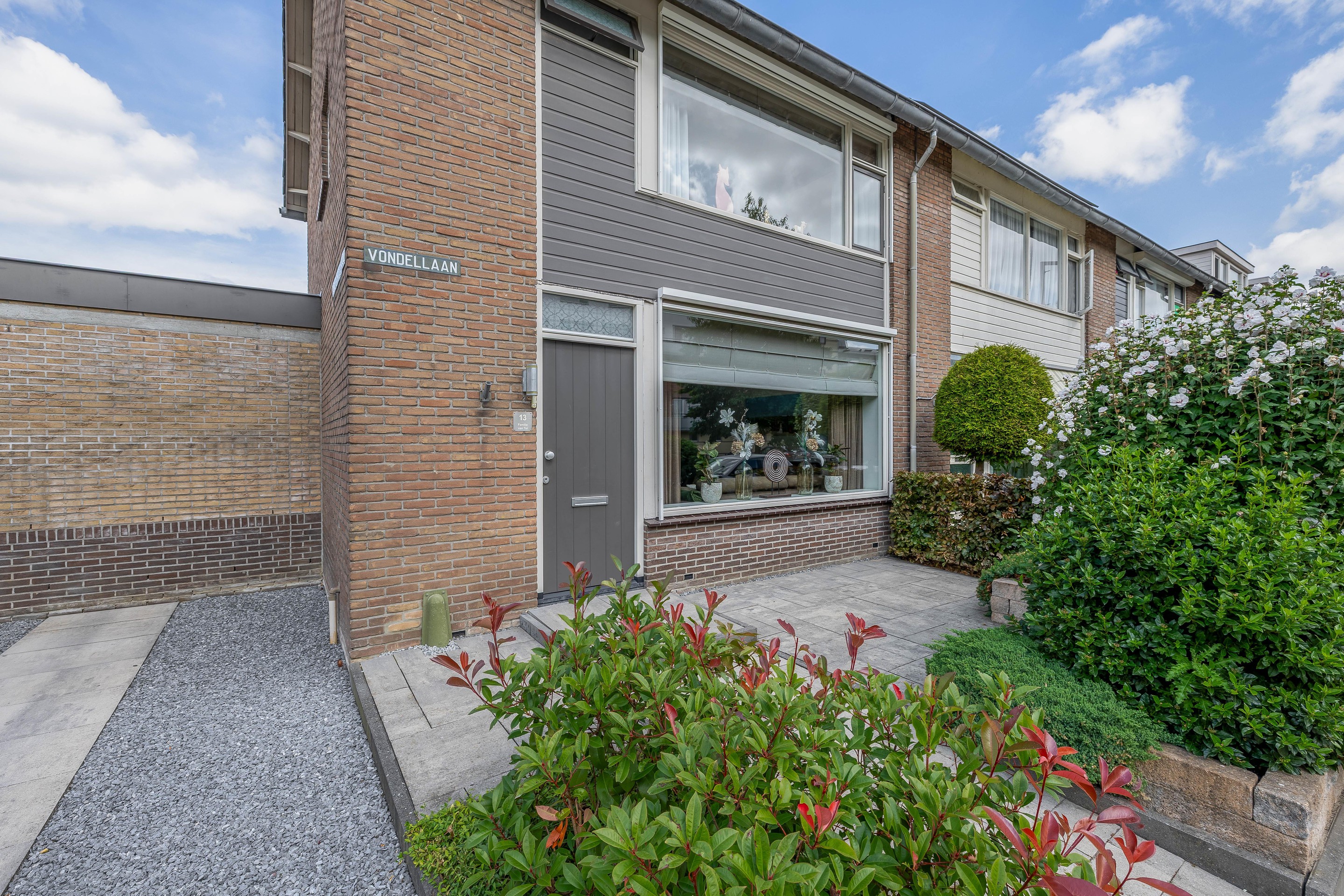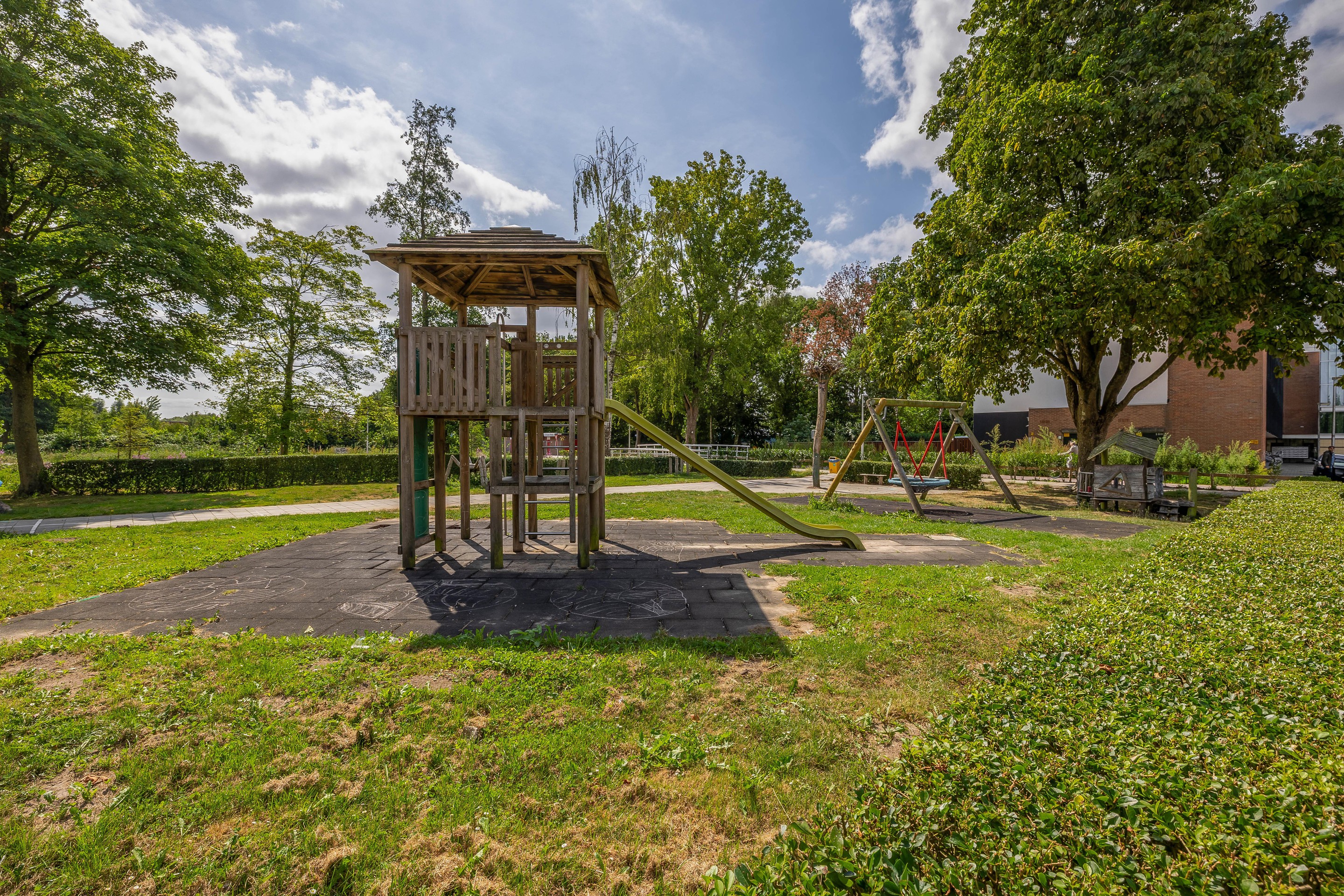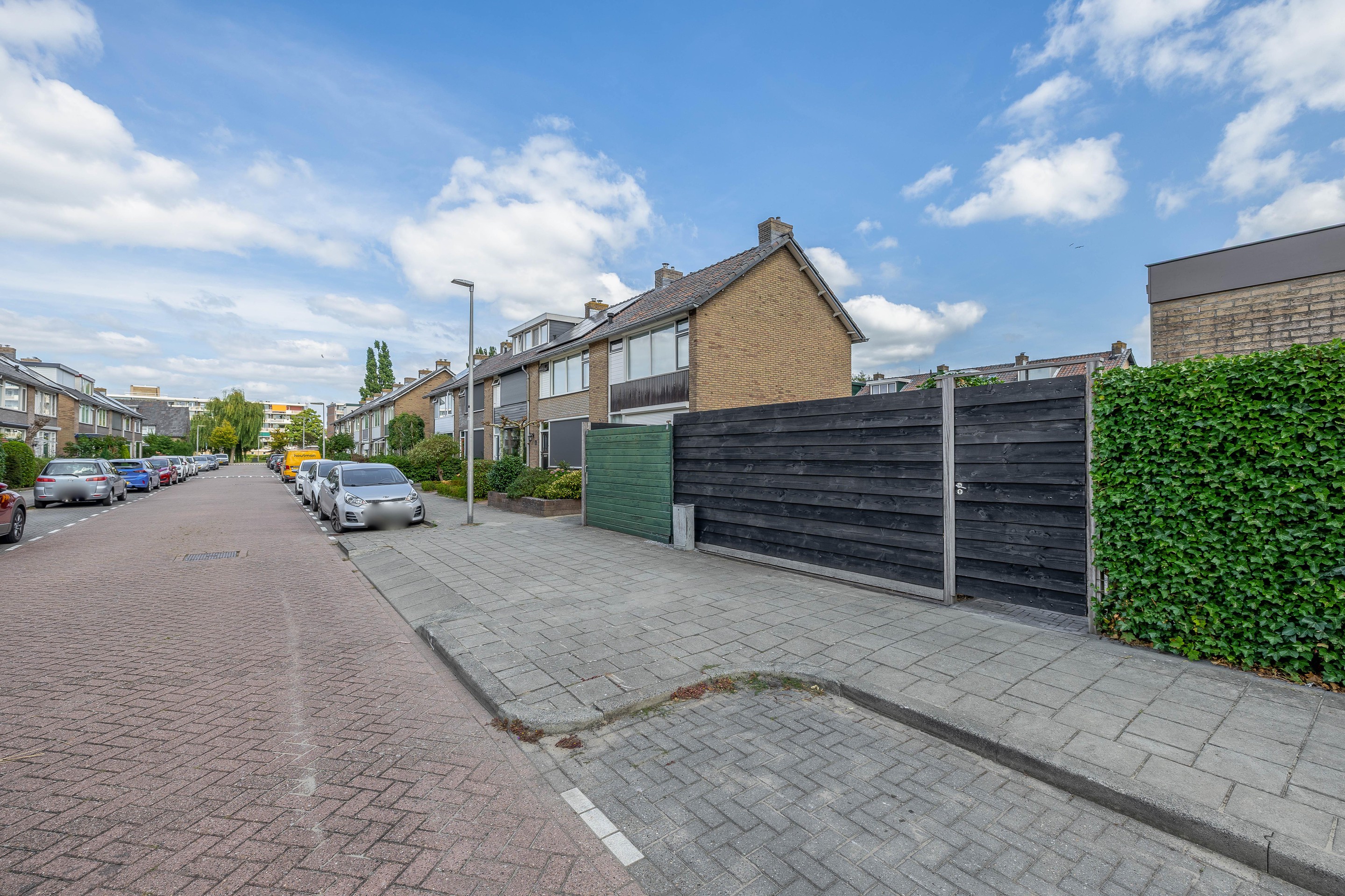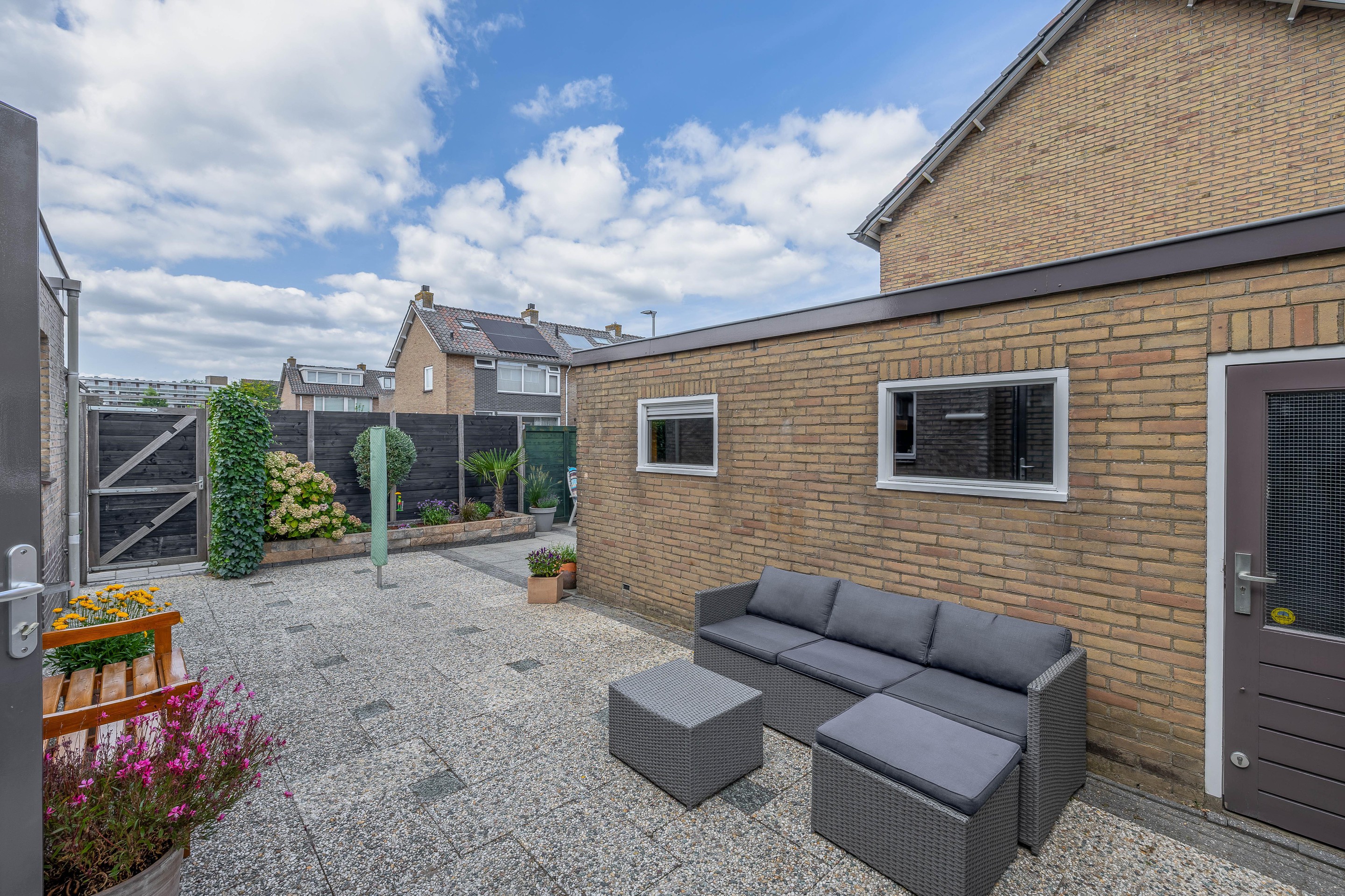 De voortuin heeft een praktische indeling met een tweedeling: links een parkeerplaats met officiële inrit en rechts een fraai aangelegde tuin met vaste planten en een verhoogde border. Indien gewenst kan de gevel van de uitbouw aan de voorzijde worden voorzien van een garagedeur. Op het raam van de woonkamer is bovendien een screen aangebracht.