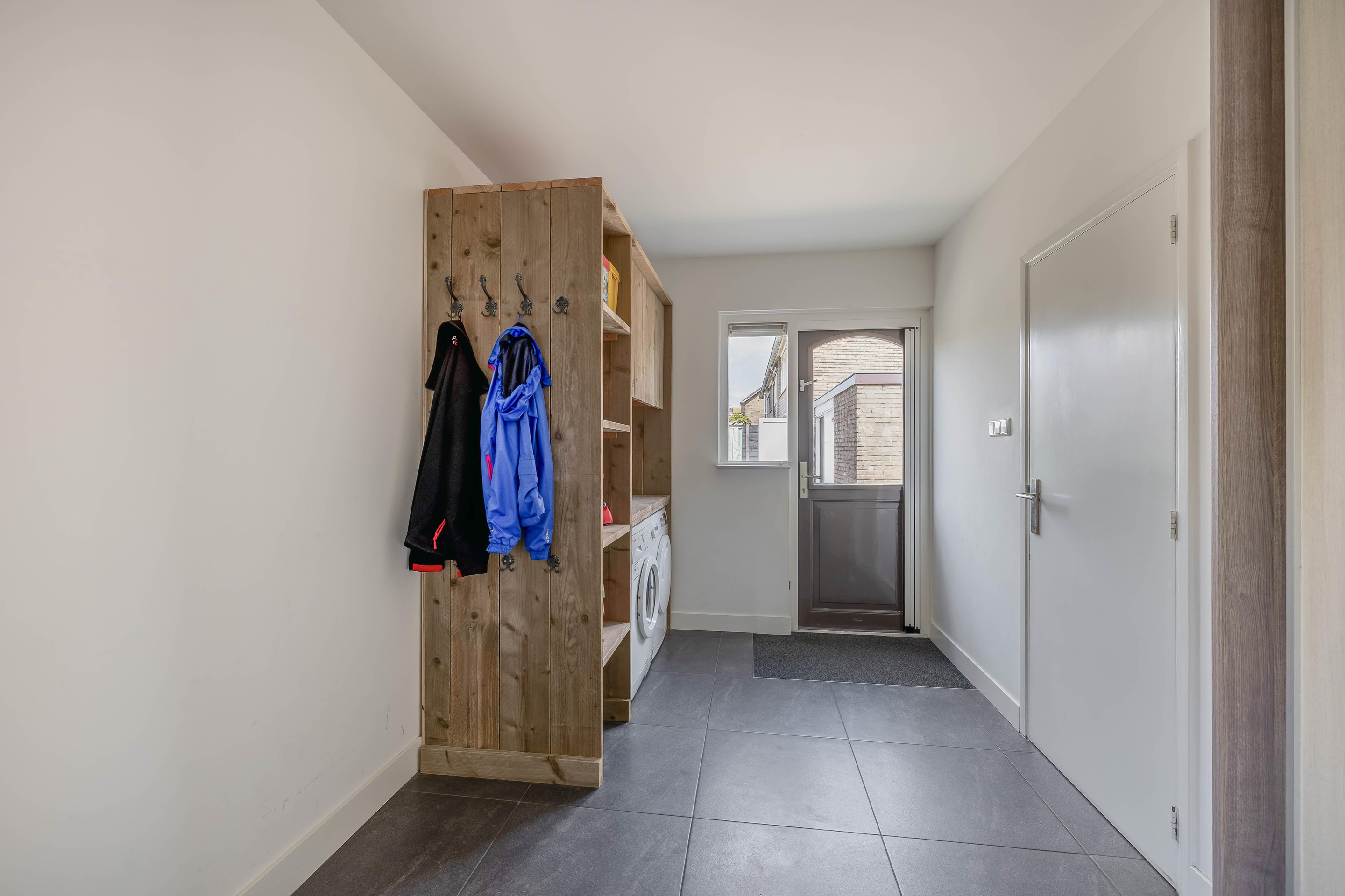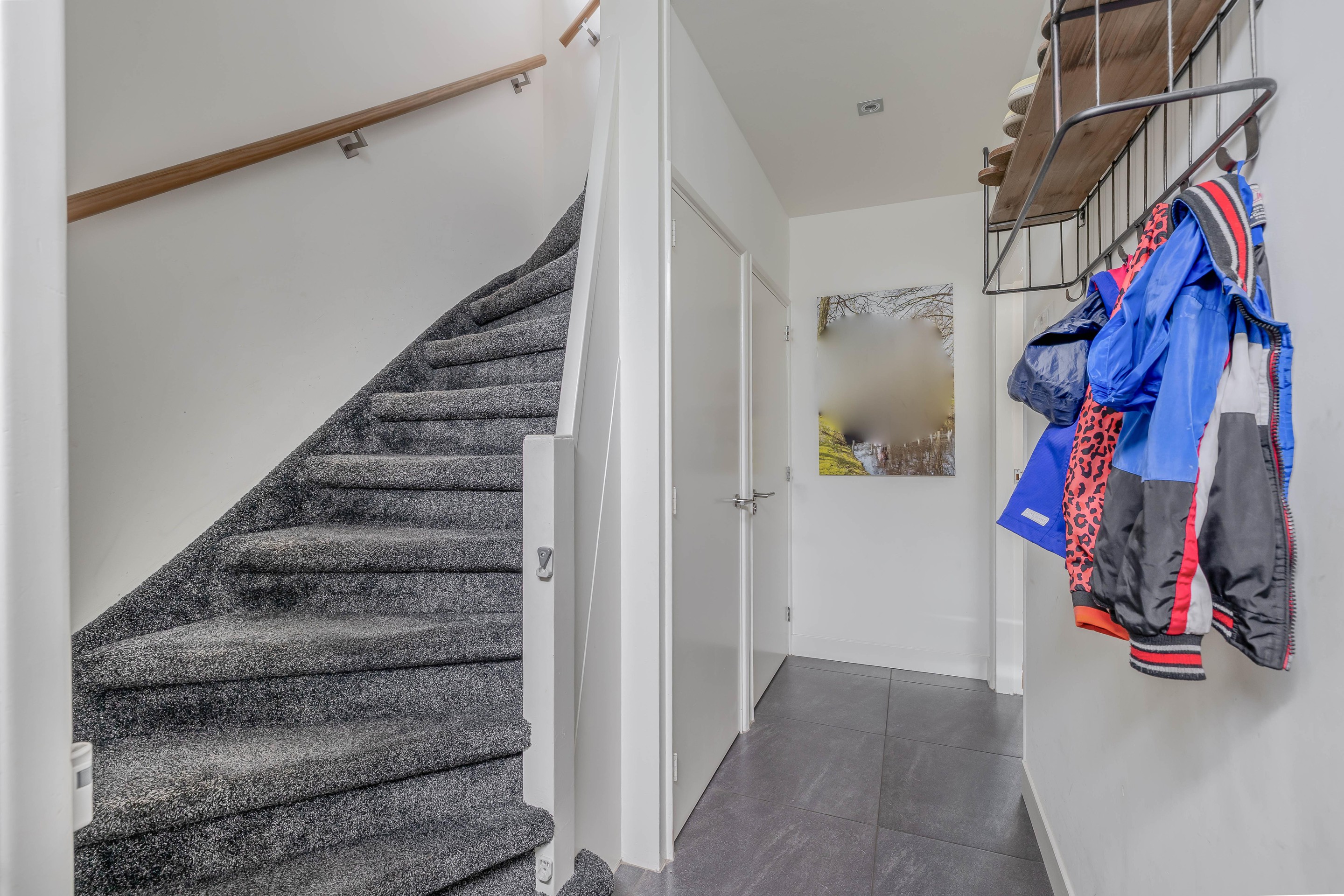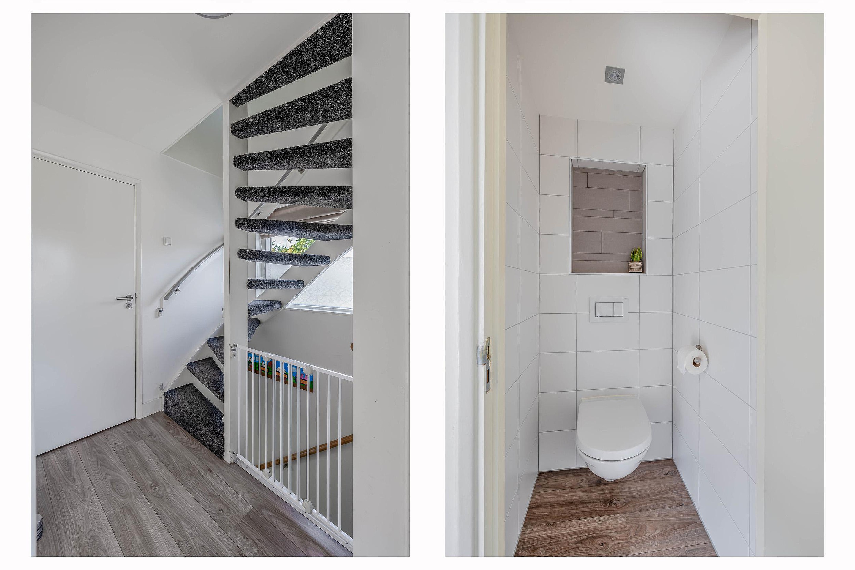 Entree/hal met trapkast, moderne meterkast en toilet. Het toilet is vergroot, volledig licht betegeld en voorzien van een hangend closet. De meterkast, inclusief alle bedrading in het huis, is geheel vernieuwd en aangepast aan de eisen van deze tijd.