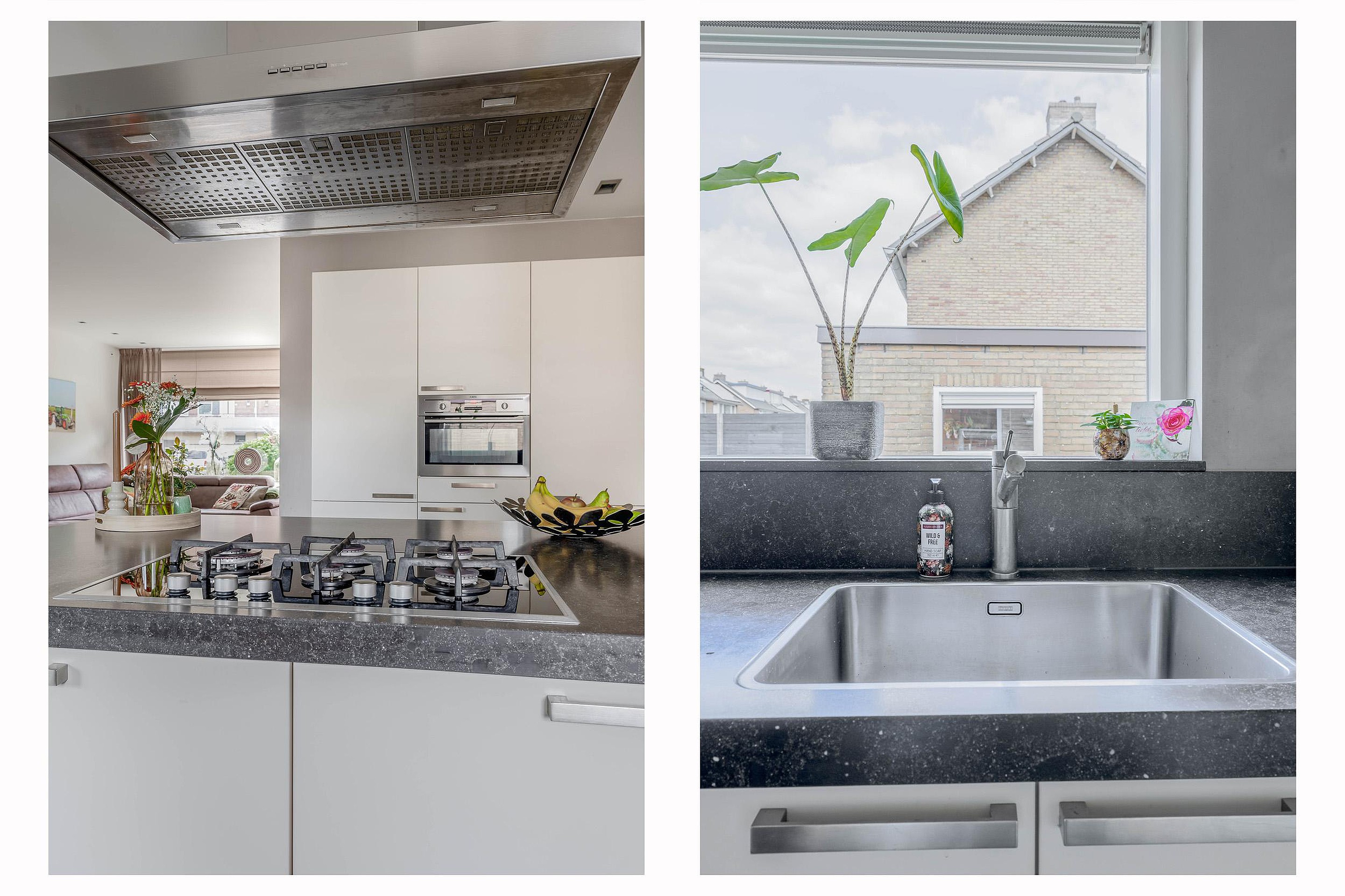 De keuken is een waar paradijs voor kookliefhebbers! Er is een royaal kookeiland met veel loop- en werkruimte eromheen. Daarnaast is de keuken uitgerust met diverse inbouwapparatuur, waaronder een vaatwasser, een hoge inbouwkoelkast met klimaatzones, een hoge vriezer (No Frost), een combi-oven en een 5-pits gaskookplaat. De kastfronten zijn uitgevoerd in wit en combineren fraai met het grijze composieten werkblad.