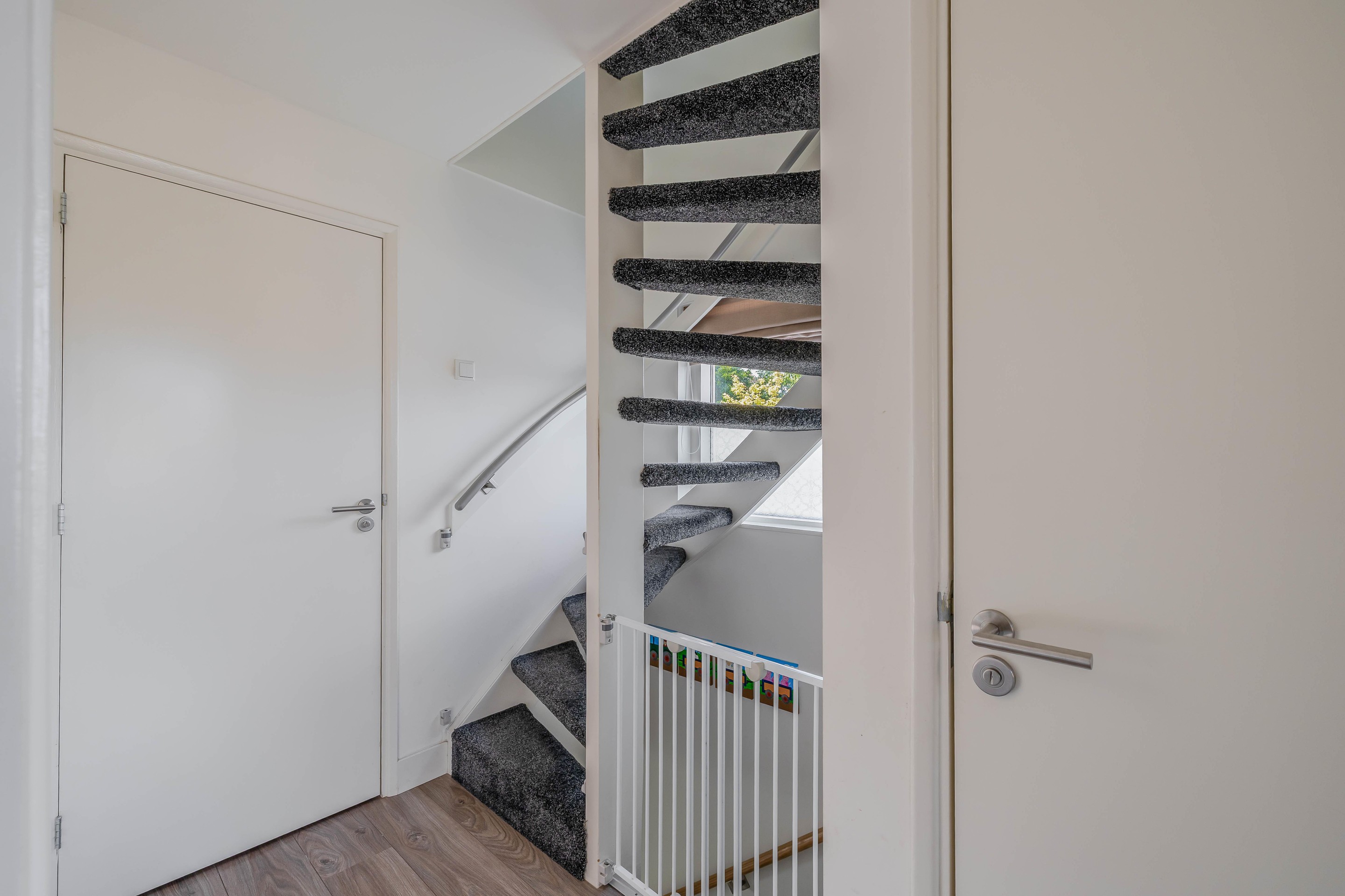 Via de gestoffeerde trapopgang kom je op de overloop. Deze is voorzien van laminaat en geeft toegang tot drie slaapkamers en de luxe badkamer. De voormalige overloopkast is omgebouwd tot een modern toilet. Dankzij het extra zijgevelraam in het trappenhuis valt er veel daglicht binnen.