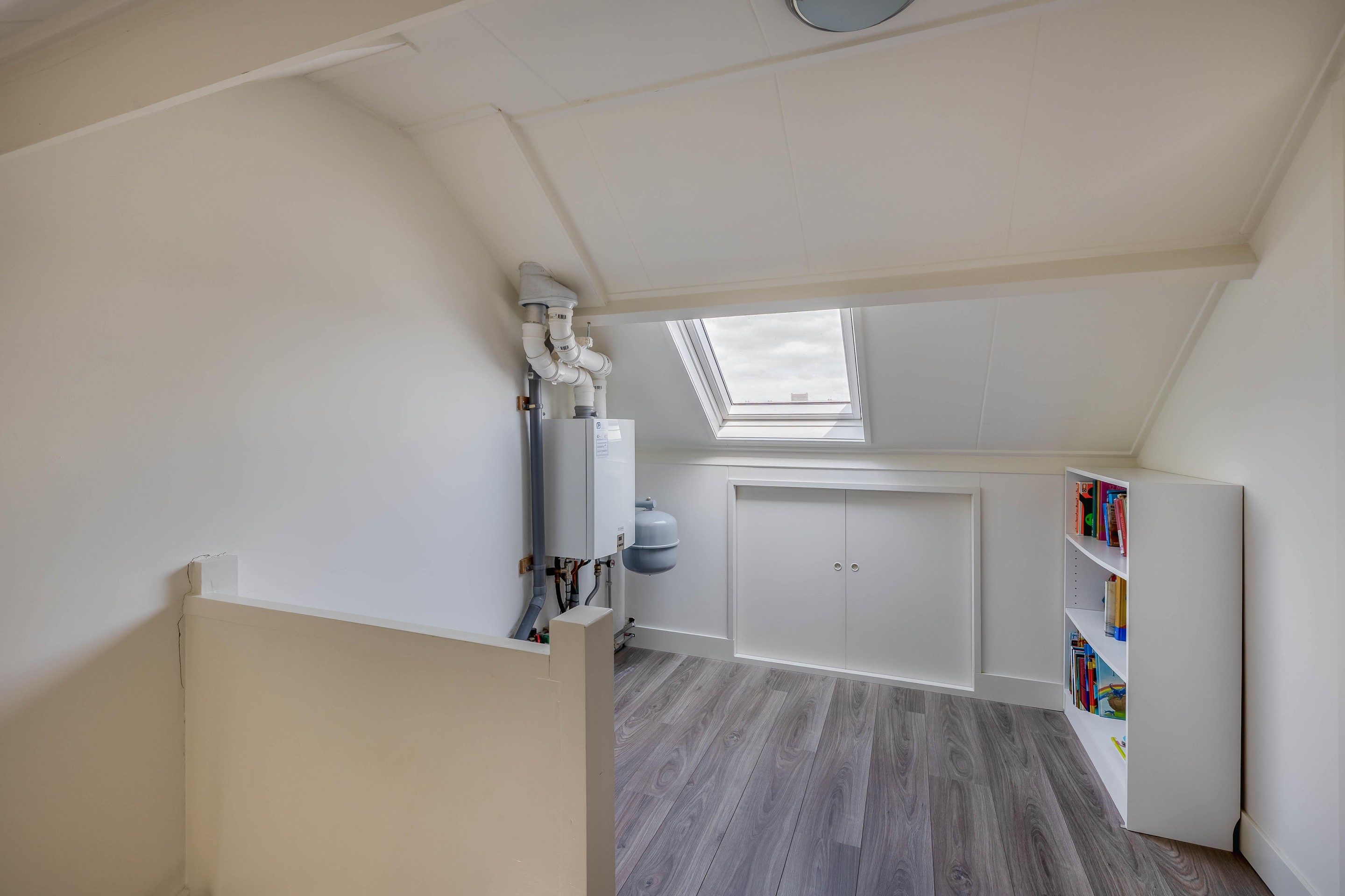 Via een vaste en gestoffeerde trap kom je op de overloop. Deze is voorzien van een laminaatvloer en de wanden zijn glad gesausd. Onder de schuine kap van het woonhuis zijn handige bergruimtes gemaakt. Verder is er een Velux-dakraam gemonteerd en vind je hier de opstelplaats van de Remeha Avanta HR cv-ketel.