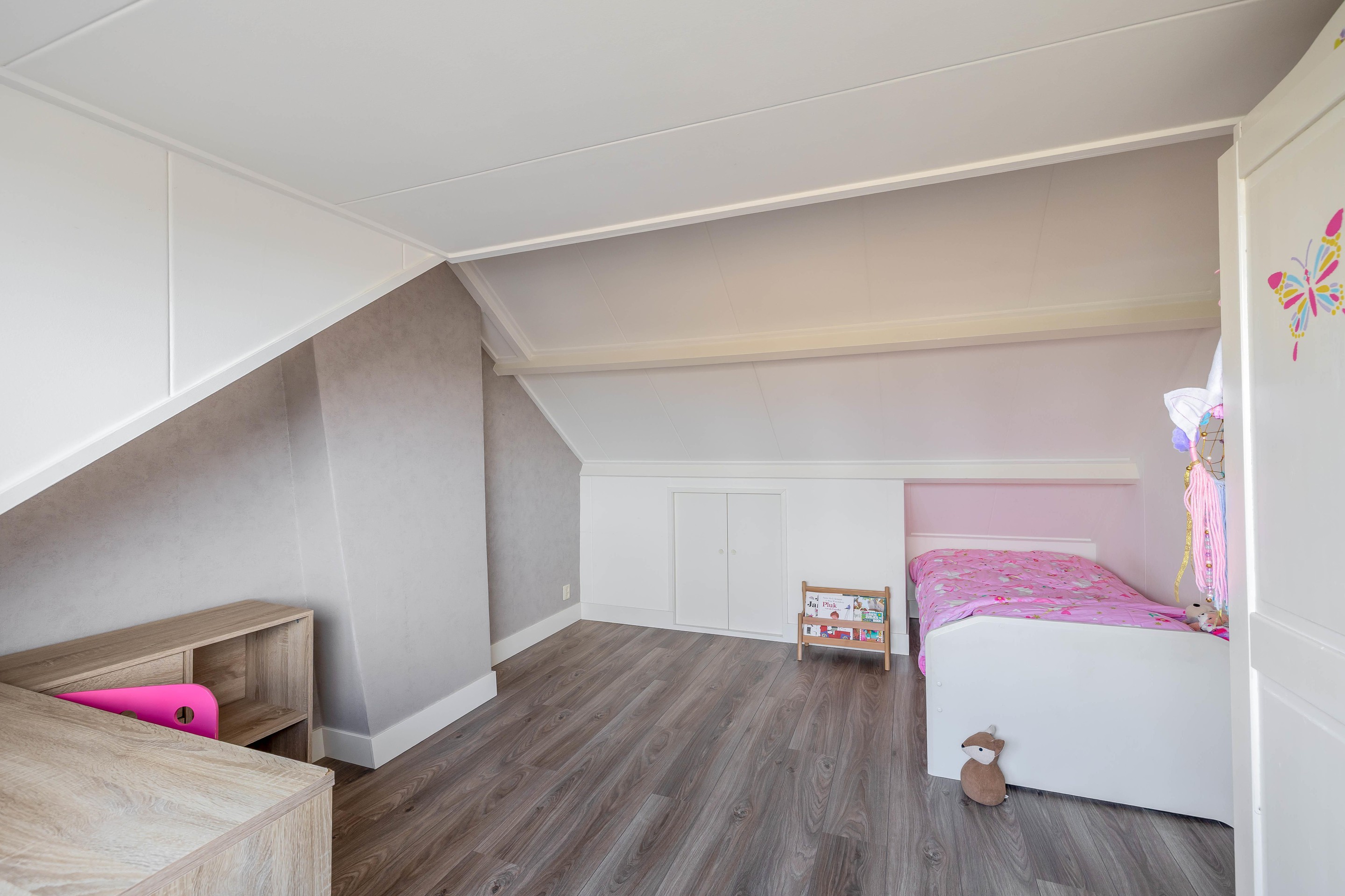 De slaapkamer met bergruimte achter de knieschotten heeft de volledige diepte van het huis en is voorzien van een dakkapel. De oppervlakte van deze kamer is riant en ook de afwerking is weer dik voor elkaar. Het dak van de zolder is bovendien geïsoleerd.