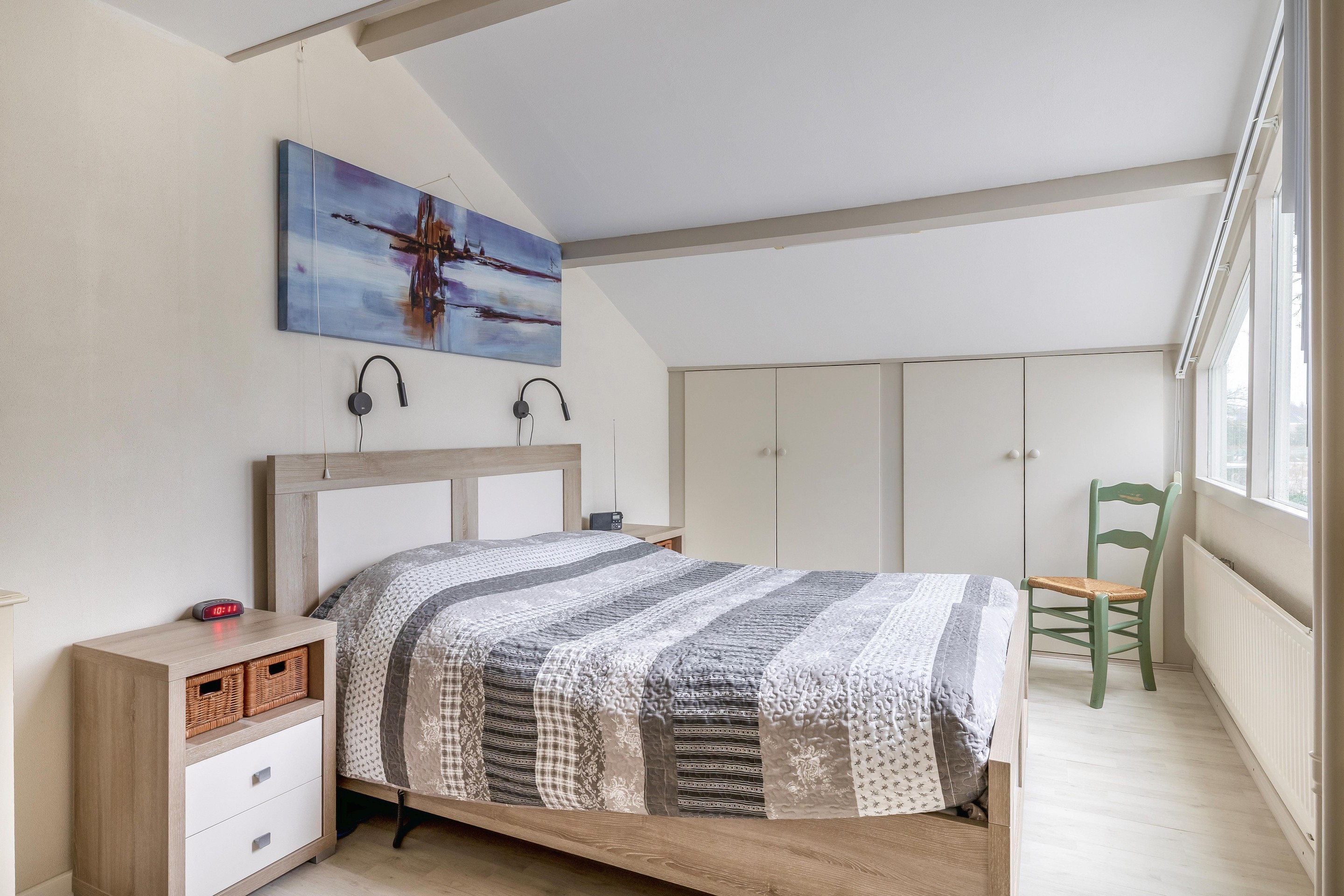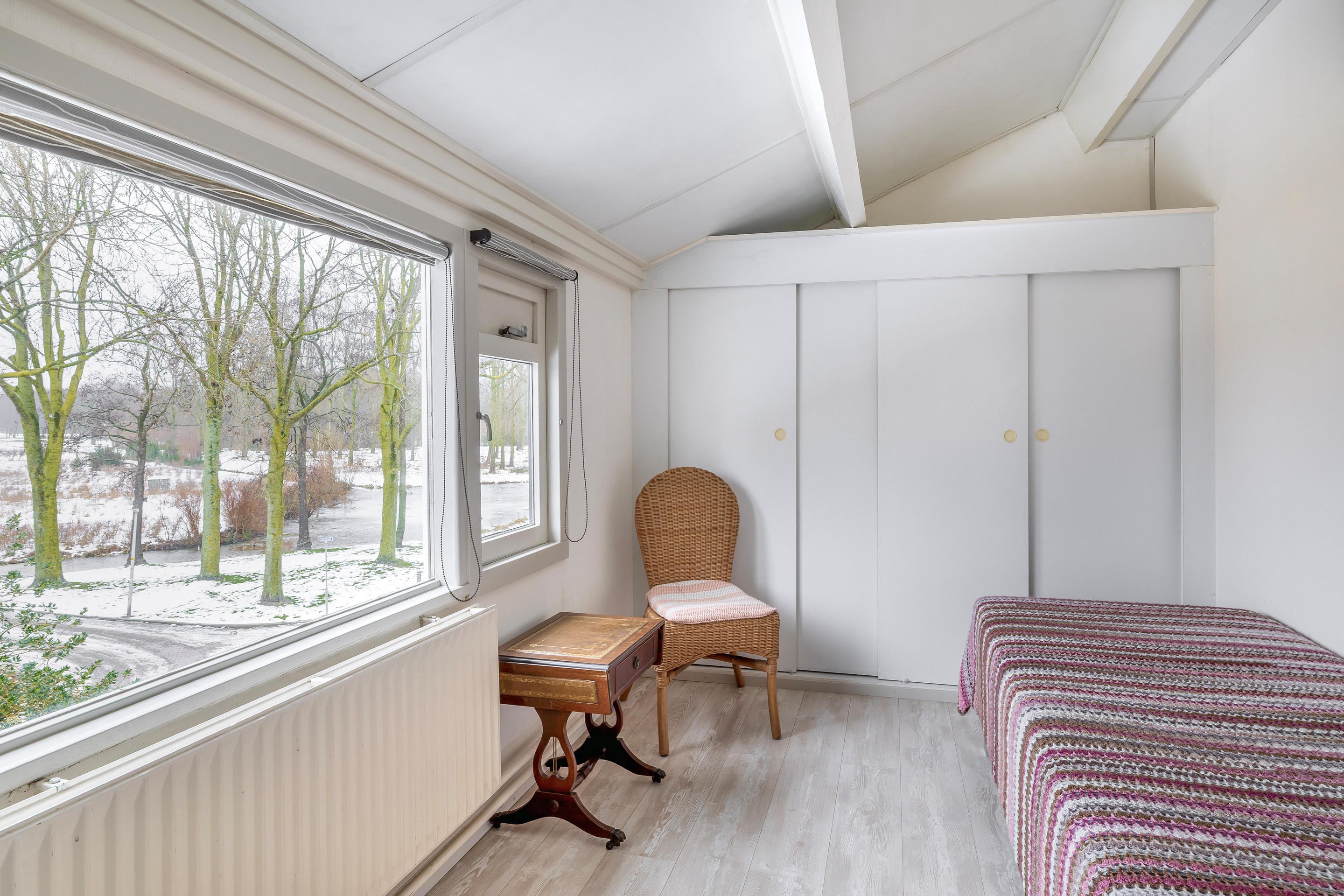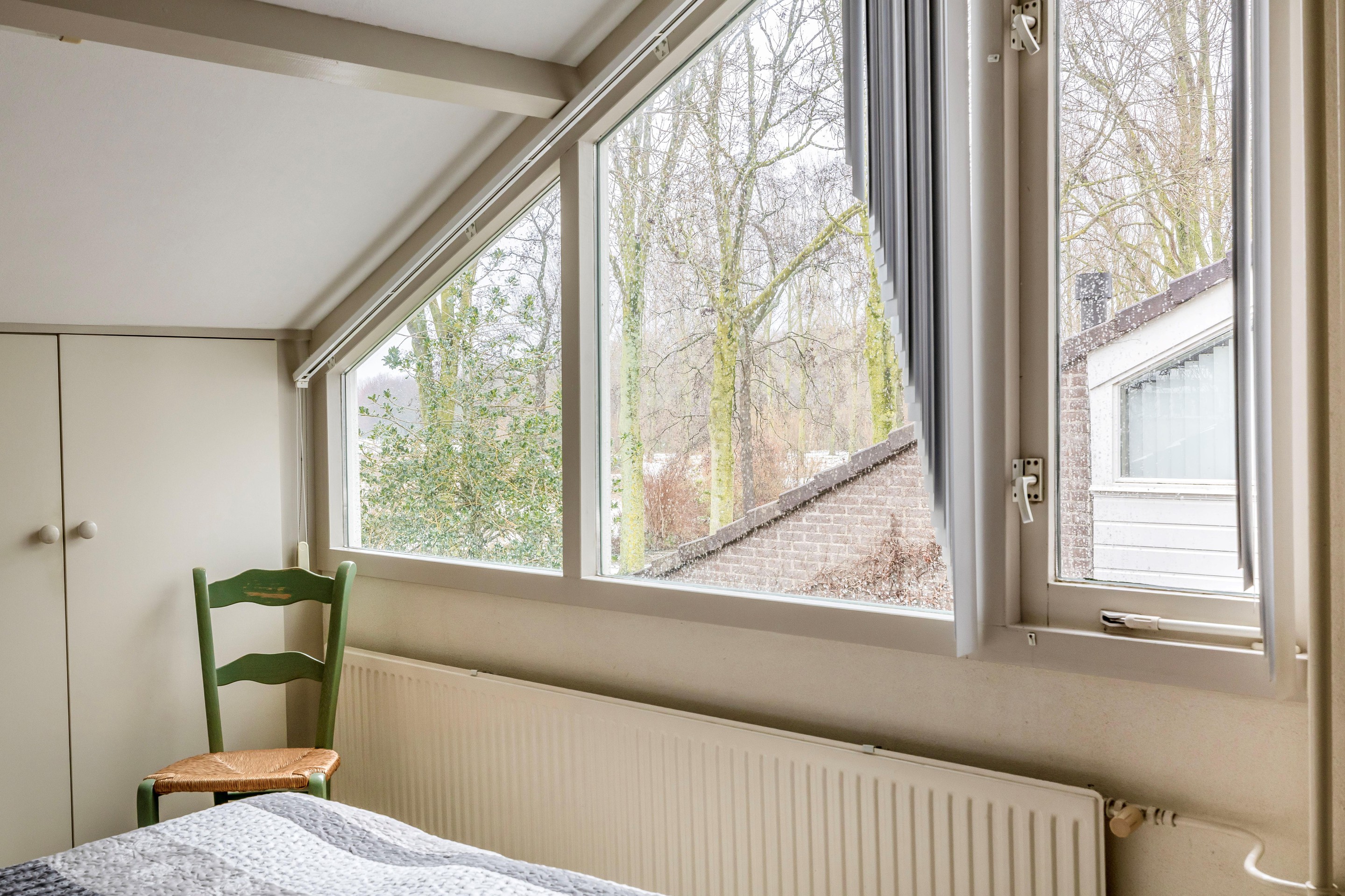 Tweede verdieping Deze verdieping is bereikbaar via een vaste trap en beschikt over een overloop en nog eens twee slaapkamers. Dankzij de dakopbouw aan de achterzijde is hier verrassend veel ruimte ontstaan. De slaapkamer aan de voorzijde biedt een geweldig uitzicht over het Gouwebos en de omgeving. In deze kamer bevindt zich tevens een vaste kast met de opstelling voor de cv-installatie. Hier is ook nog een tweede aansluiting voor de wasmachine en droger. Naast deze kast is er volop extra bergruimte aanwezig, evenals achter de knieschotten onder de schuine zijde in de achtergelegen slaapkamer.