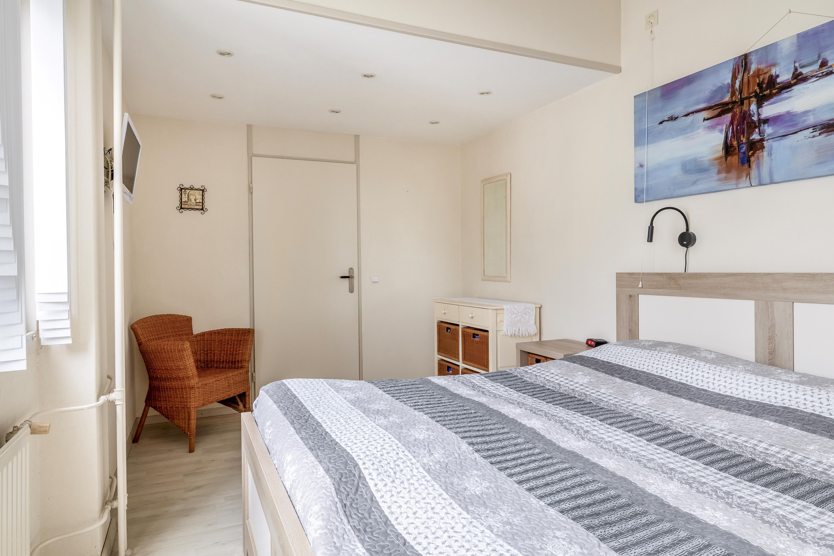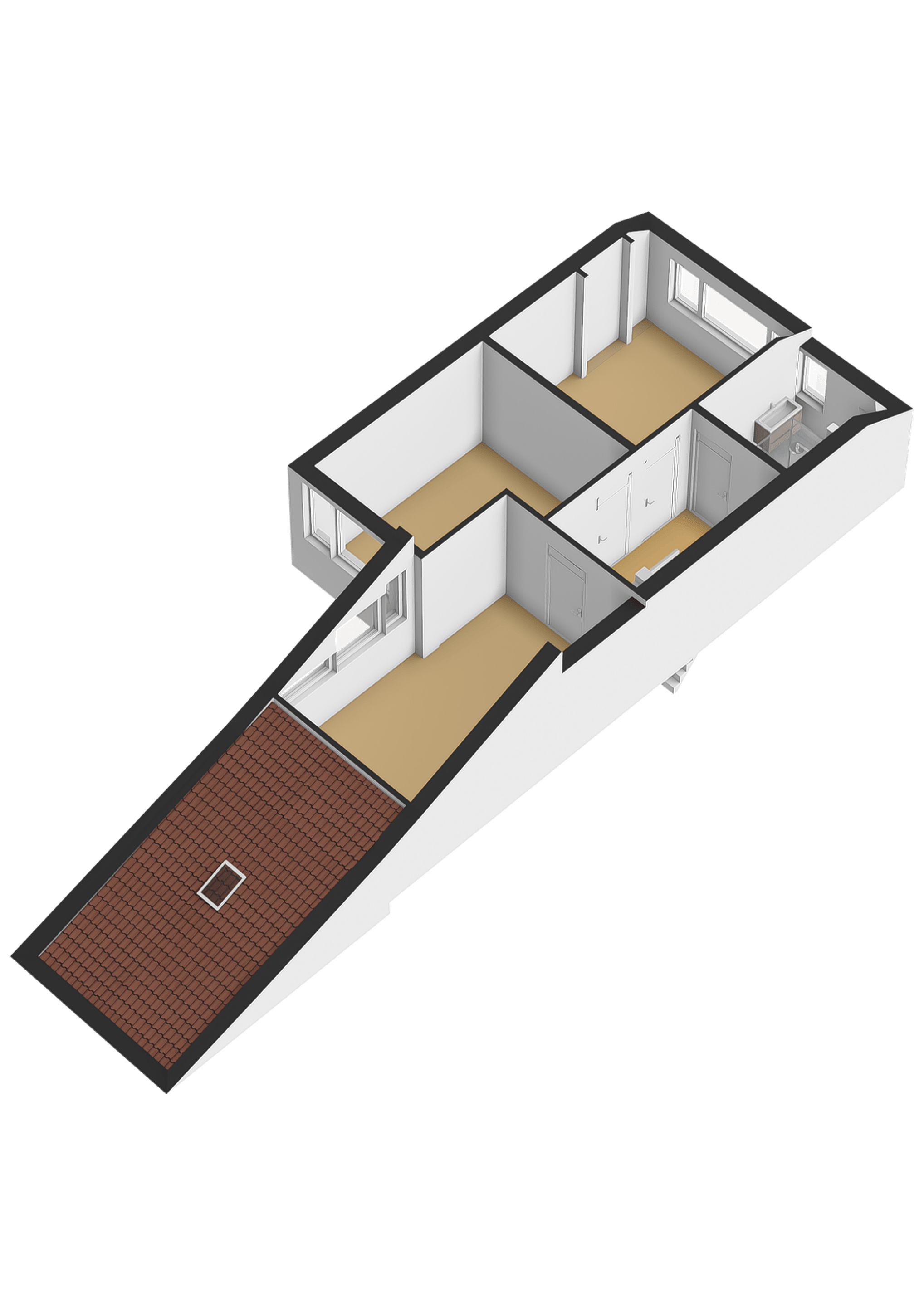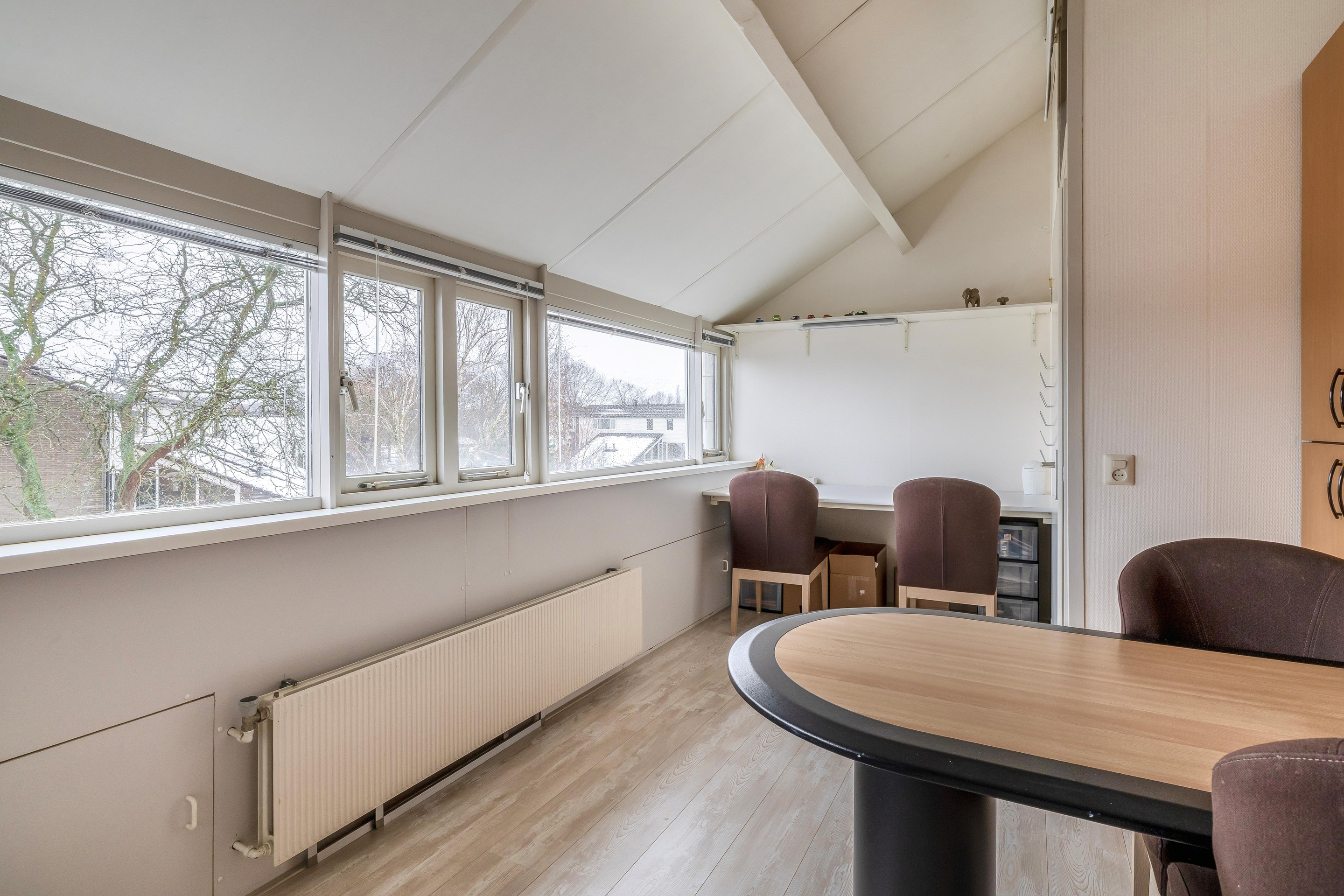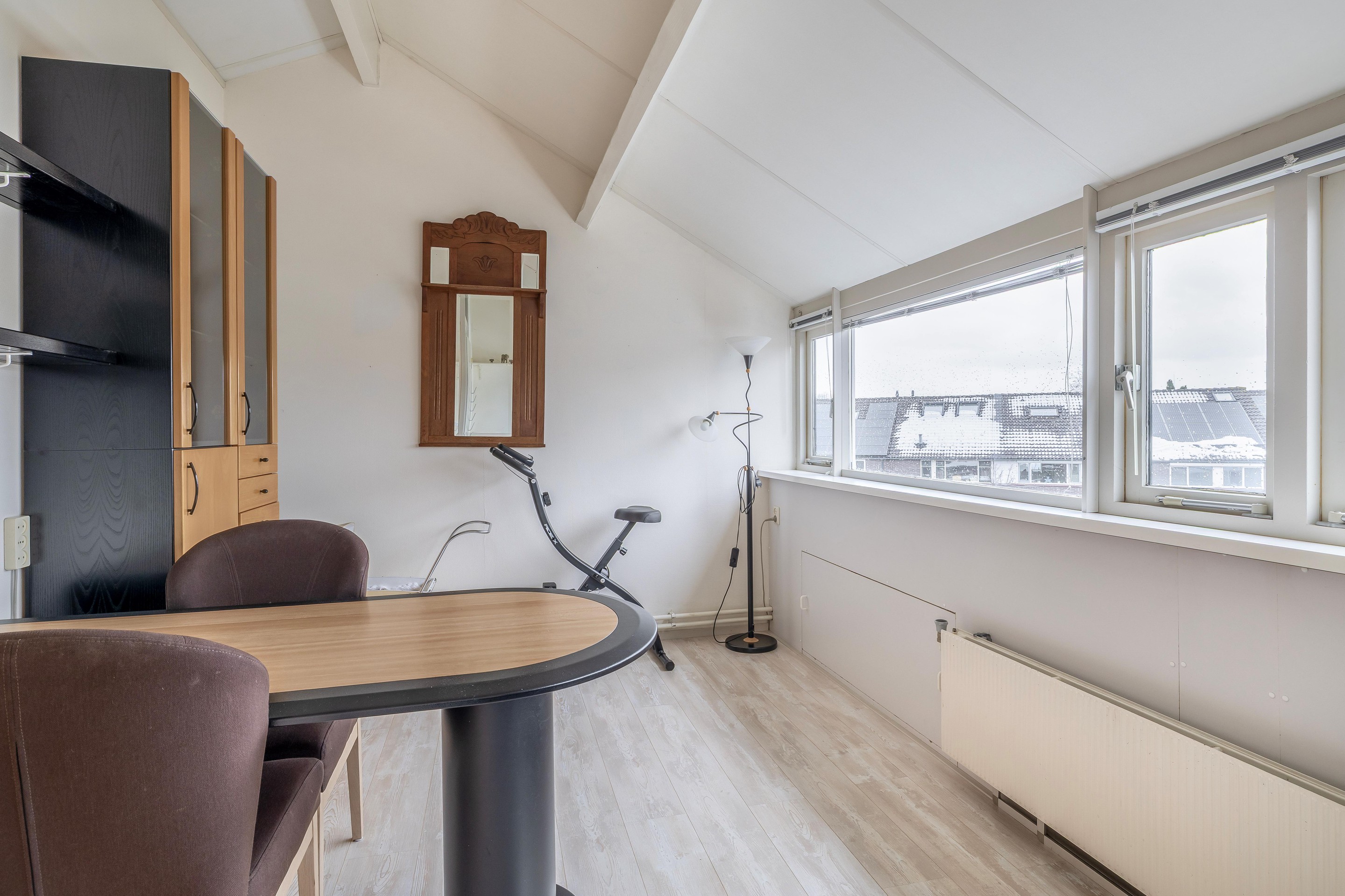 Tweede verdieping Deze verdieping is bereikbaar via een vaste trap en beschikt over een overloop en nog eens twee slaapkamers. Dankzij de dakopbouw aan de achterzijde is hier verrassend veel ruimte ontstaan. De slaapkamer aan de voorzijde biedt een geweldig uitzicht over het Gouwebos en de omgeving. In deze kamer bevindt zich tevens een vaste kast met de opstelling voor de cv-installatie. Hier is ook nog een tweede aansluiting voor de wasmachine en droger. Naast deze kast is er volop extra bergruimte aanwezig, evenals achter de knieschotten onder de schuine zijde in de achtergelegen slaapkamer.