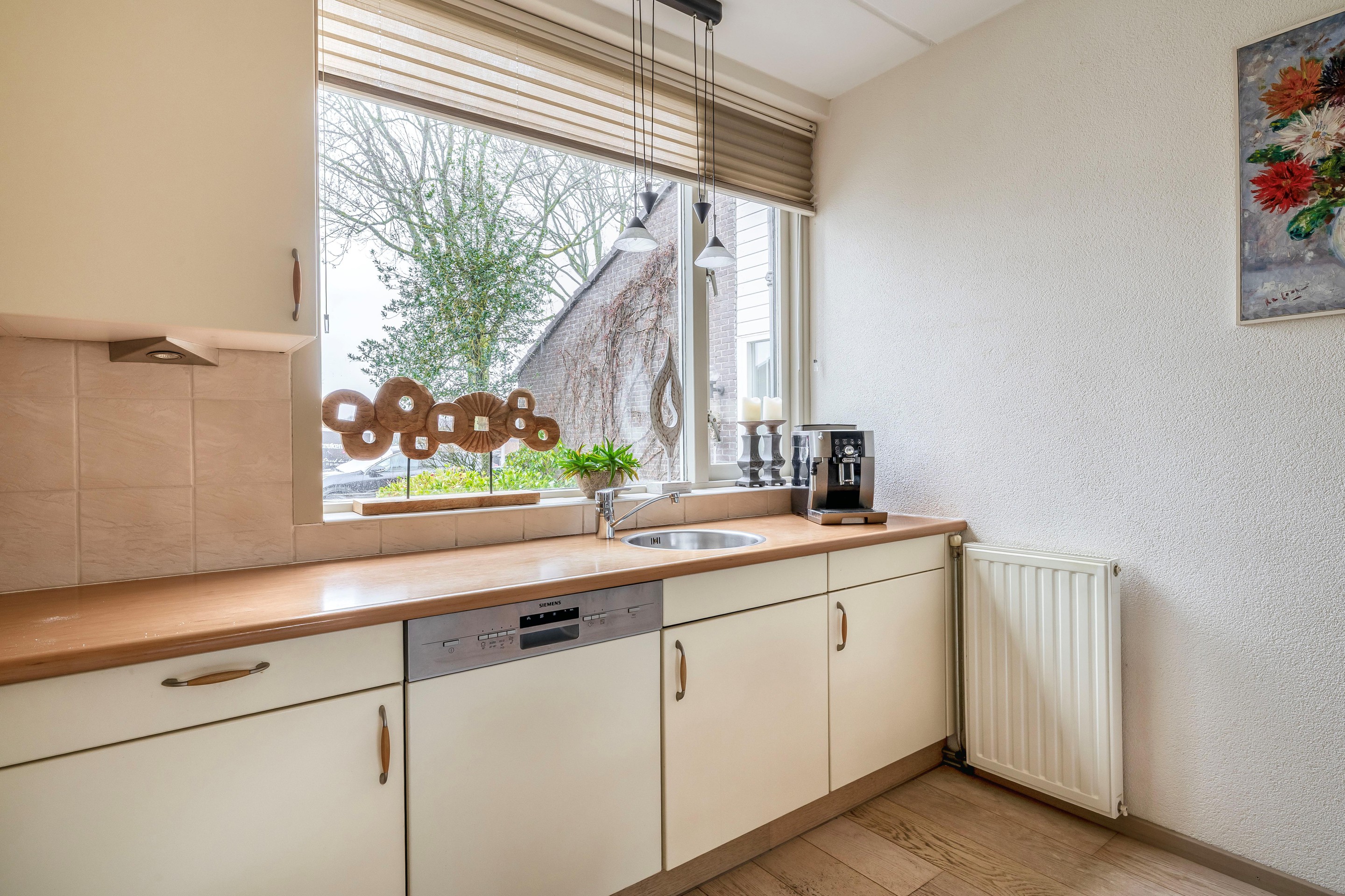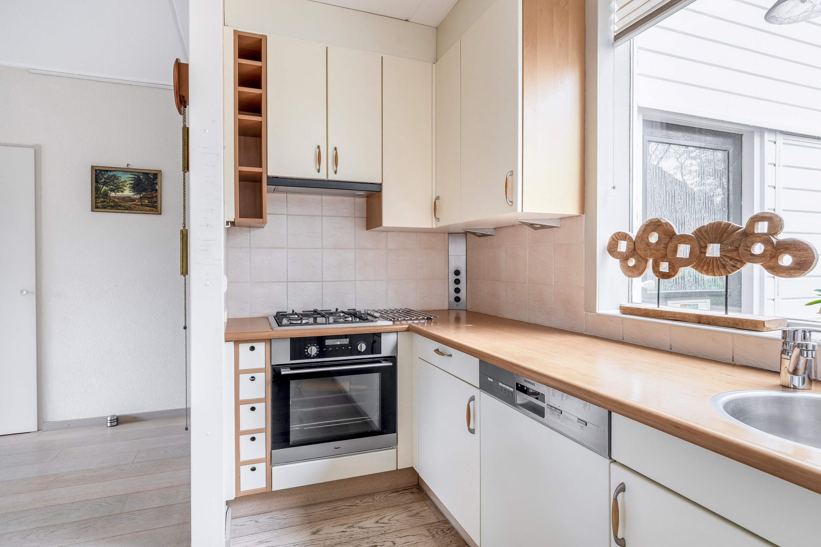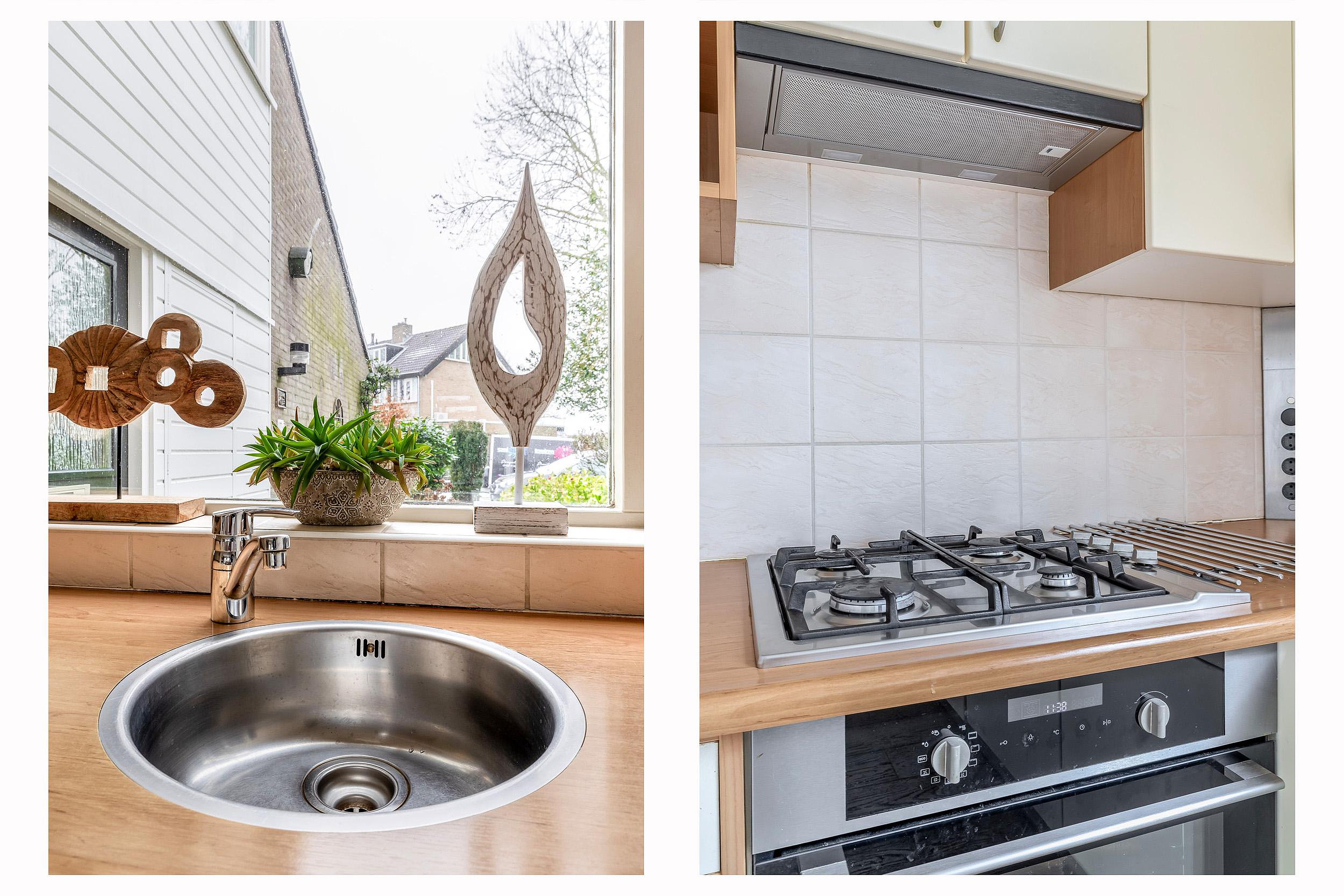 De ruime, tuingerichte woonkamer geniet van veel natuurlijke lichtinval dankzij de grote raampartijen. Via een openslaande deur stapt u zo de achtertuin in. De vloer is afgewerkt met een lichte laminaatvloer en onder de trap bevindt zich een royale bergkast. De keuken is aan de voorzijde gesitueerd en biedt door het grote raam een vrij uitzicht. De keuken is uitgerust met een vaatwasser, kookplaat, afzuigkap, koelkast en oven, afgewerkt met een aanrechtblad in houtnerfstructuur.