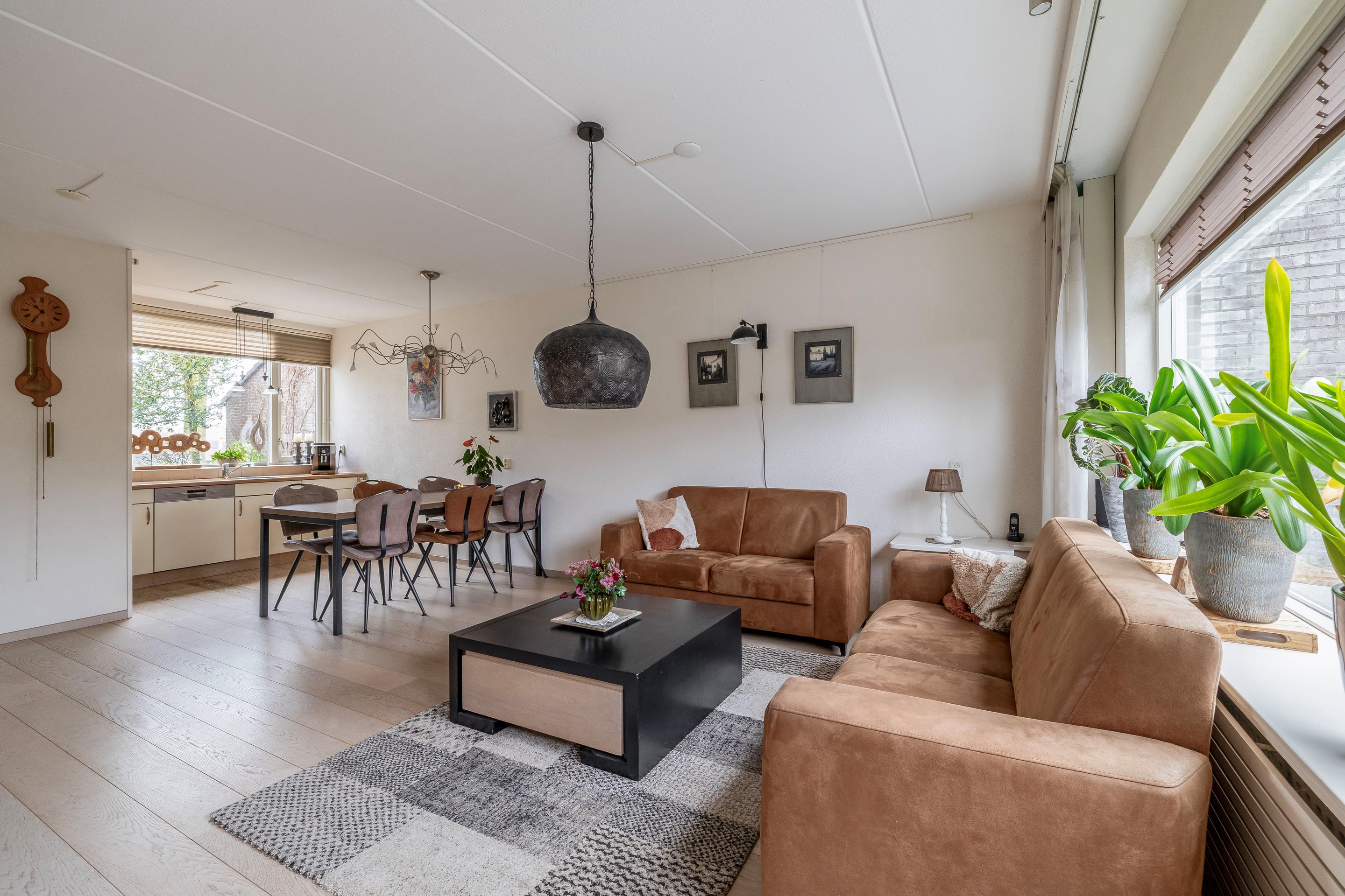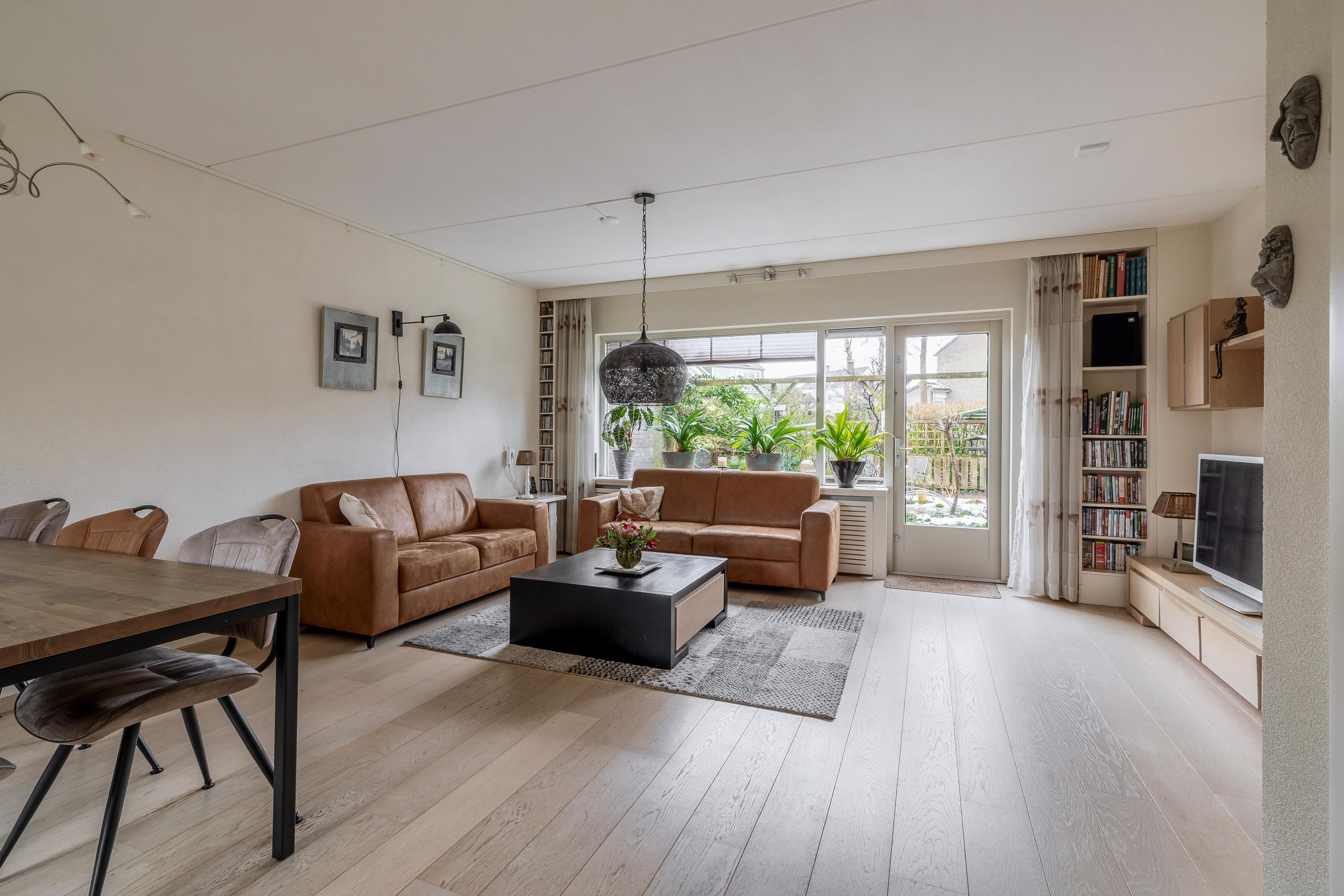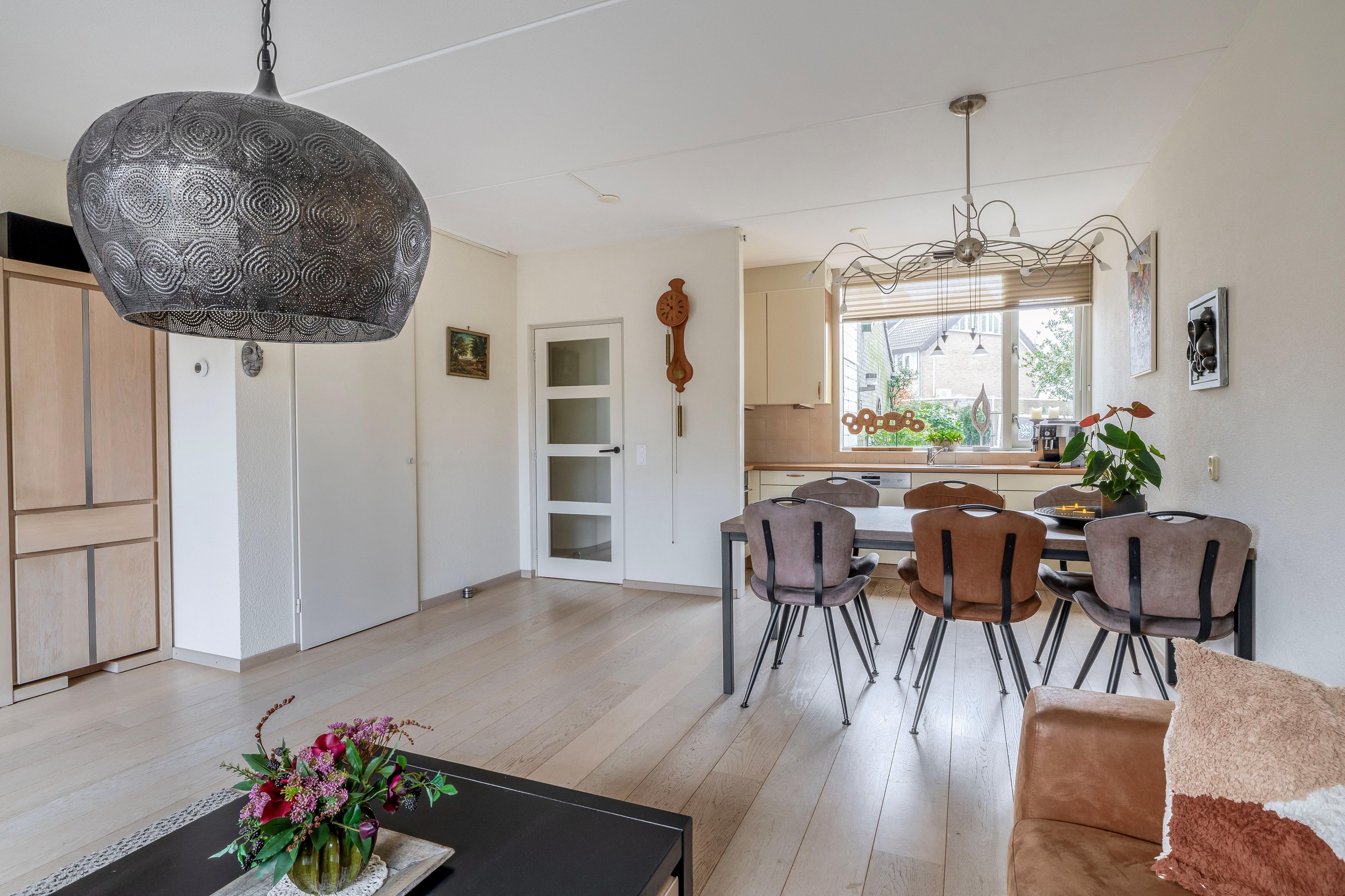 De ruime, tuingerichte woonkamer geniet van veel natuurlijke lichtinval dankzij de grote raampartijen. Via een openslaande deur stapt u zo de achtertuin in. De vloer is afgewerkt met een lichte laminaatvloer en onder de trap bevindt zich een royale bergkast. De keuken is aan de voorzijde gesitueerd en biedt door het grote raam een vrij uitzicht. De keuken is uitgerust met een vaatwasser, kookplaat, afzuigkap, koelkast en oven, afgewerkt met een aanrechtblad in houtnerfstructuur.