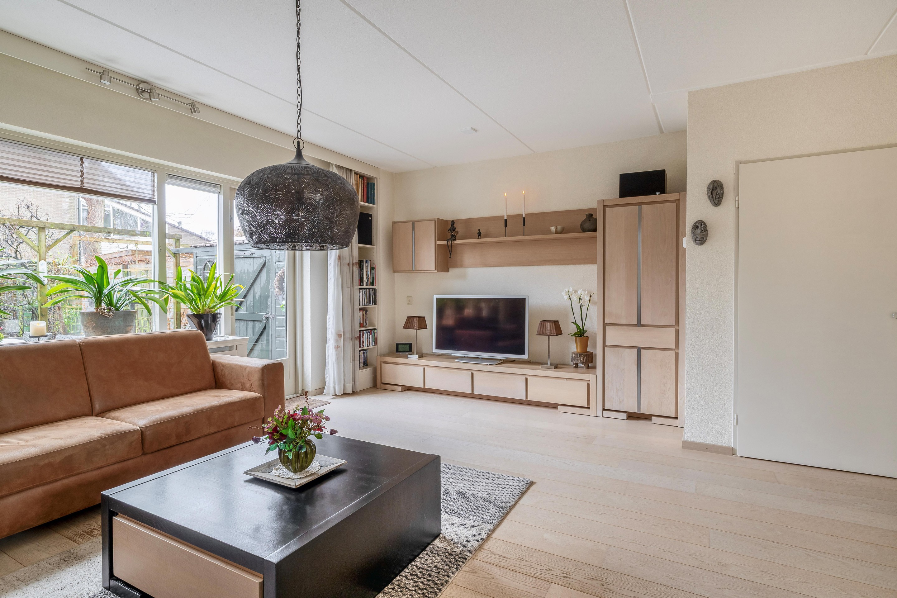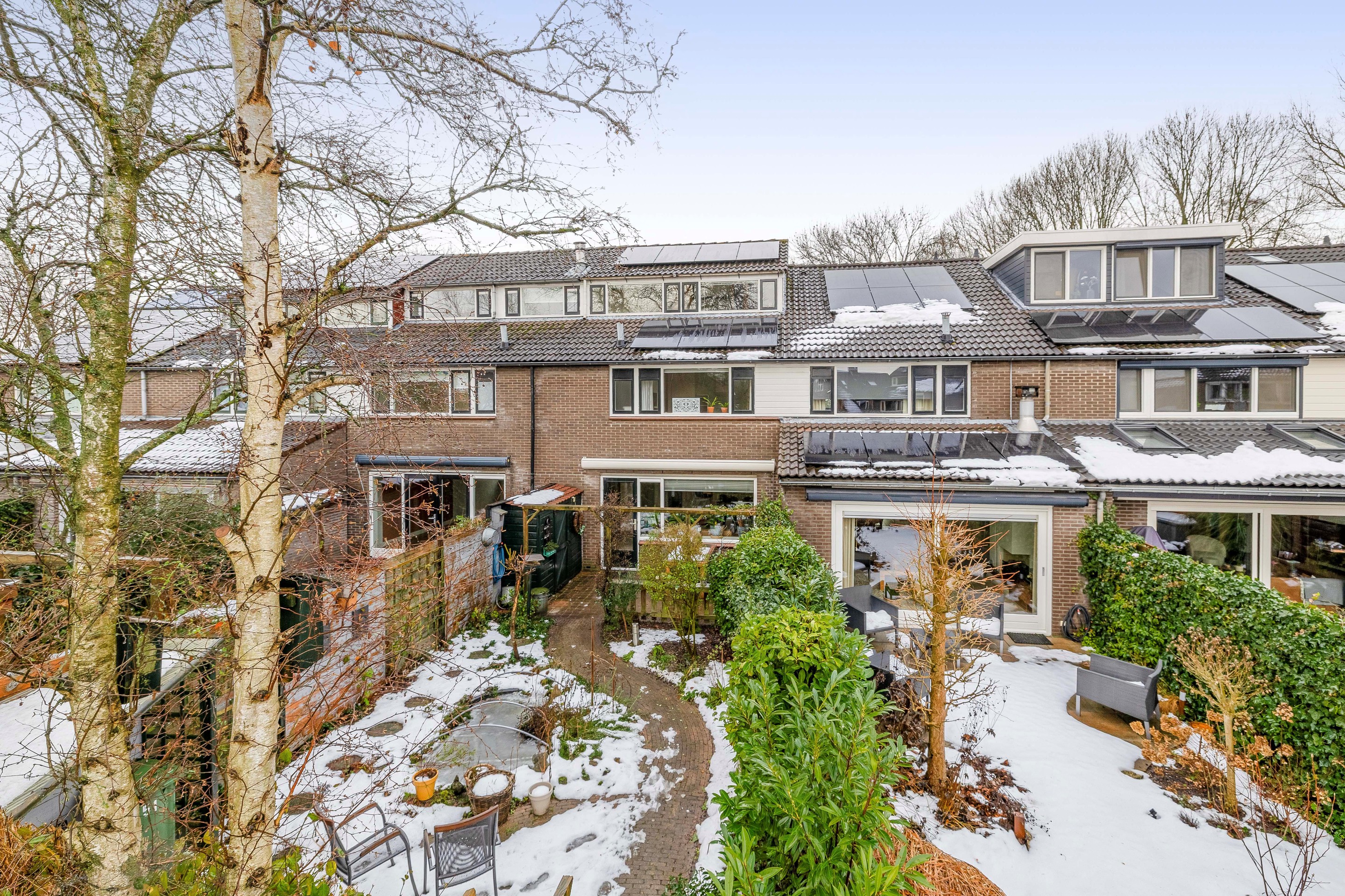De zonnige achtertuin is speels vormgegeven met groenblijvende heesters en planten, en biedt volop ruimte voor diverse zithoeken. Door de gunstige ligging geniet u hier van de ochtend tot laat in de middag van de zon. Aan de achtergevel is een zonnescherm gemonteerd.